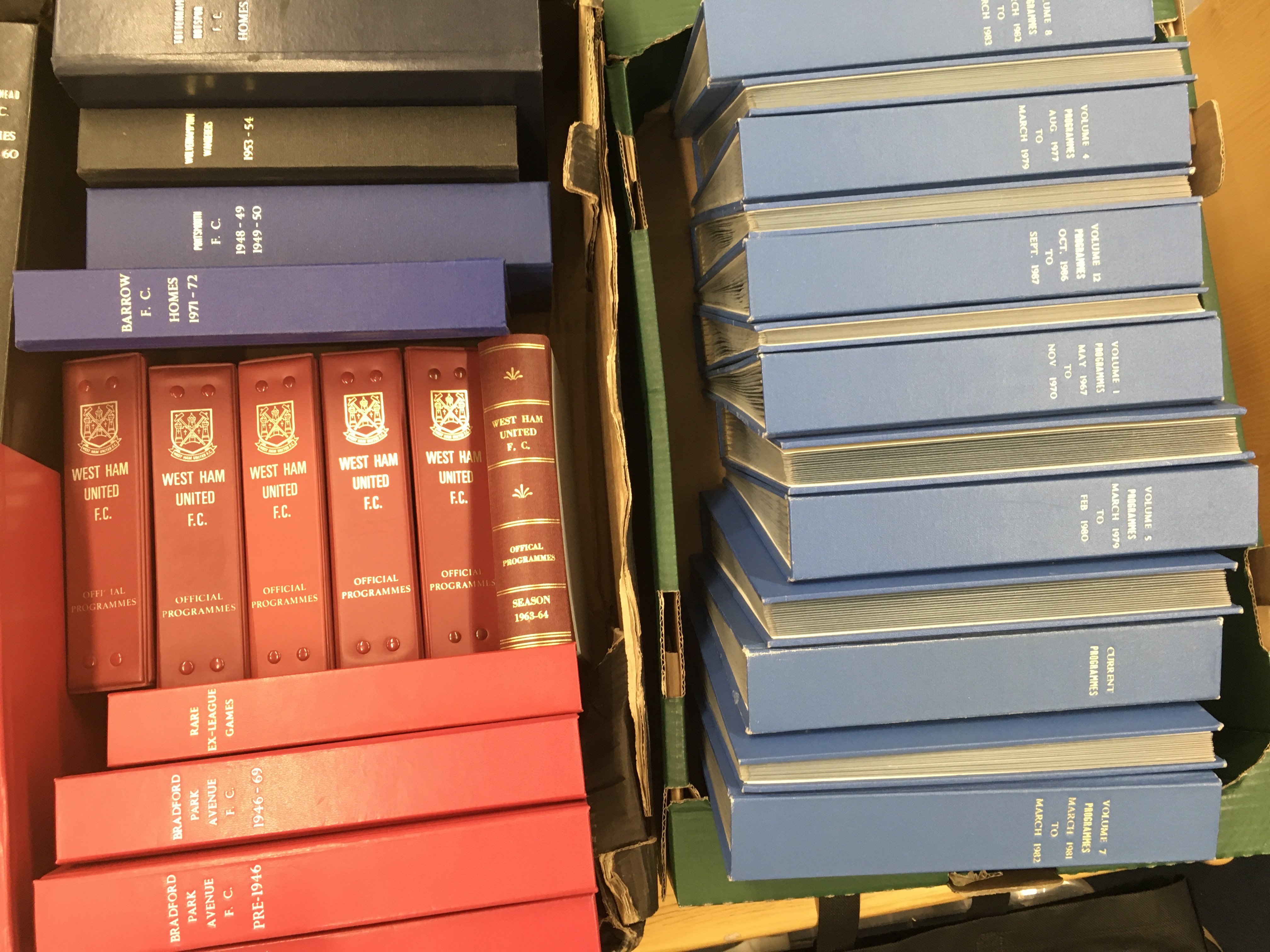 Football Programme Binders: 24 are DJ Bookbinders with various titles to spine. A further 6 are official West Ham binders from the 60s and 70s. 2 boxes. (30)