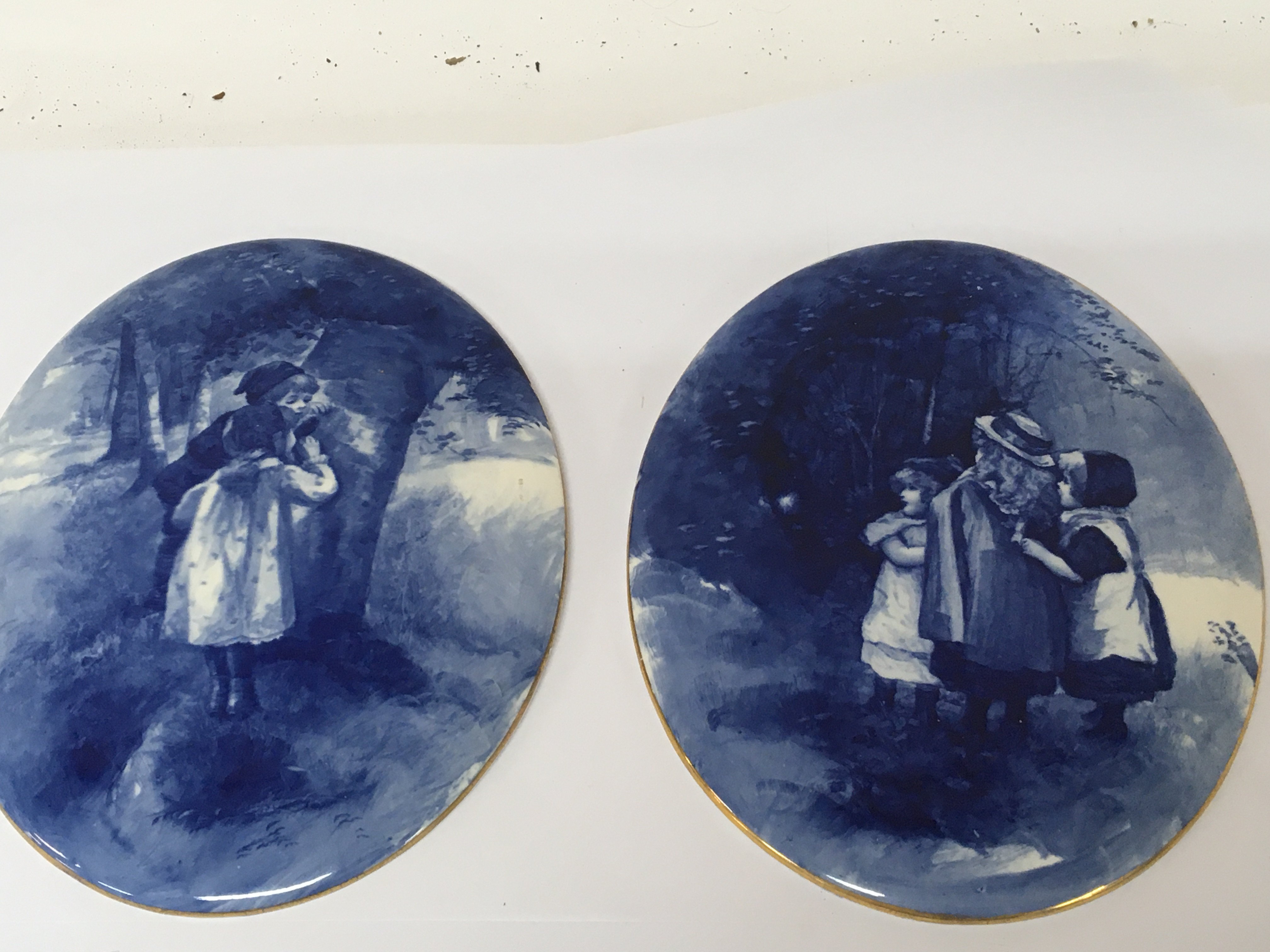 A pair of quality Doulton Burslem blue and white oval wall plaques decorated with figures of young children in a wooded landscape no obvious damage 24cm.