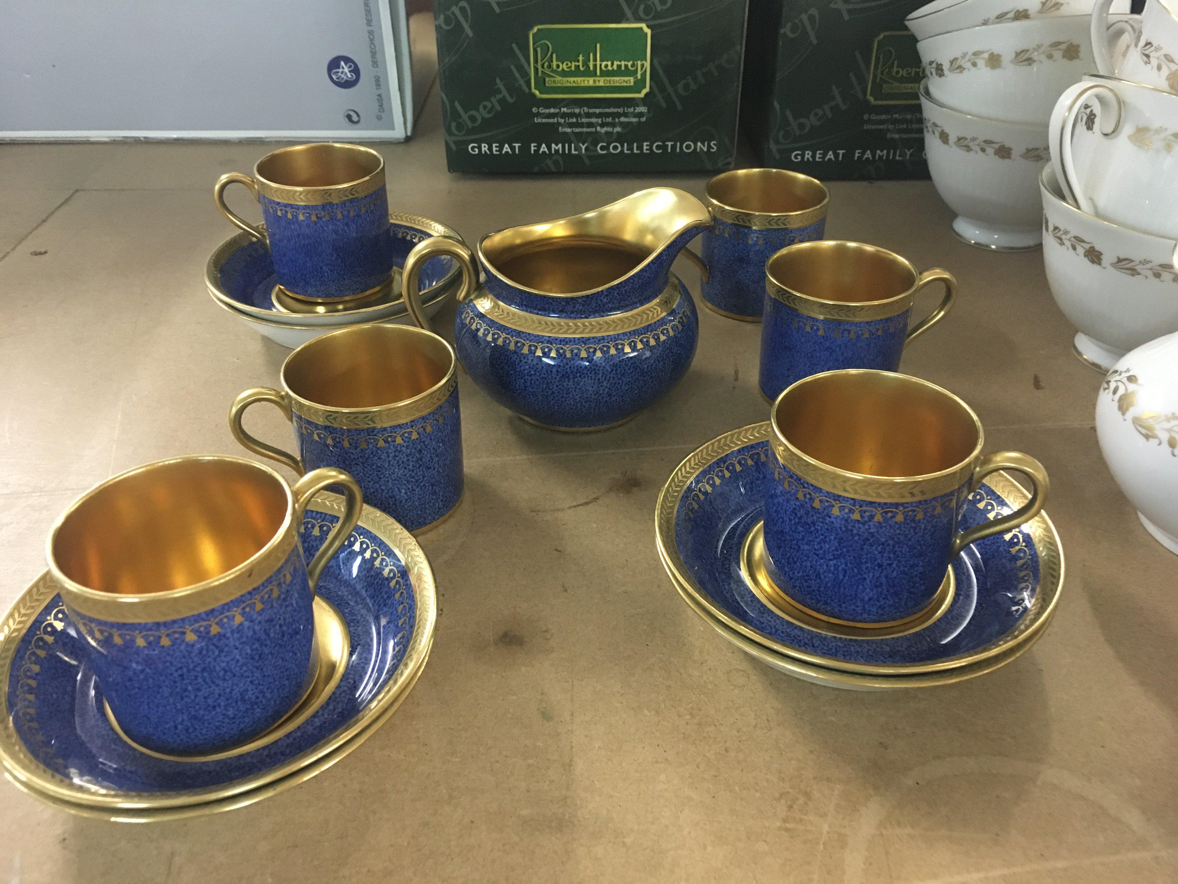 A cauldron blue ground coffee set with applied gilt work . Comprising cups saucers and milk jug .