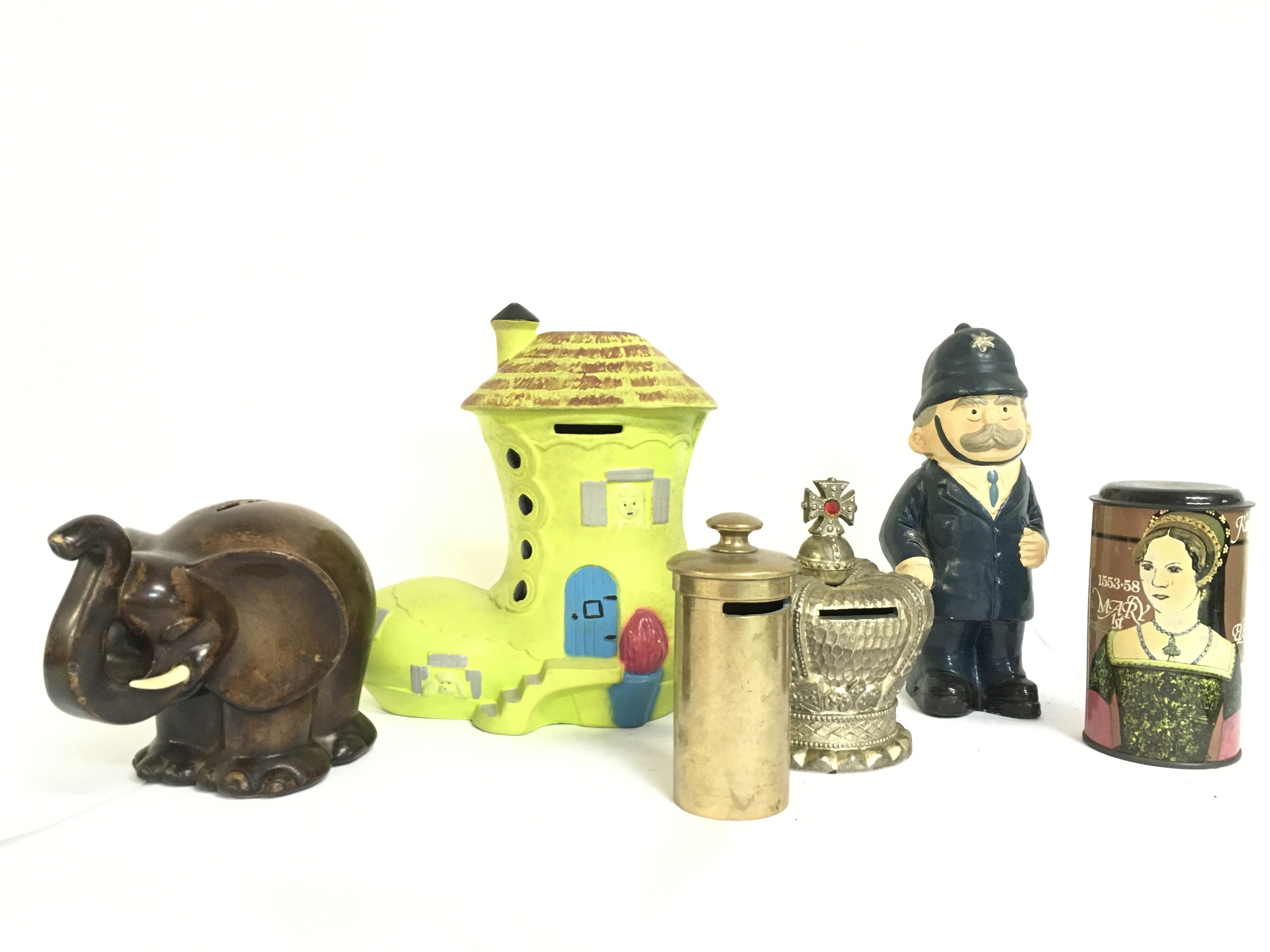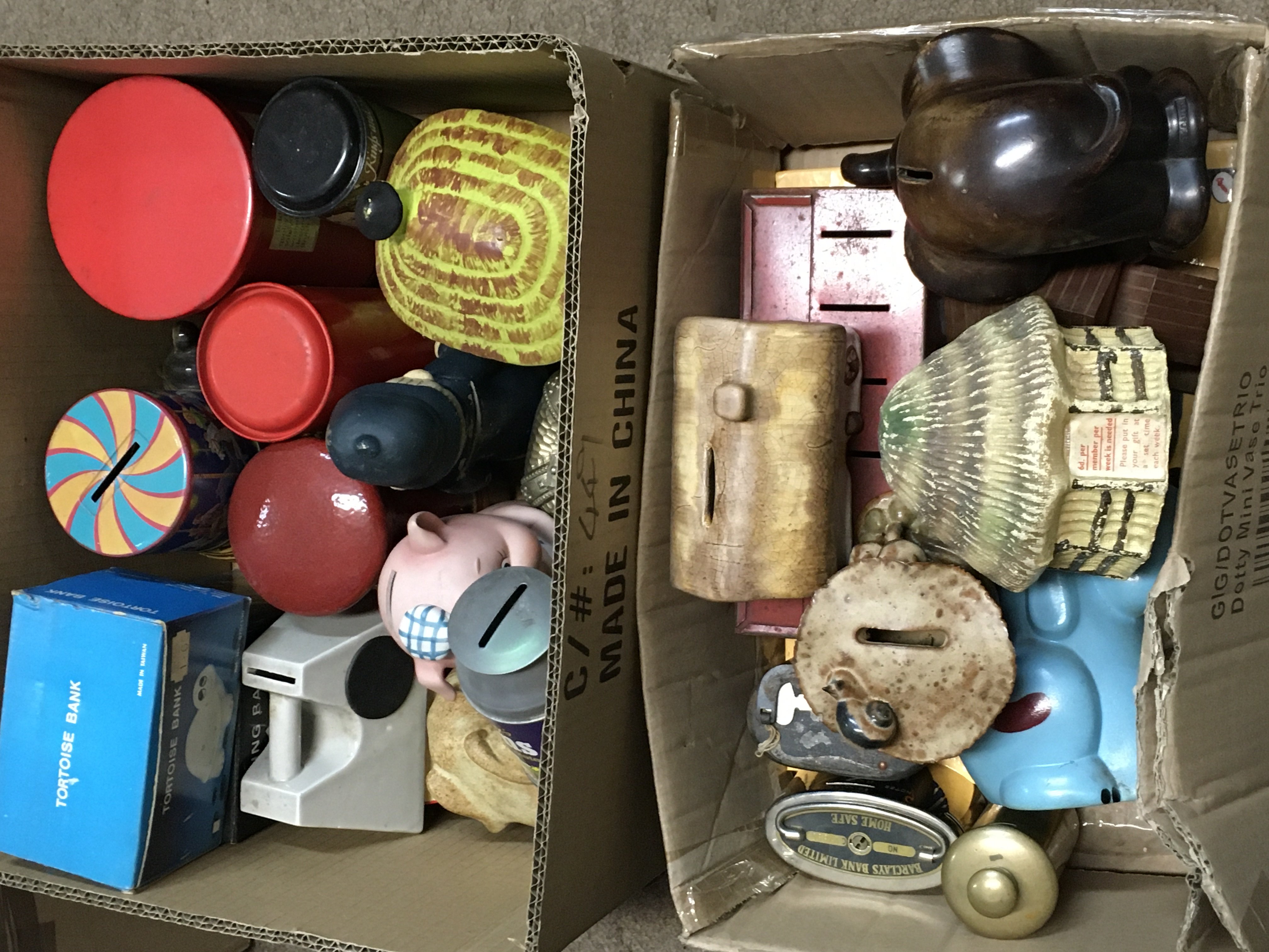 A collection of vintage porcelain and tin money boxes. Postage category C