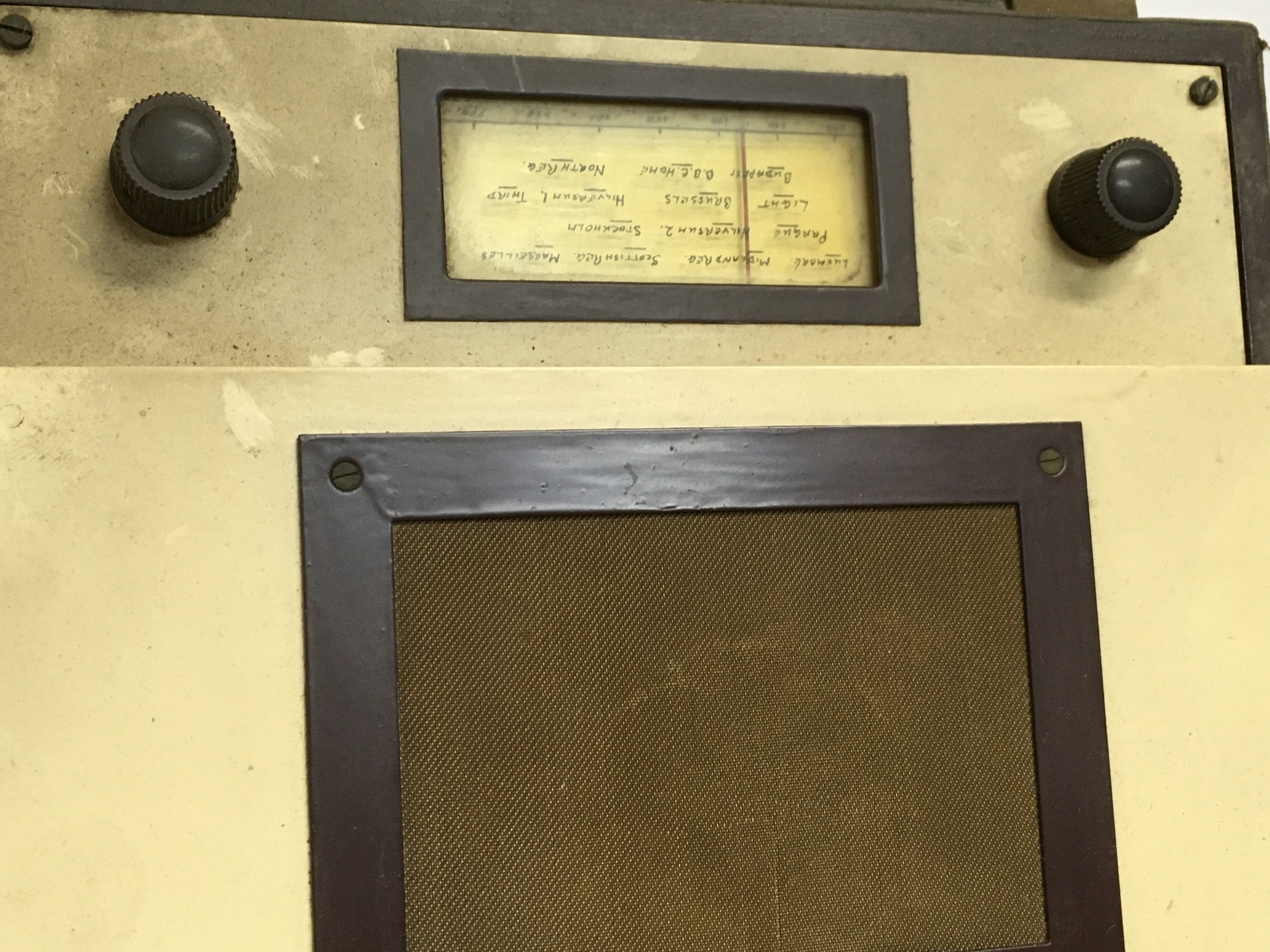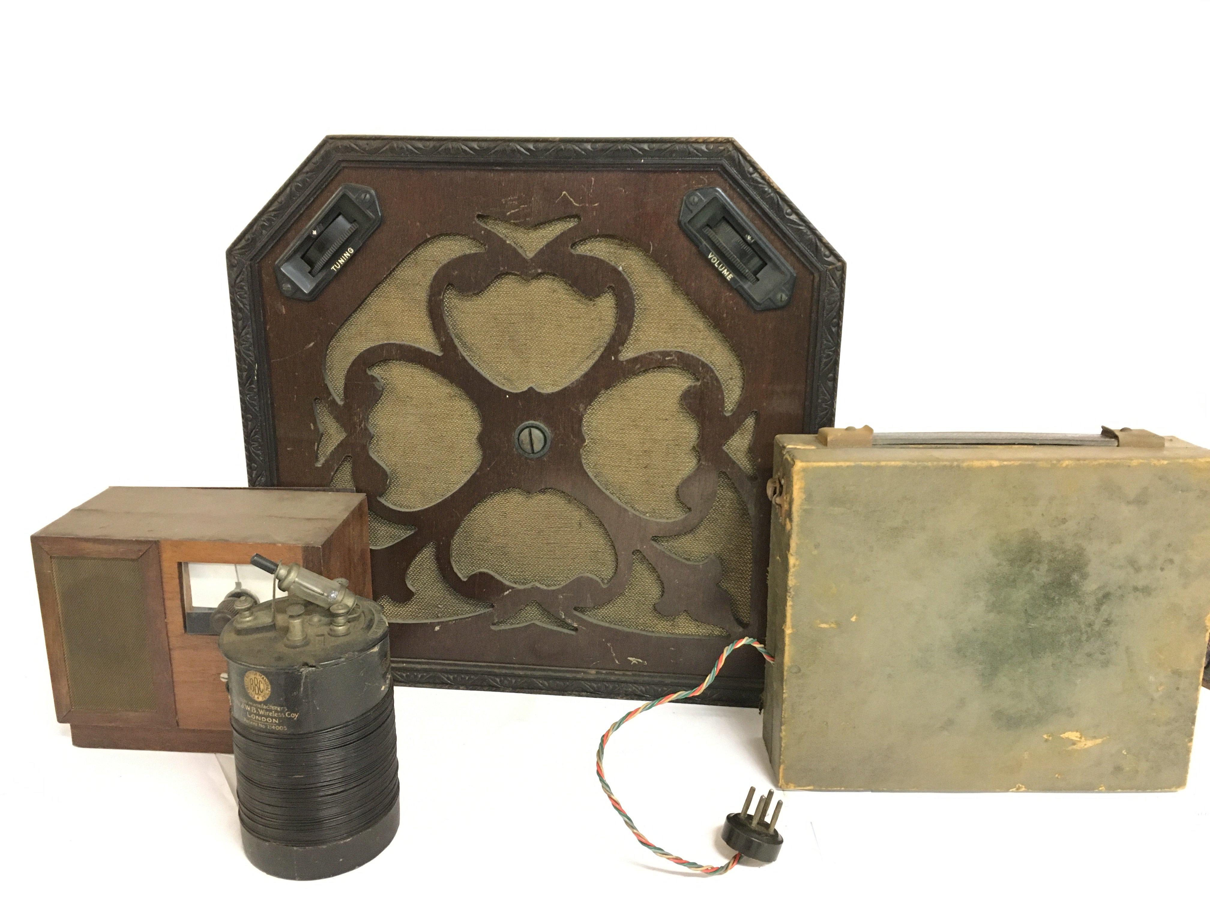 A collection of vintage radios including The Brownie Crystal Wireless Receiver and a Umello radio.