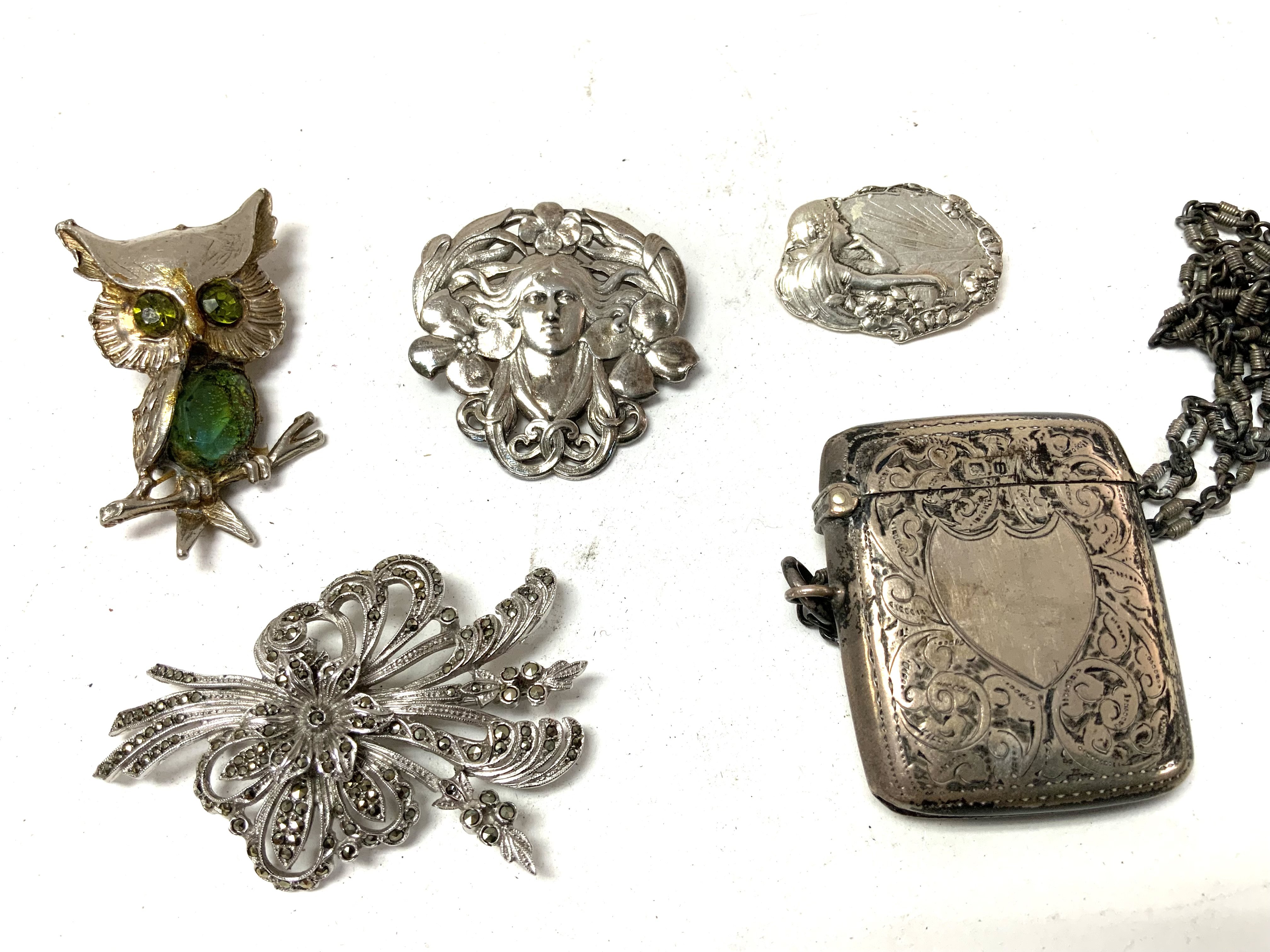 3 vintage silver brooches, hallmarked vesta case etc. (A)
