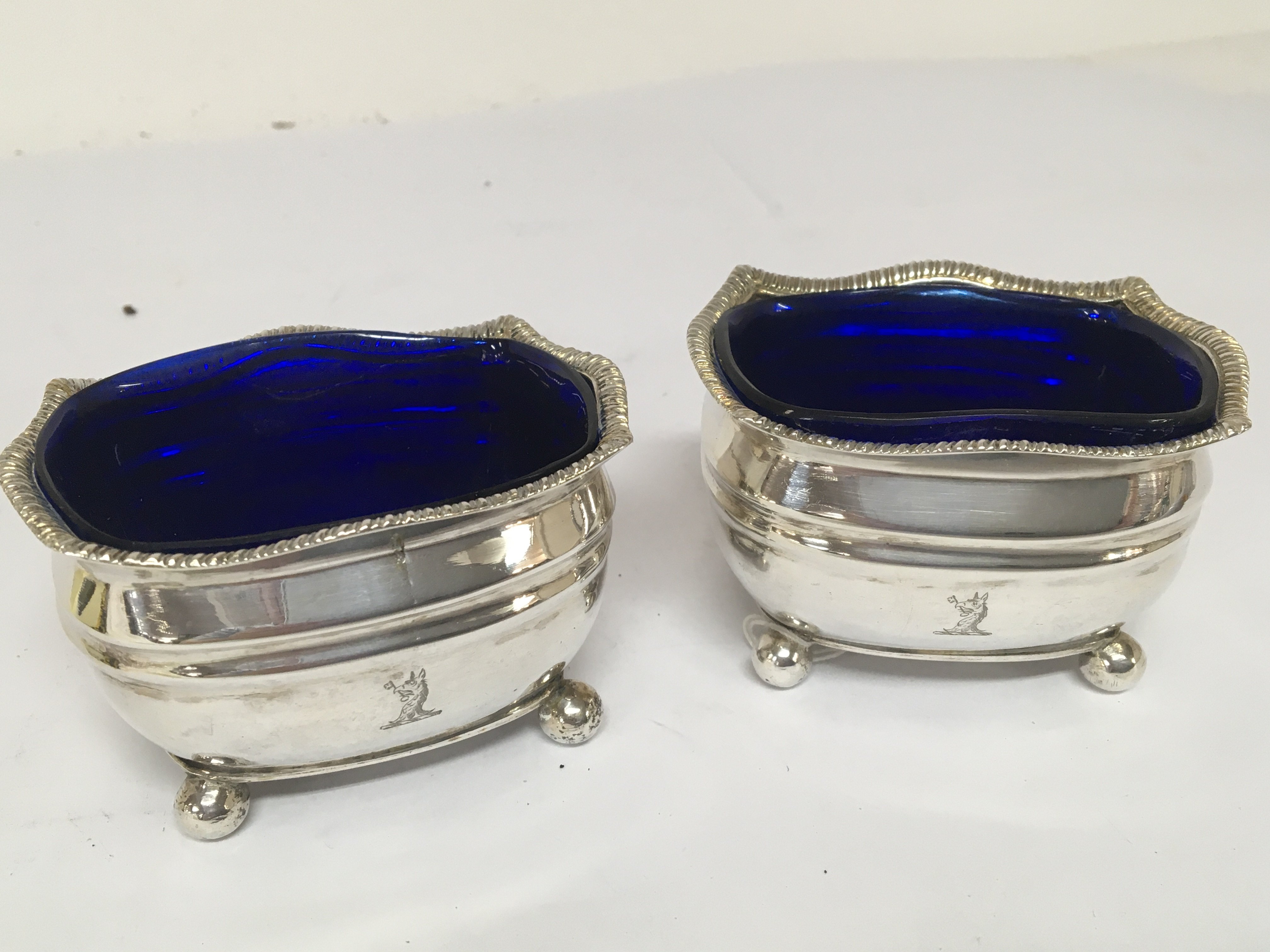 A pair of George III silver salt cellars with blue glass liners and ball feet London 1807 hallmarks nice condition.
