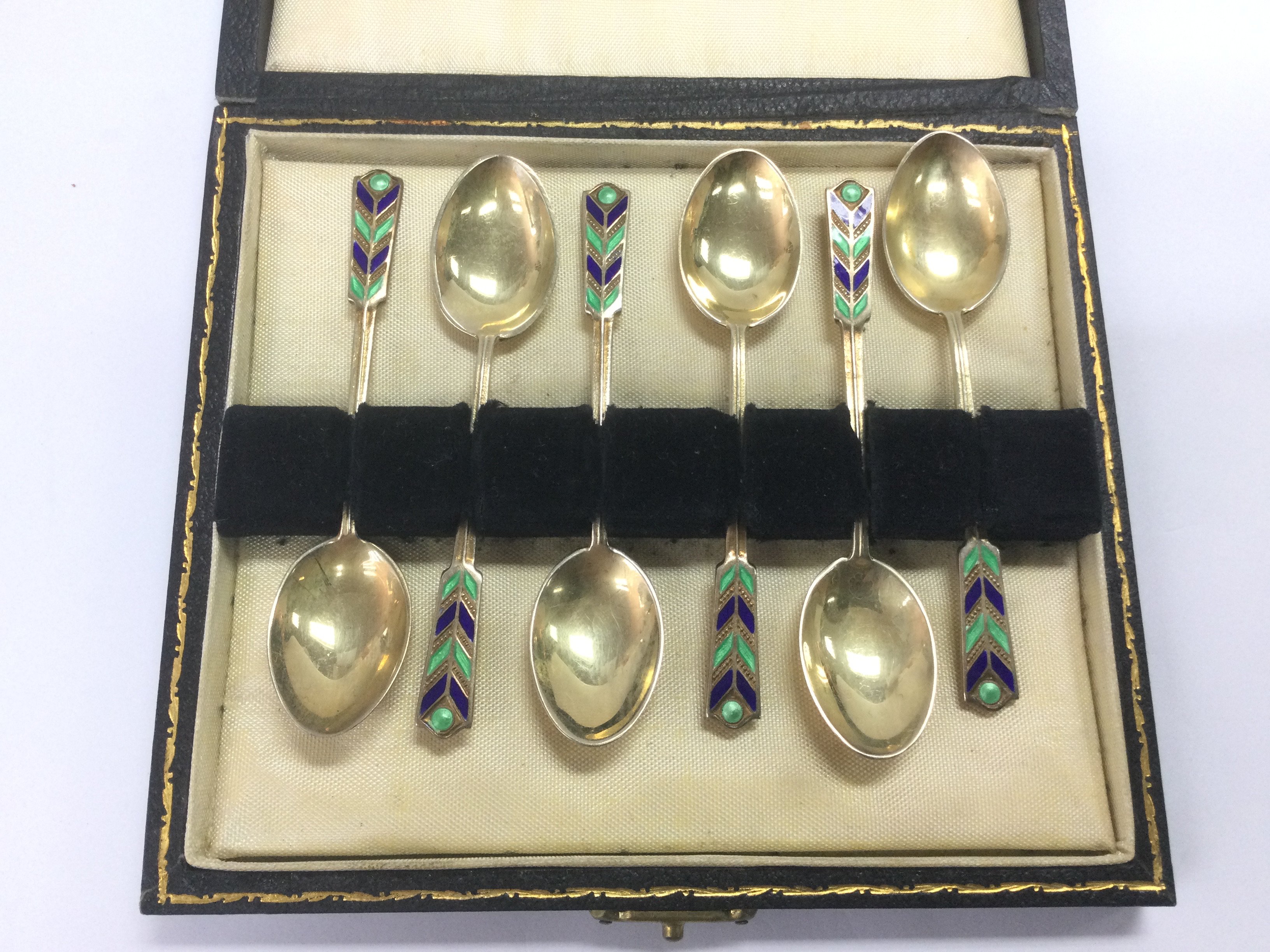 A cased set of six silver and enamelled tea spoons. Shipping category B.