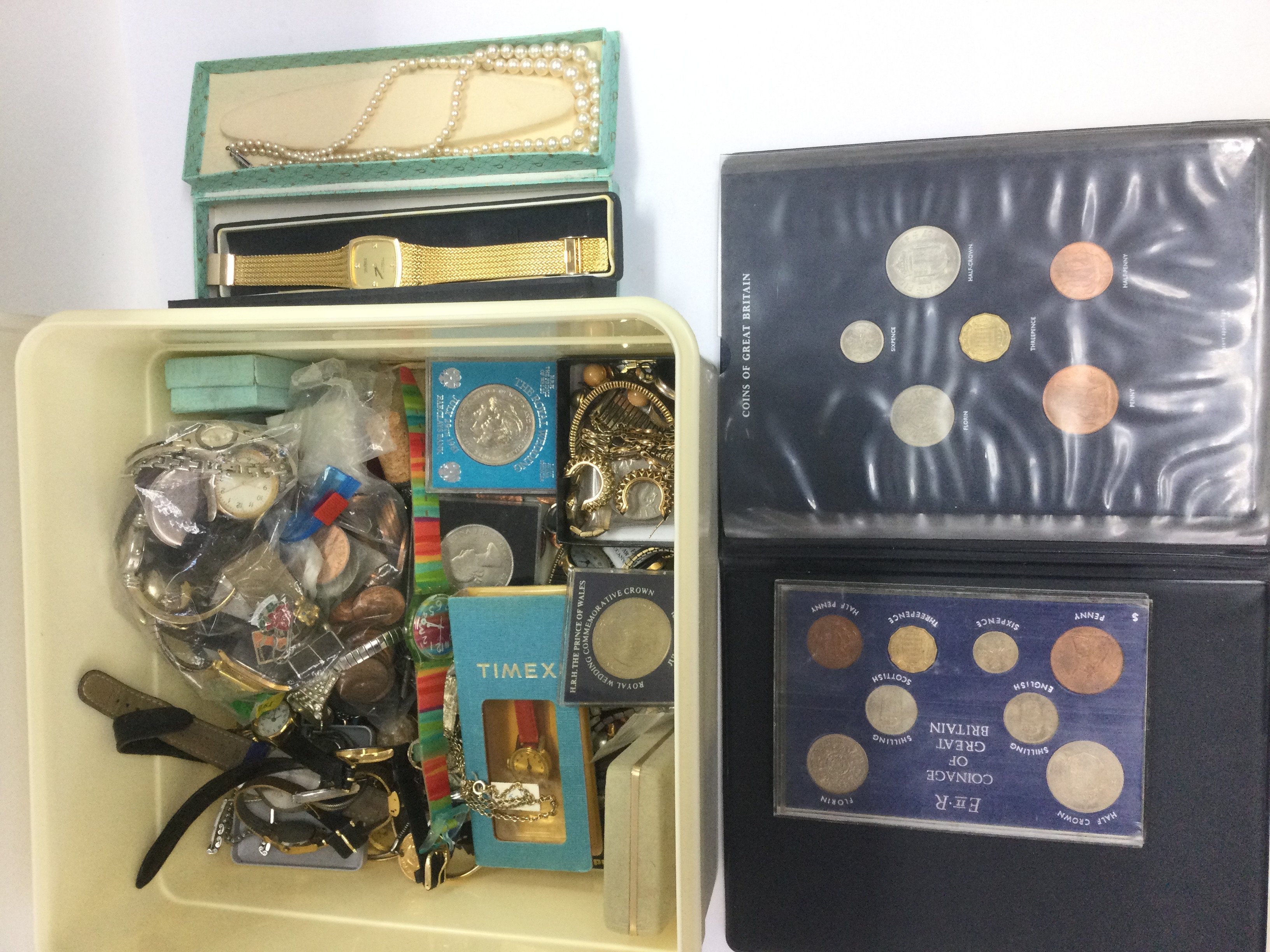 A tub of coins, watches and costume jewellery. Shipping category D.