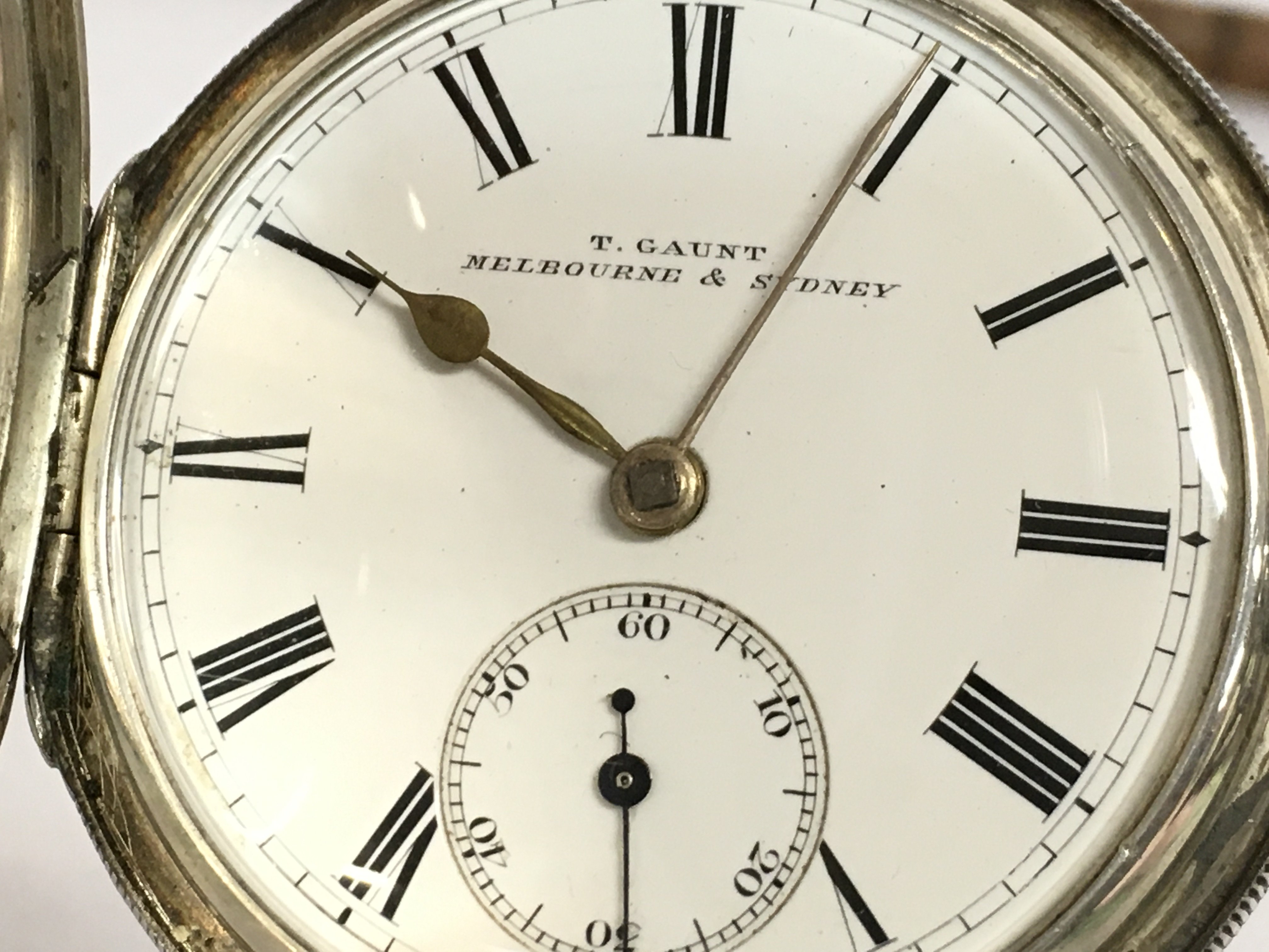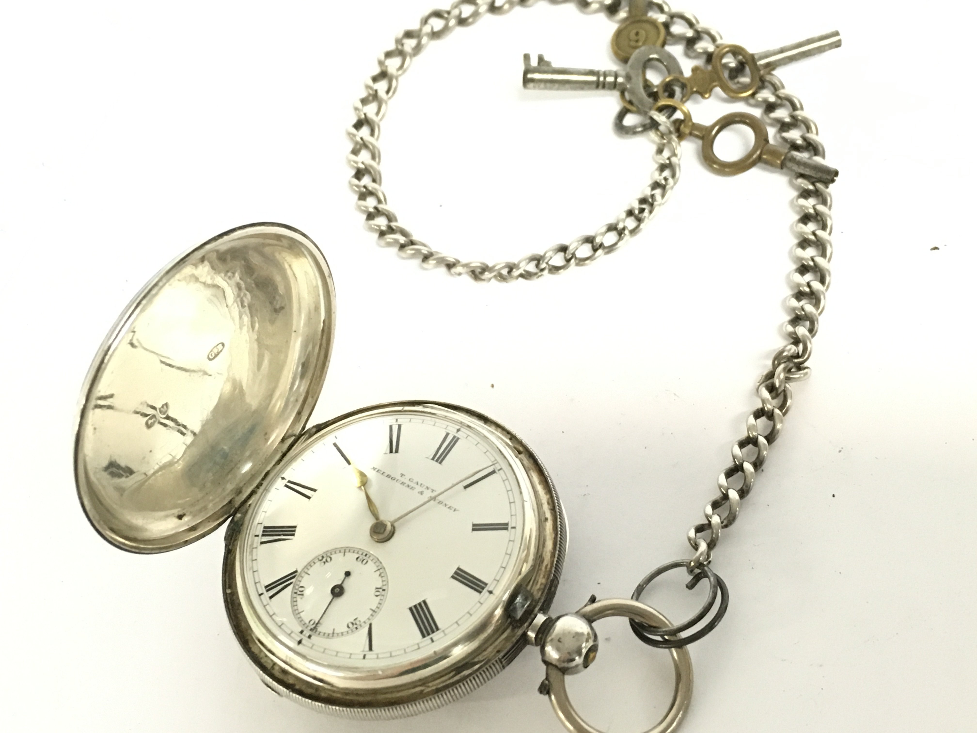 A vintage silver hallmarked T Gaunt Melbourne & Sydney pocket watch with chain and key (seen working). This lot cannot be posted