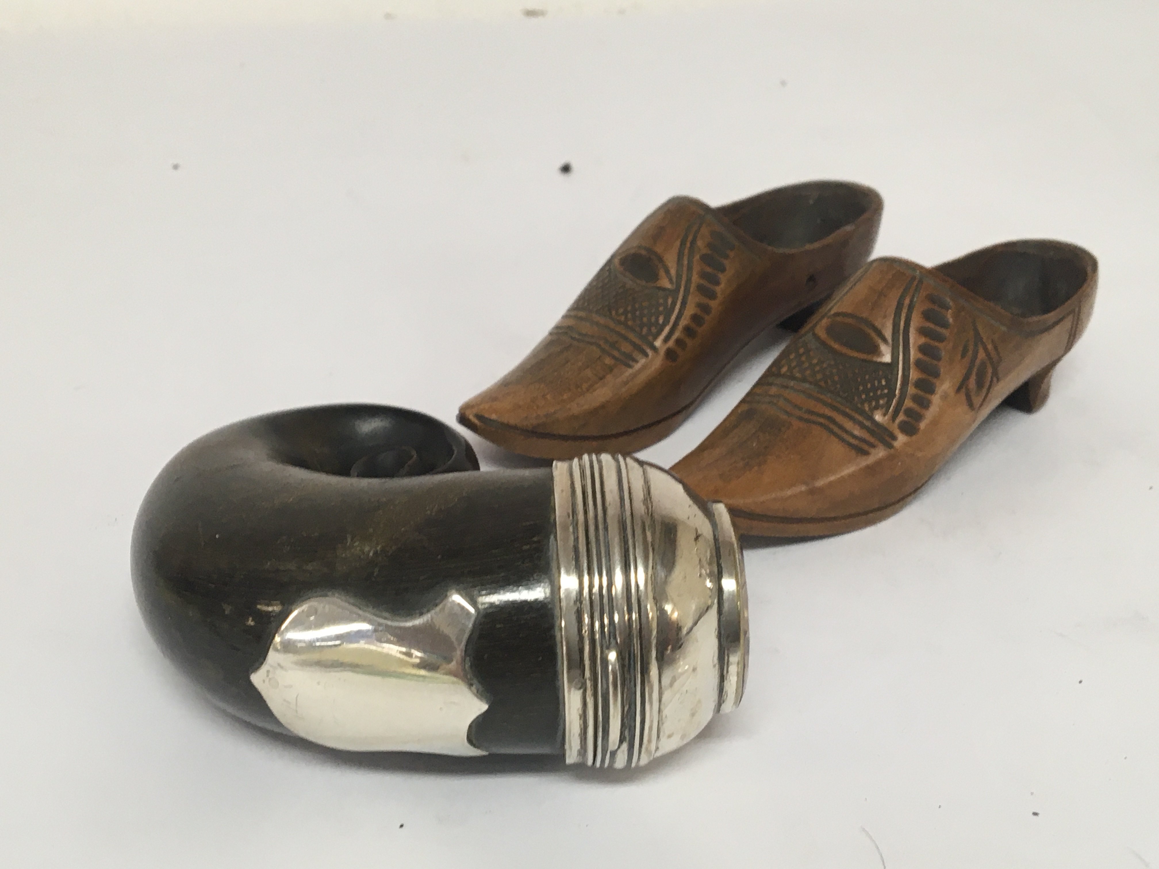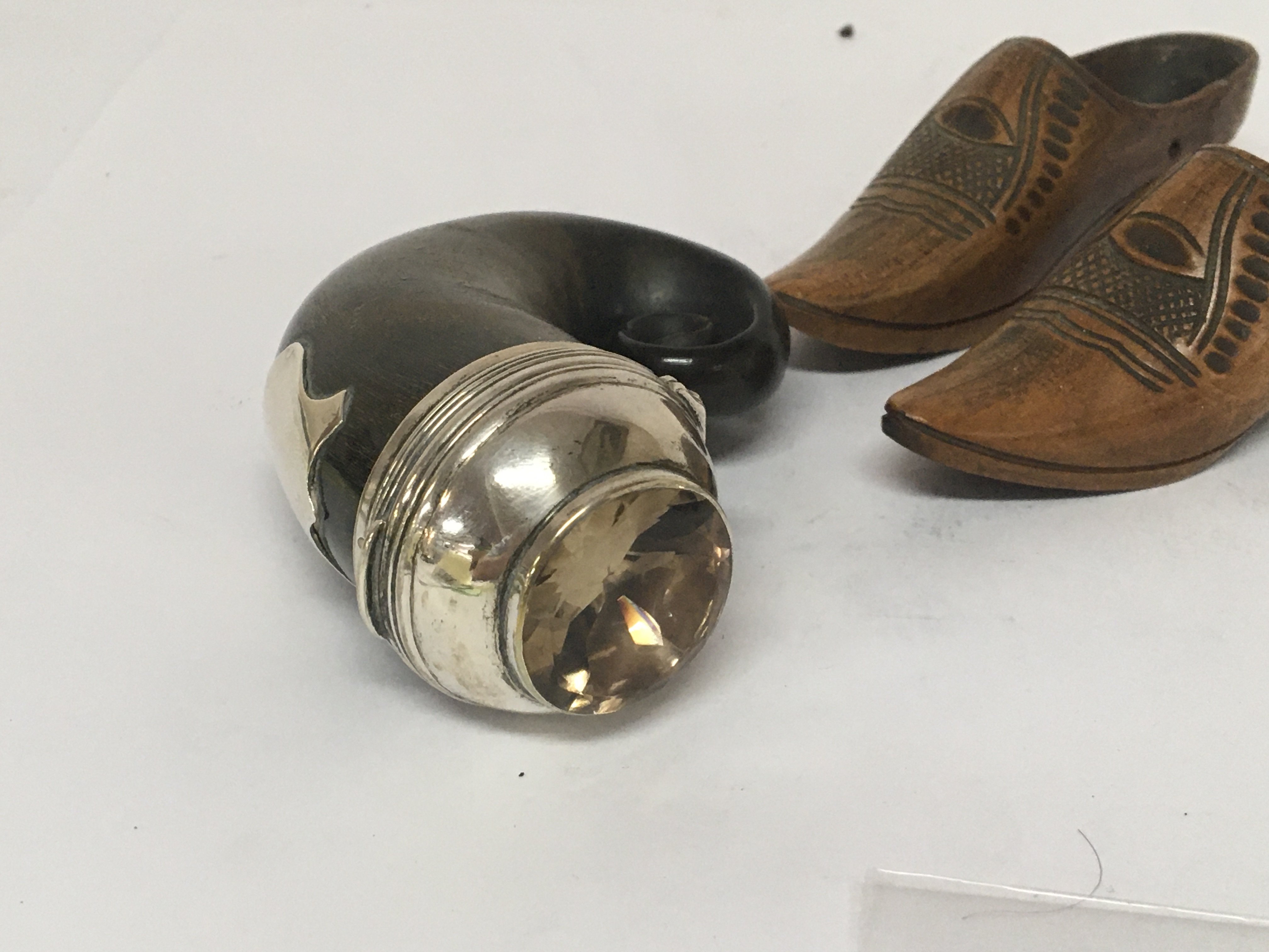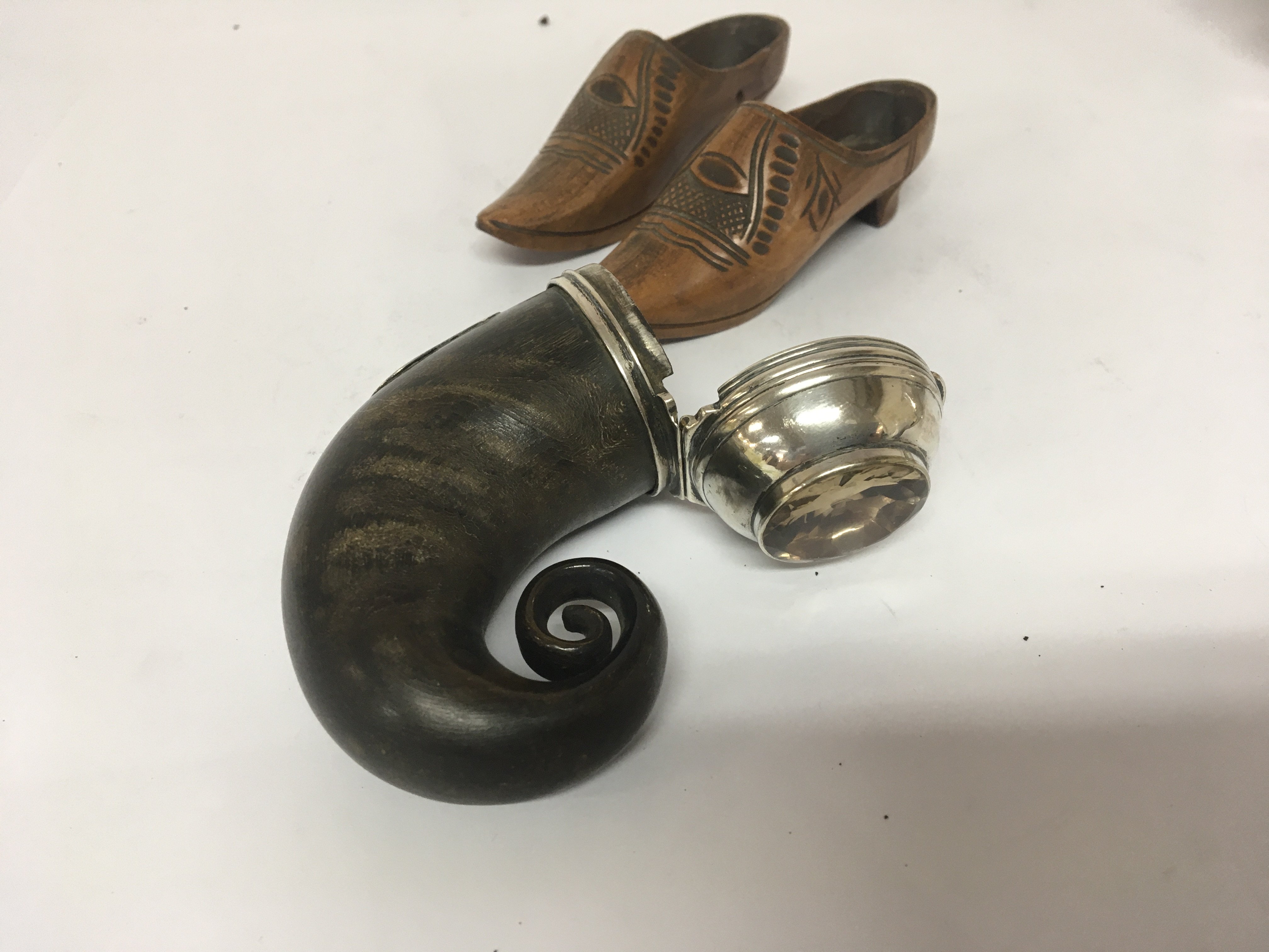 A Scottish 19th century silver and horn snuff mule inset with a cut quartz stone. And a pair of treen carved wood shoe ornaments.