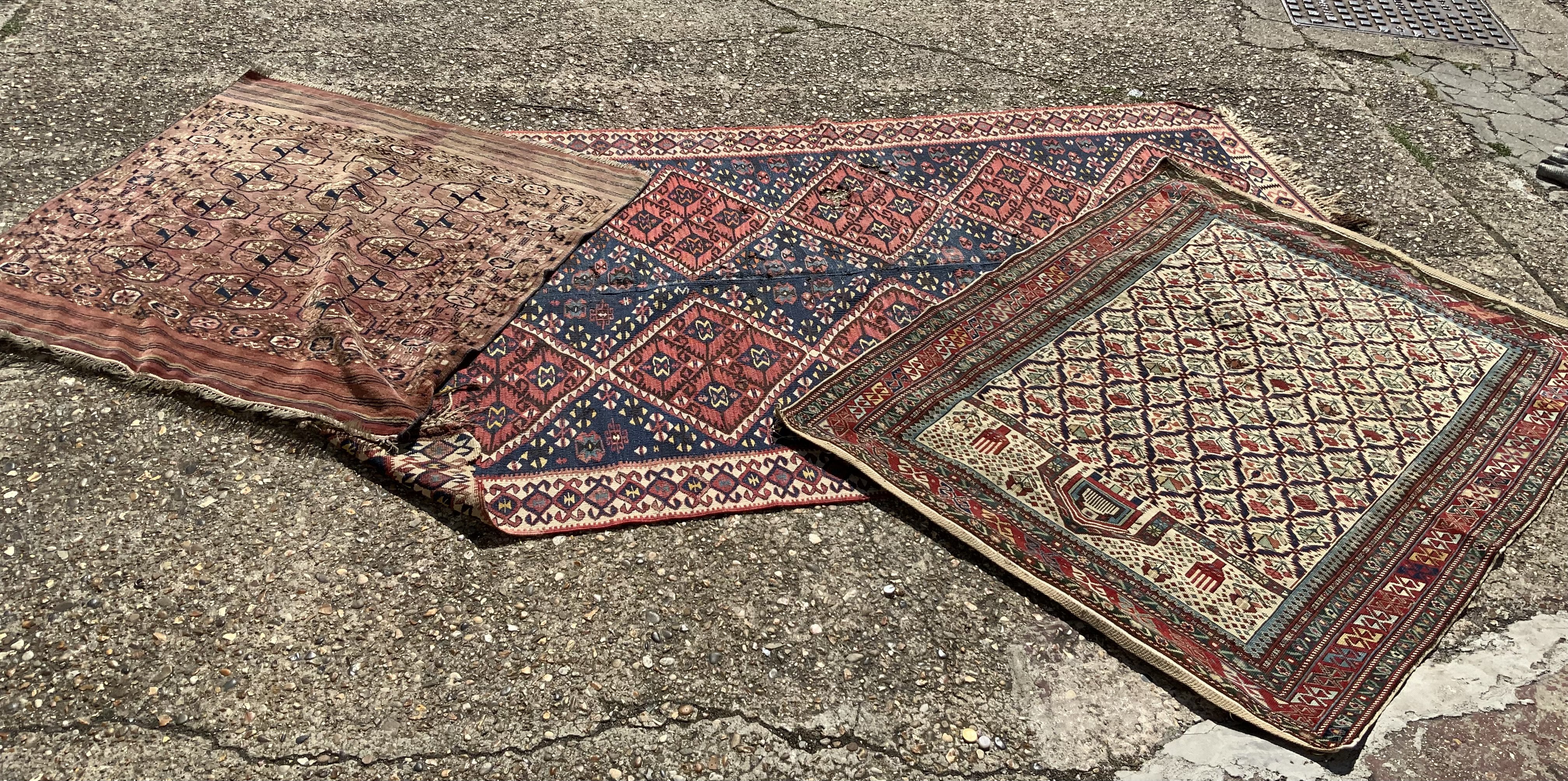 A Hank knotted Kilimanjaro rug ( condition issues) together with 2 additional smaller rugs.149 x 108cm / 220cm x 137cm / 110cm x 110cm