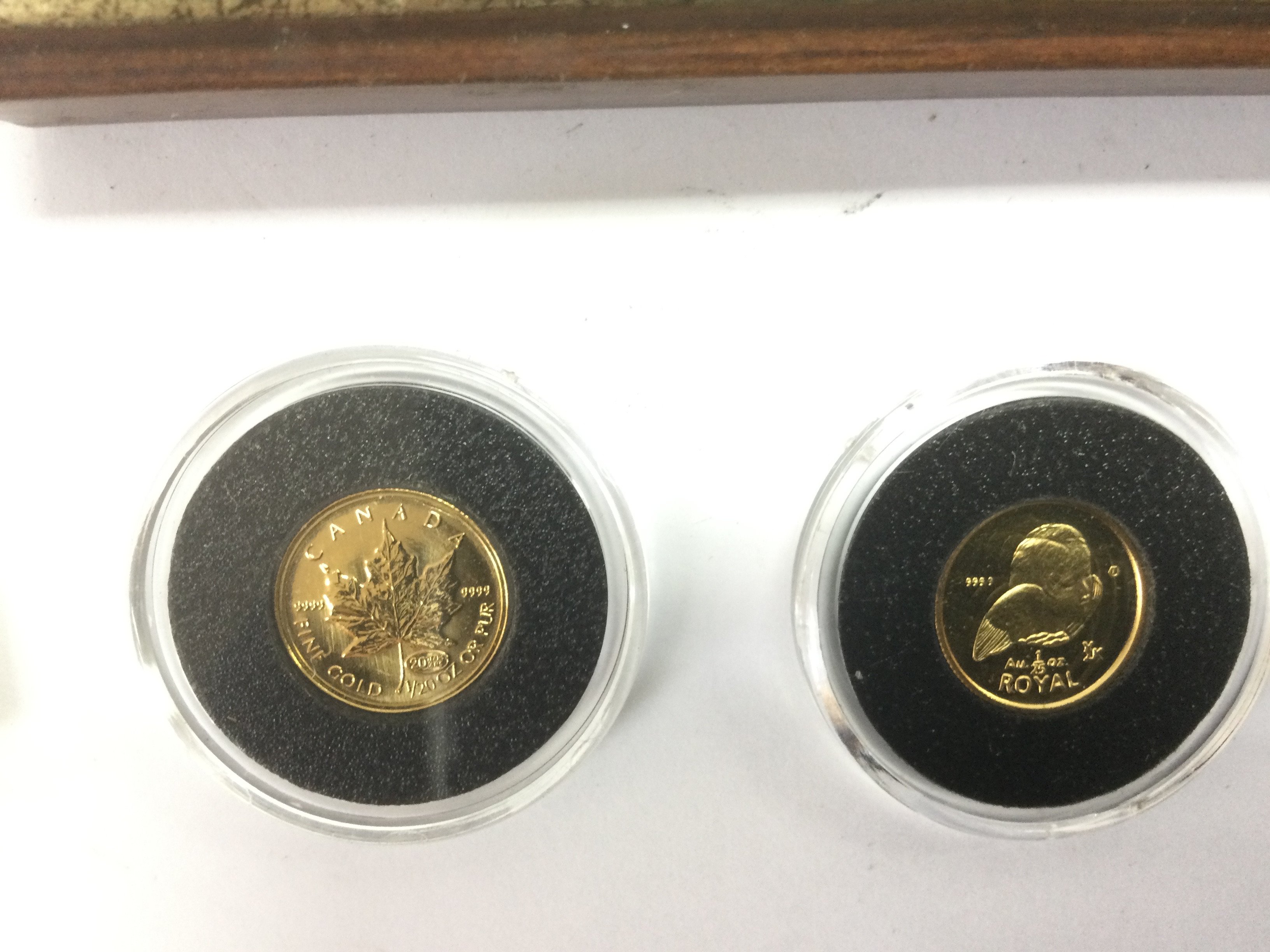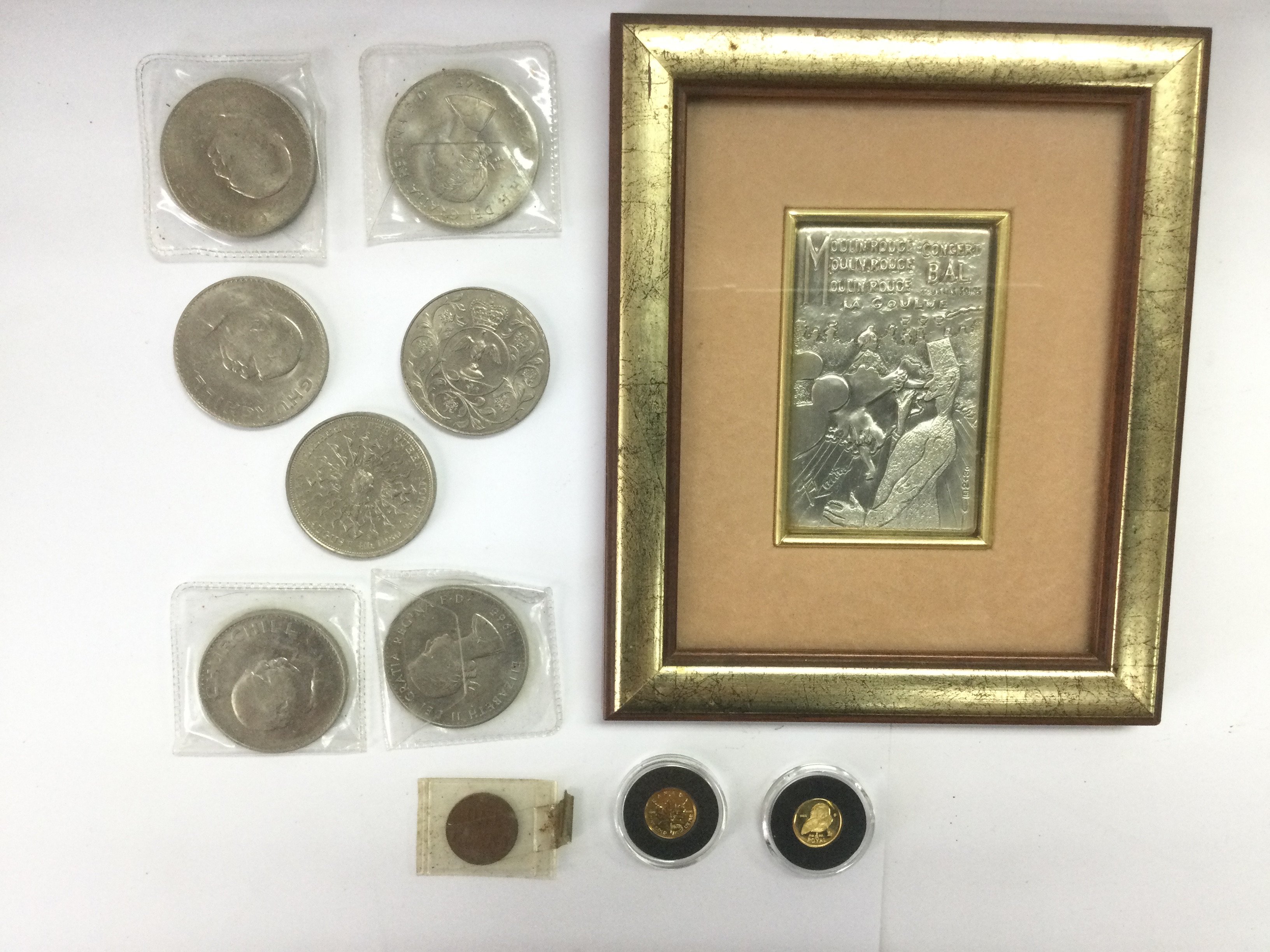 Two small gold proof coins plus other coins and a framed Continental silver plaque of the Moulin Rouge. Shipping category D.