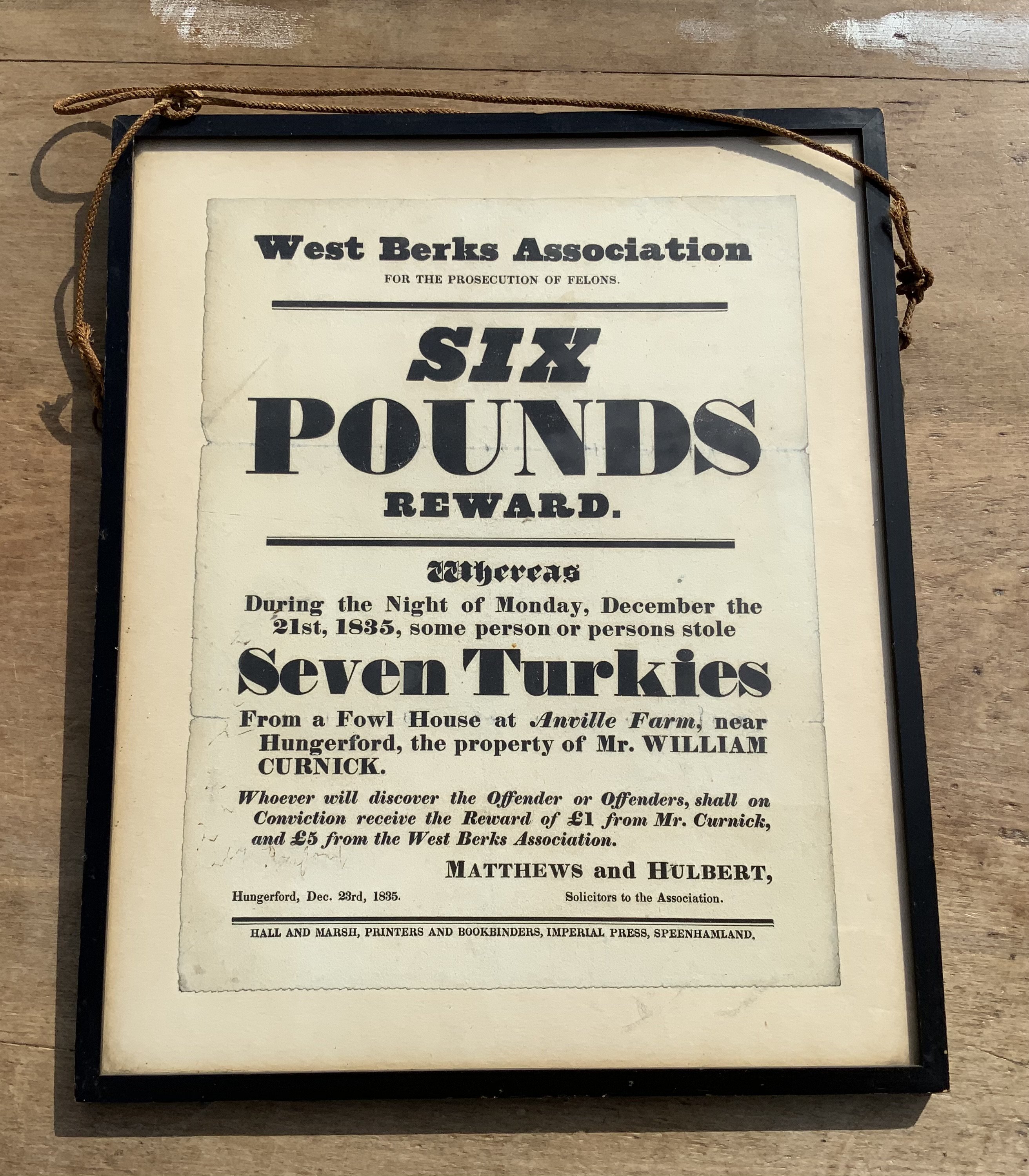 An antique poster framed… Six Pound Reward, West. berks Association.