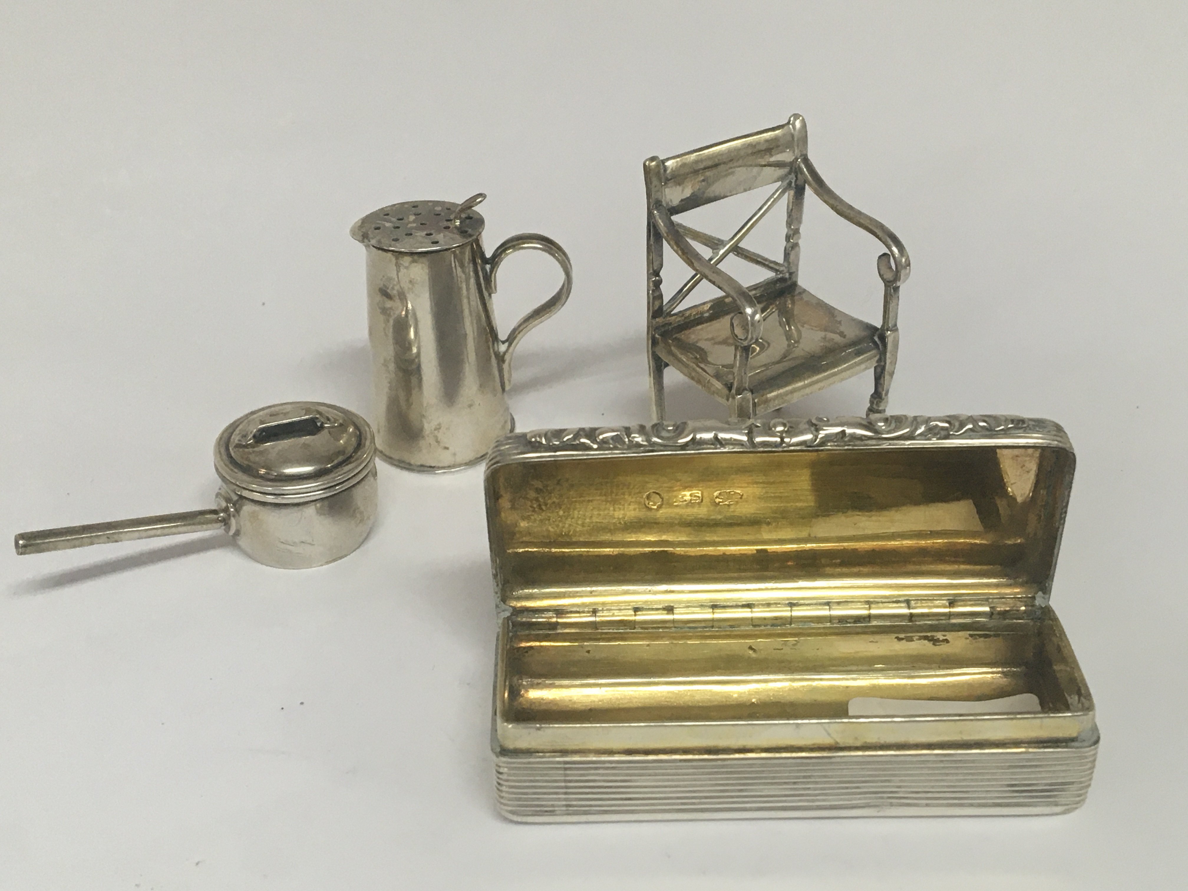A silver snuff box Birmingham hallmarks early 19th century a miniature silver chair Birmingham 1913 hallmarks a miniature cooking pot and silver jug (4)
