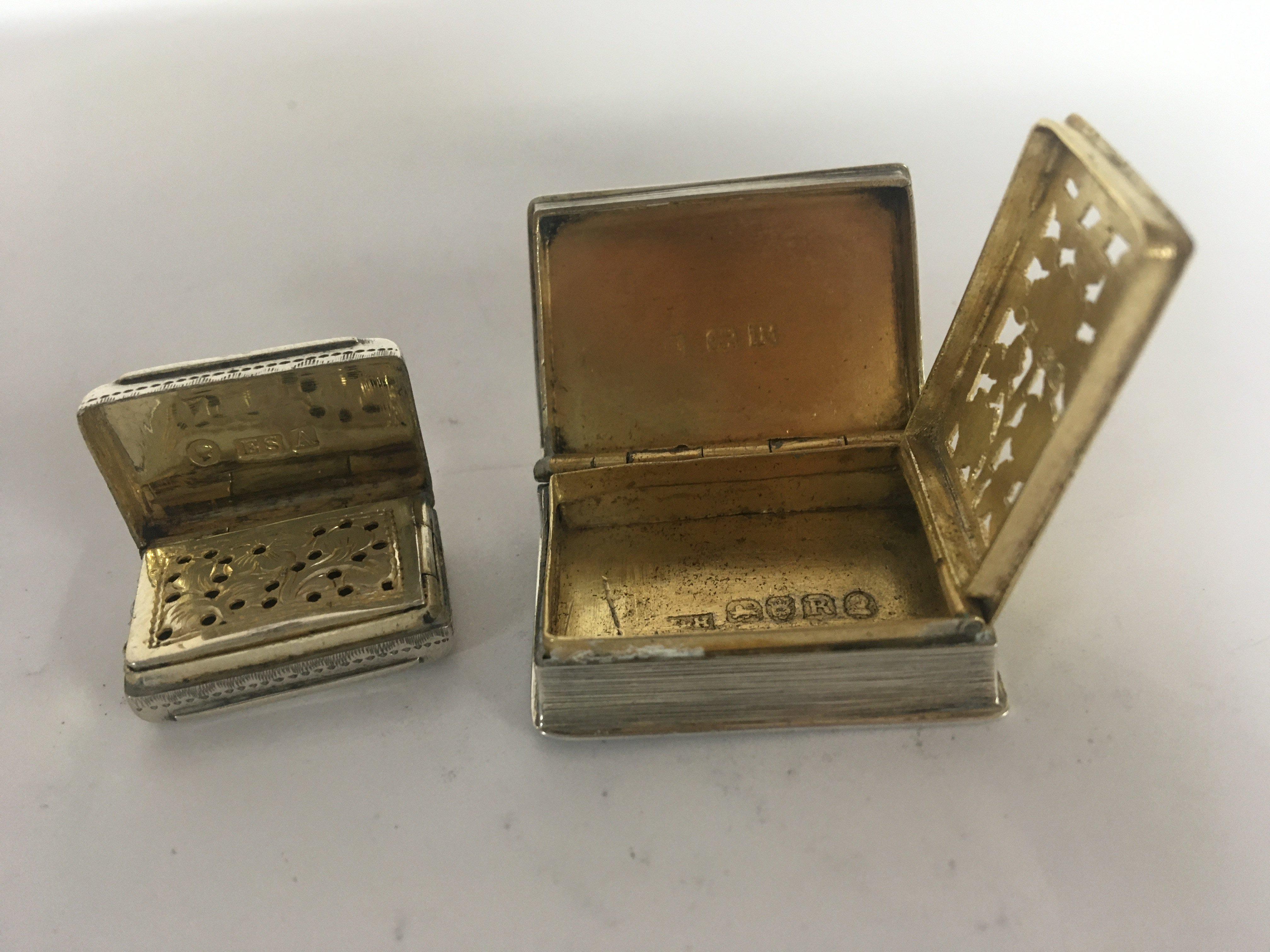 Two Victorian silver and parcel gilt Vinaigrettes one in the form of a book late George III London hallmarks the smaller with Victorian marks (2)