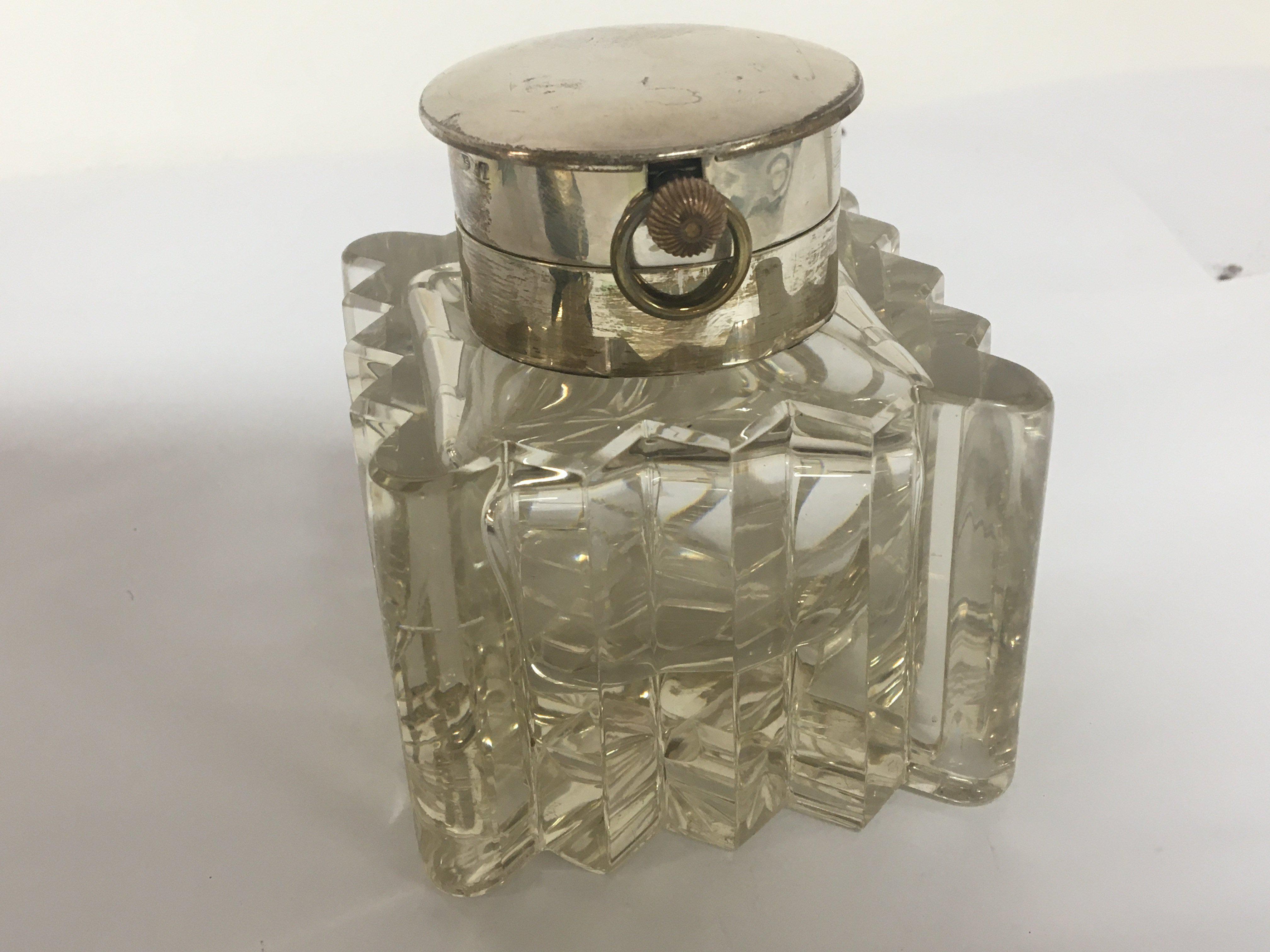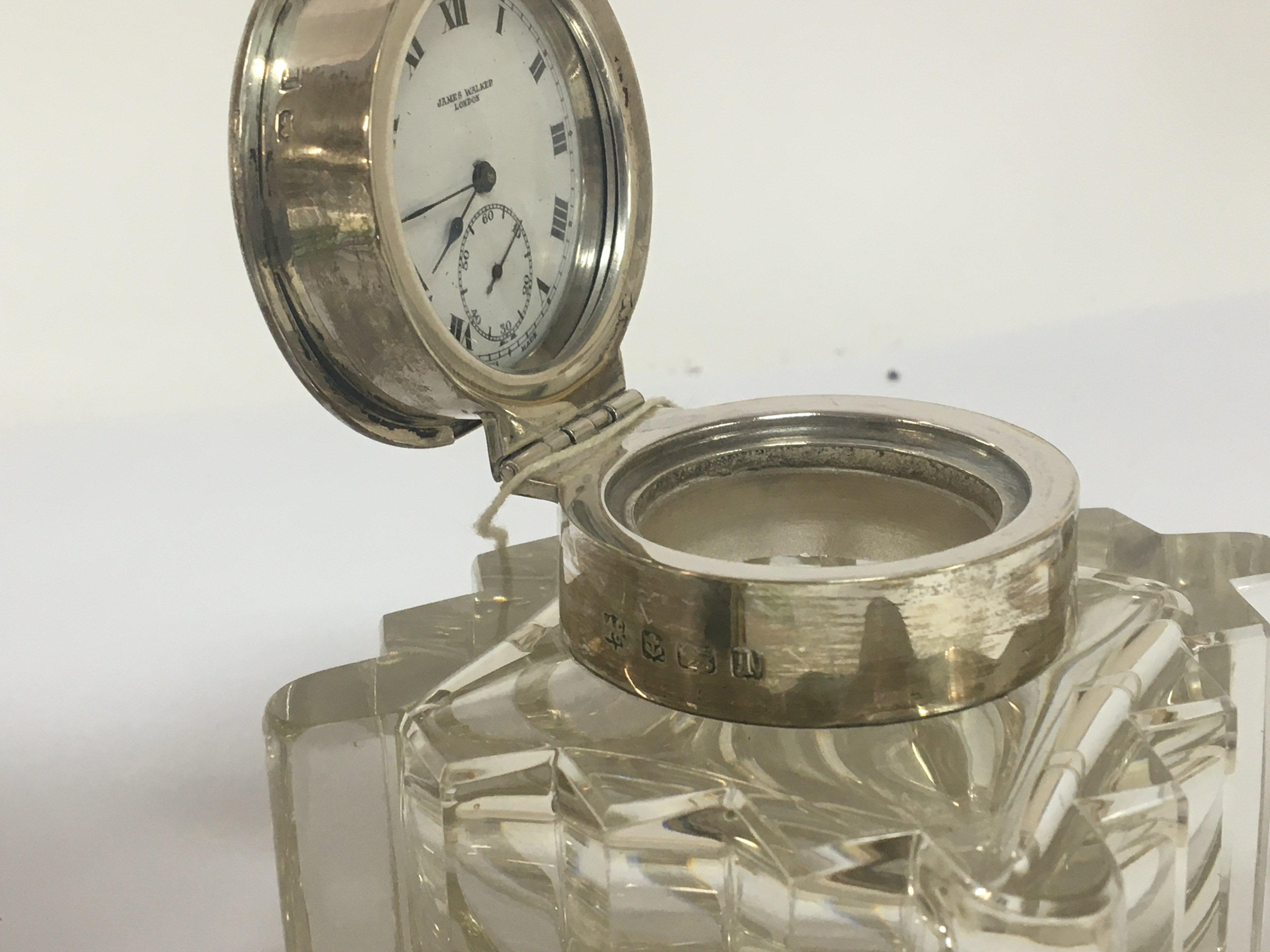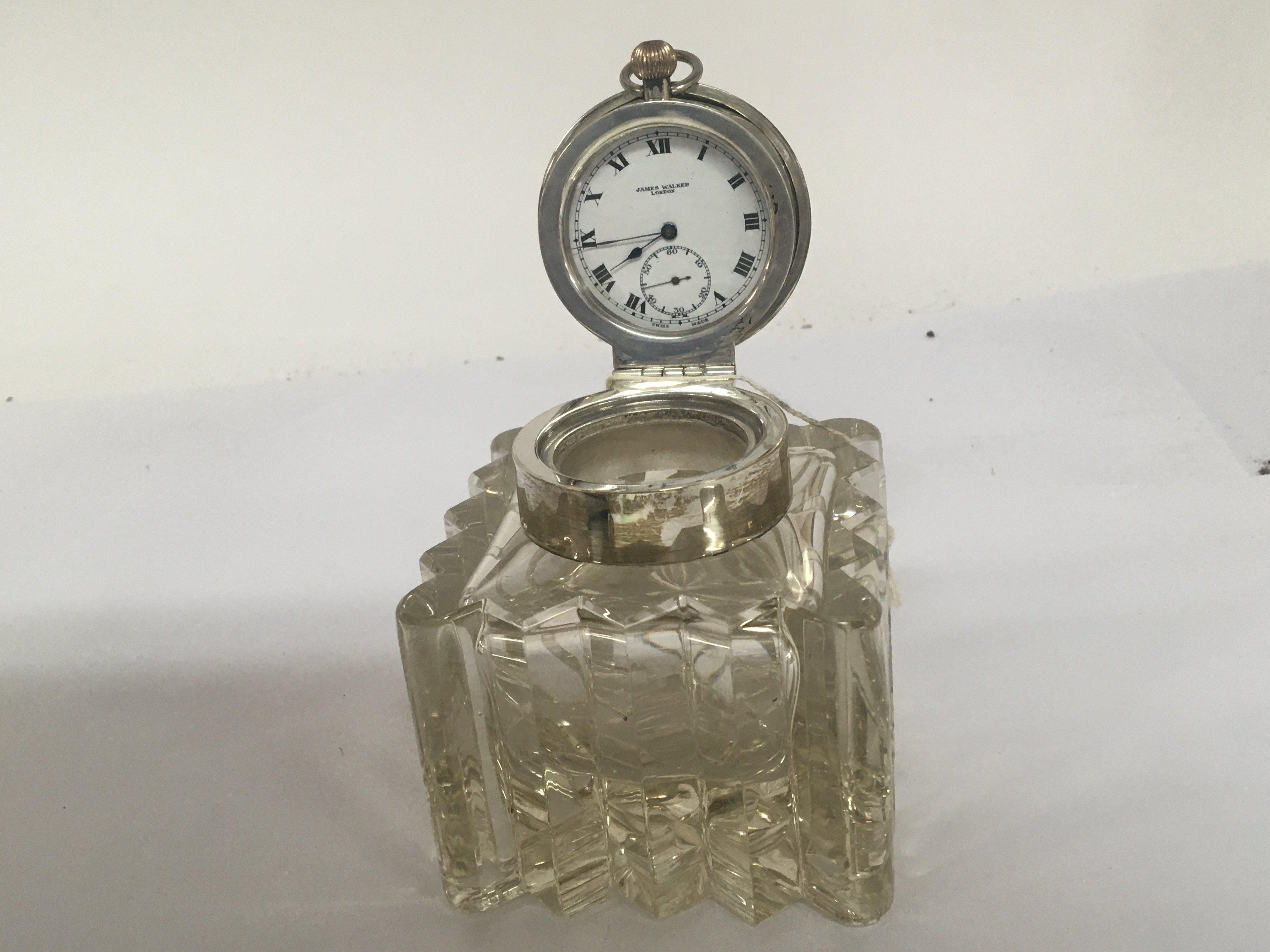 A silver and cut glass novelty ink well the hinged silver cap inset with a button wind pocket watch maker James Walker London. no obvious damage.