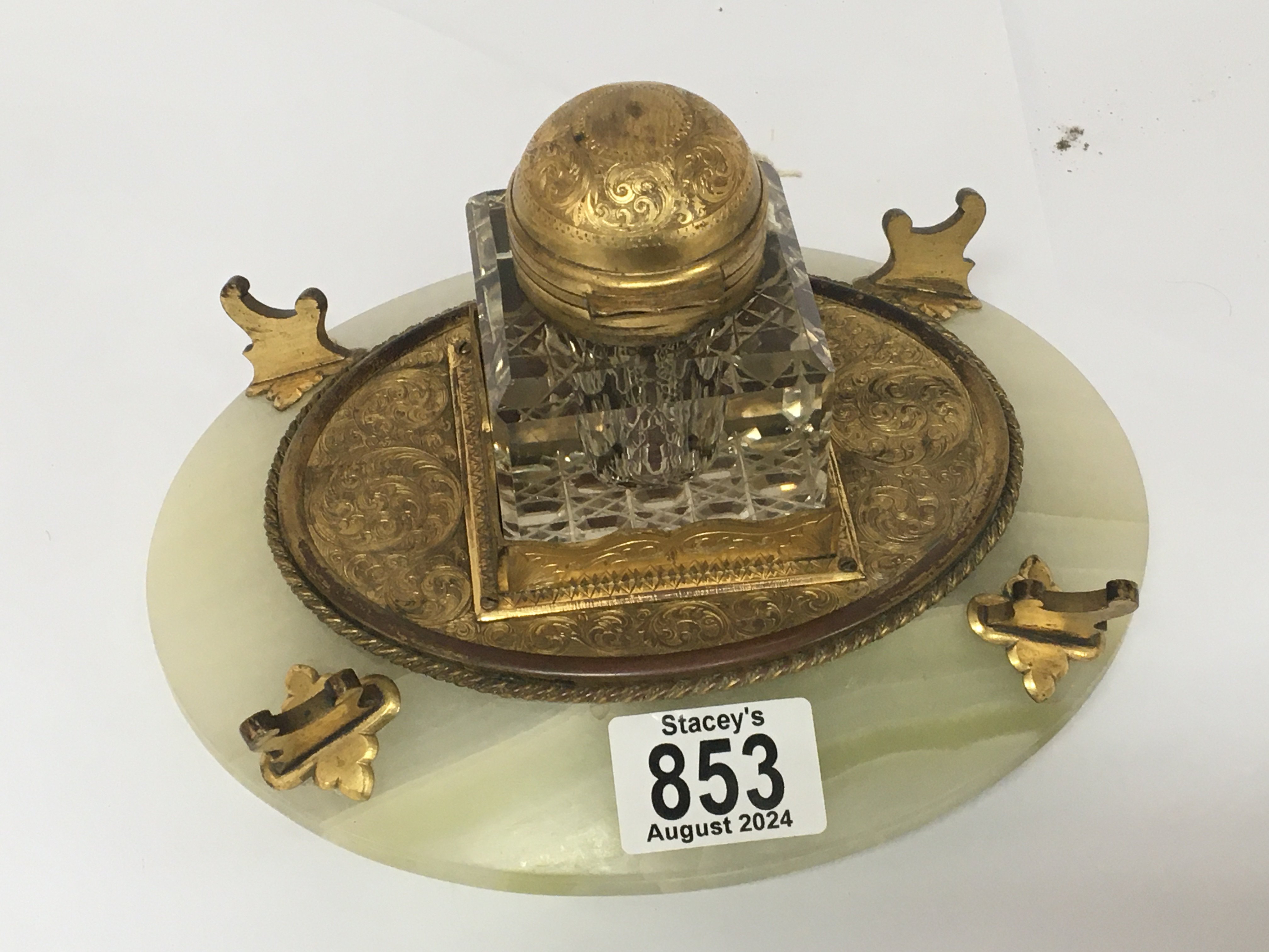 A Quality late Victorian gilt metal an onyx partners desk top inkwell the hinged top with dual opening. Length 22cm