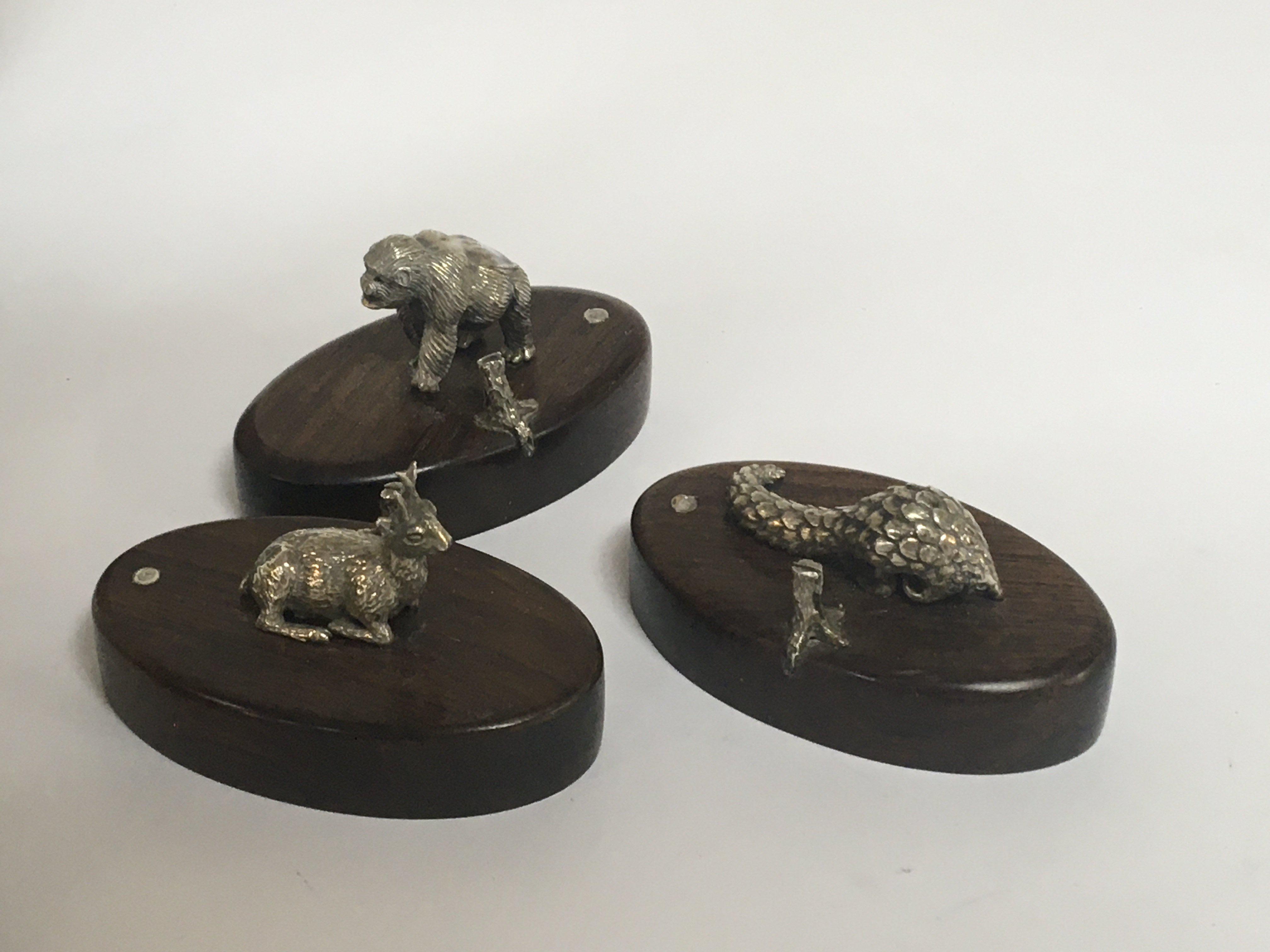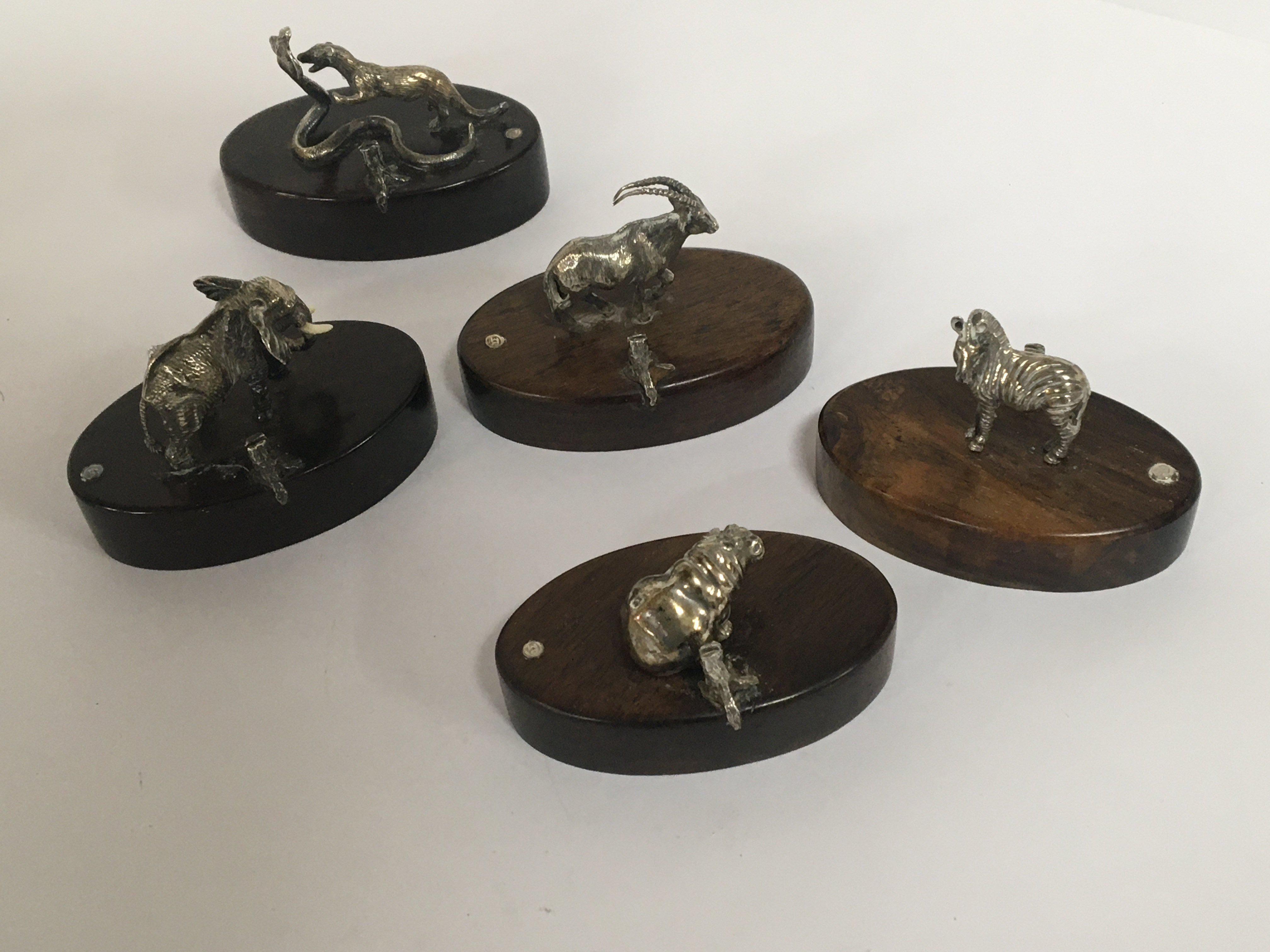 A set of eight quality 20th Century silver menu holders cast in the form of African animals on polished hardwood bases each inset with a small silver makers tablet. (5)