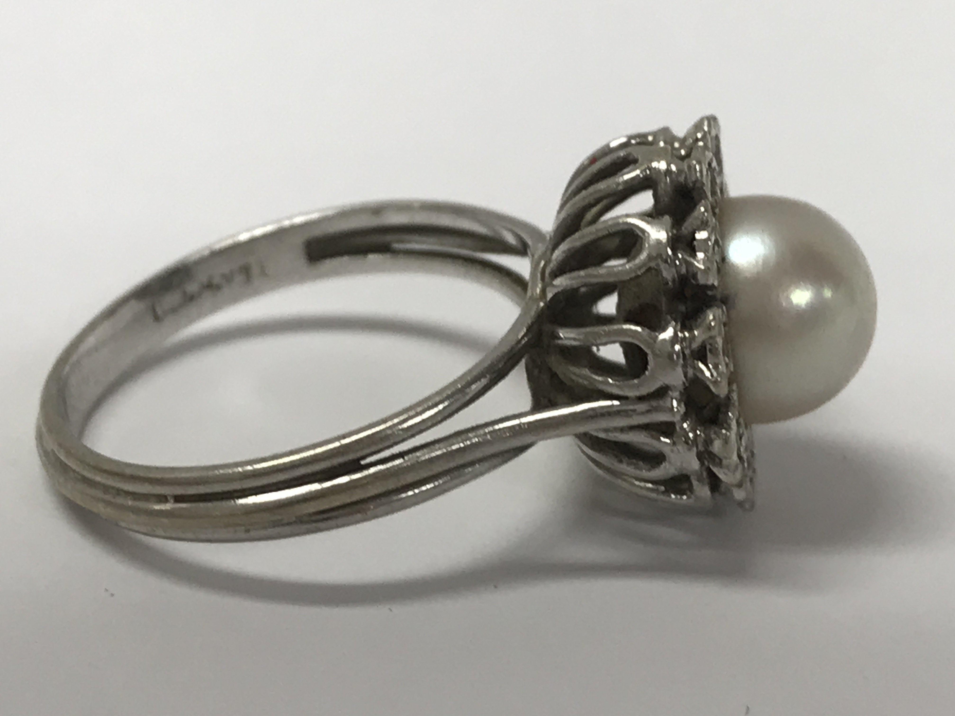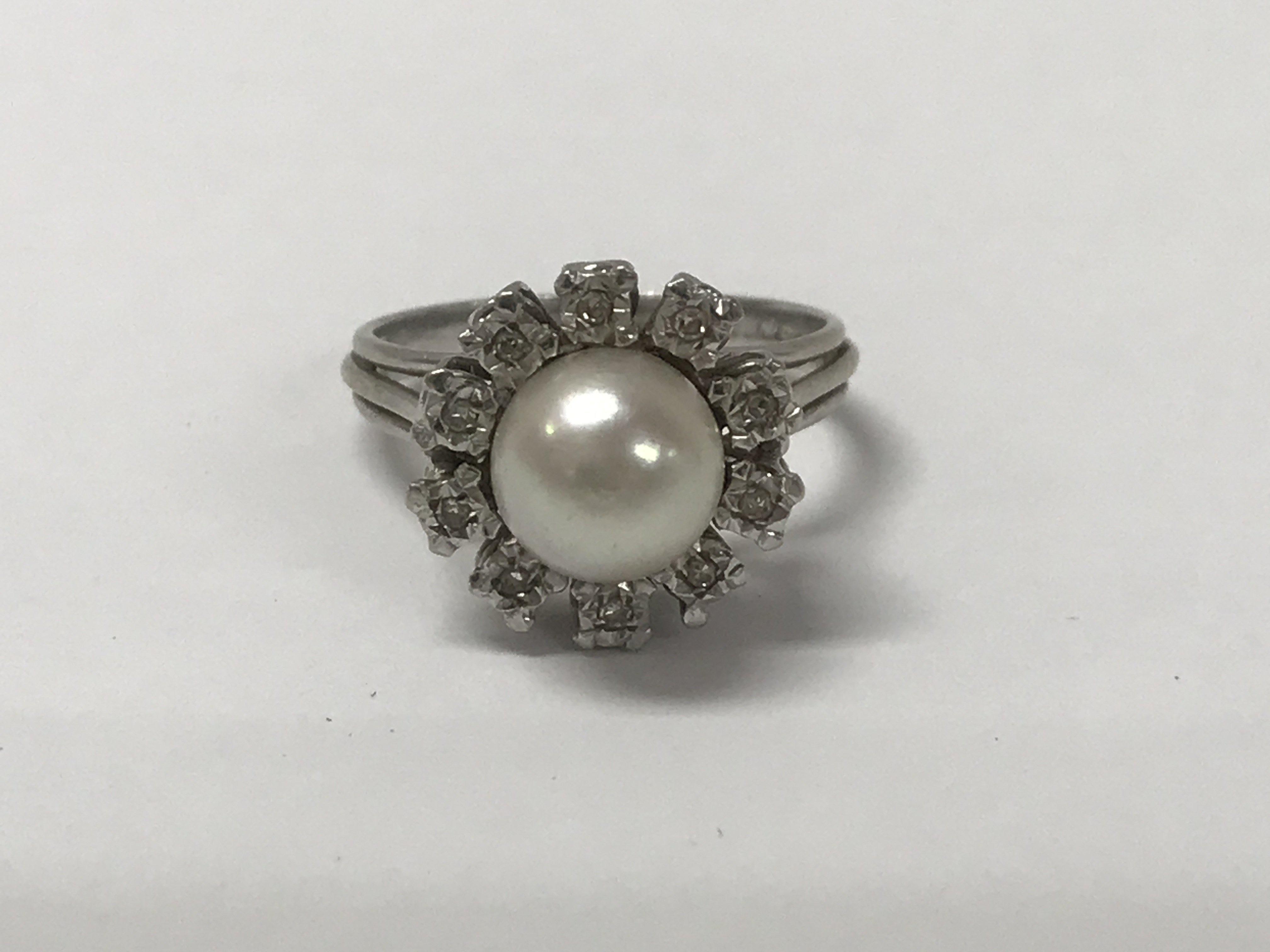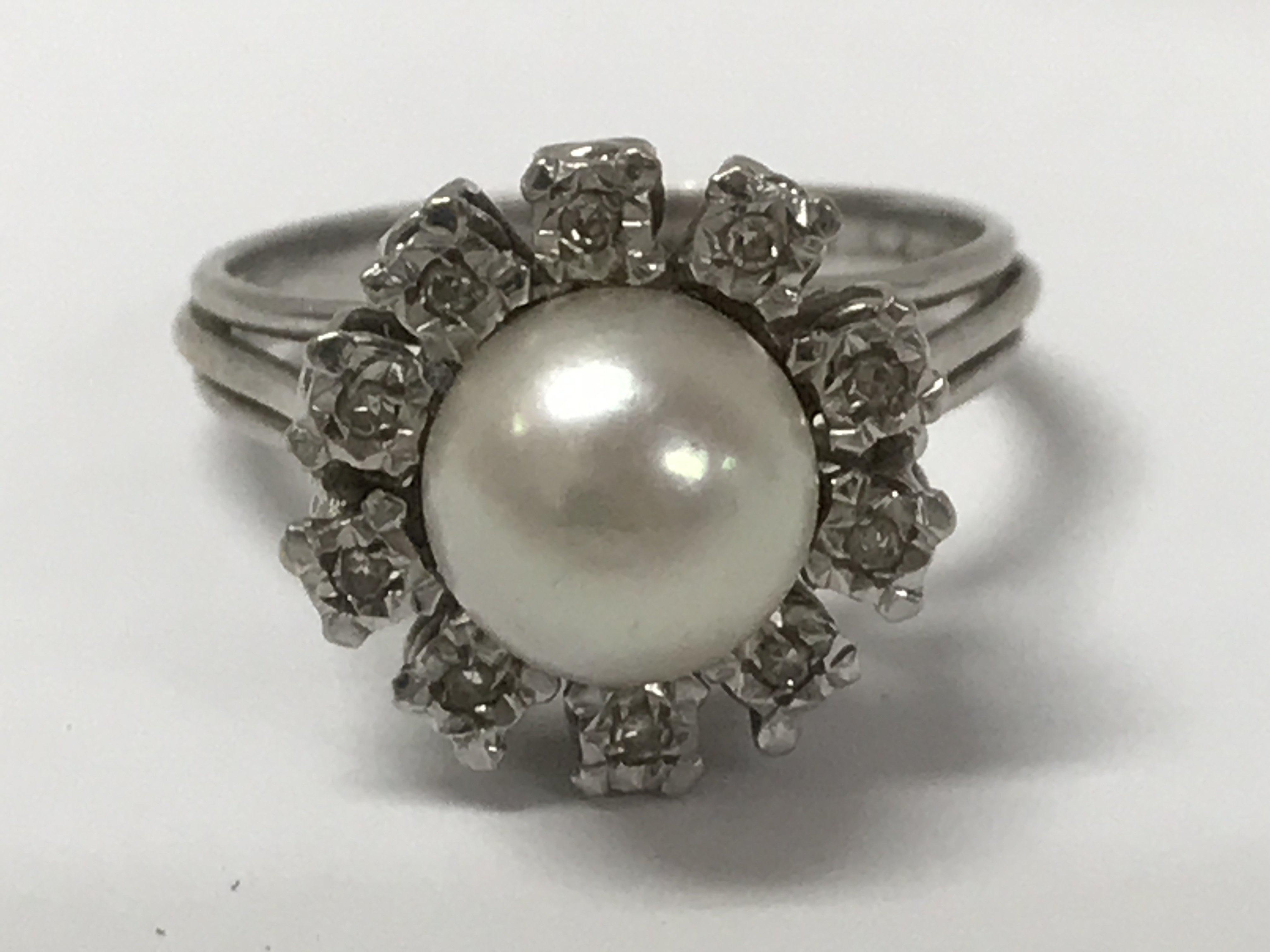 A white gold gold ring inset with central pearl surrounded by diamond chips .size N .