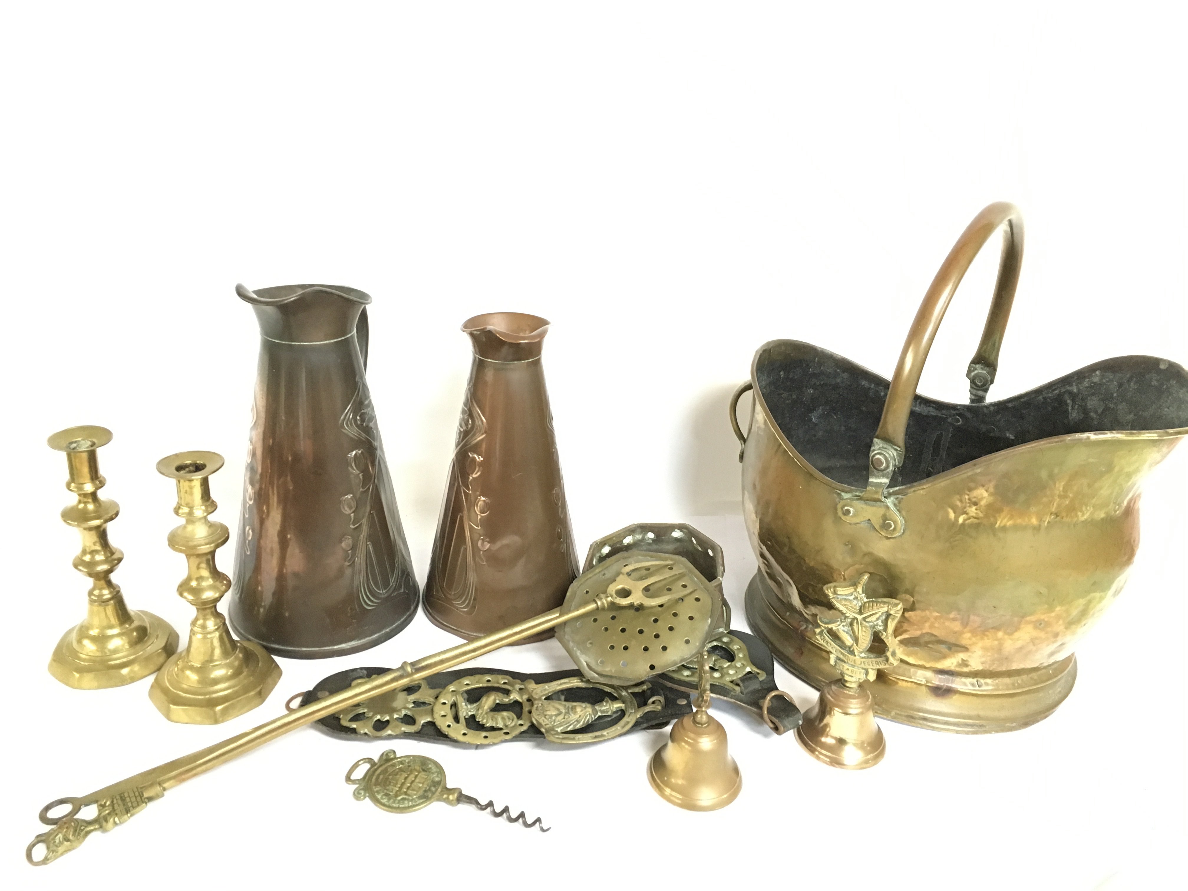 A collection of copper jugs, a coal bucket and other brass items. This lot cannot be posted
