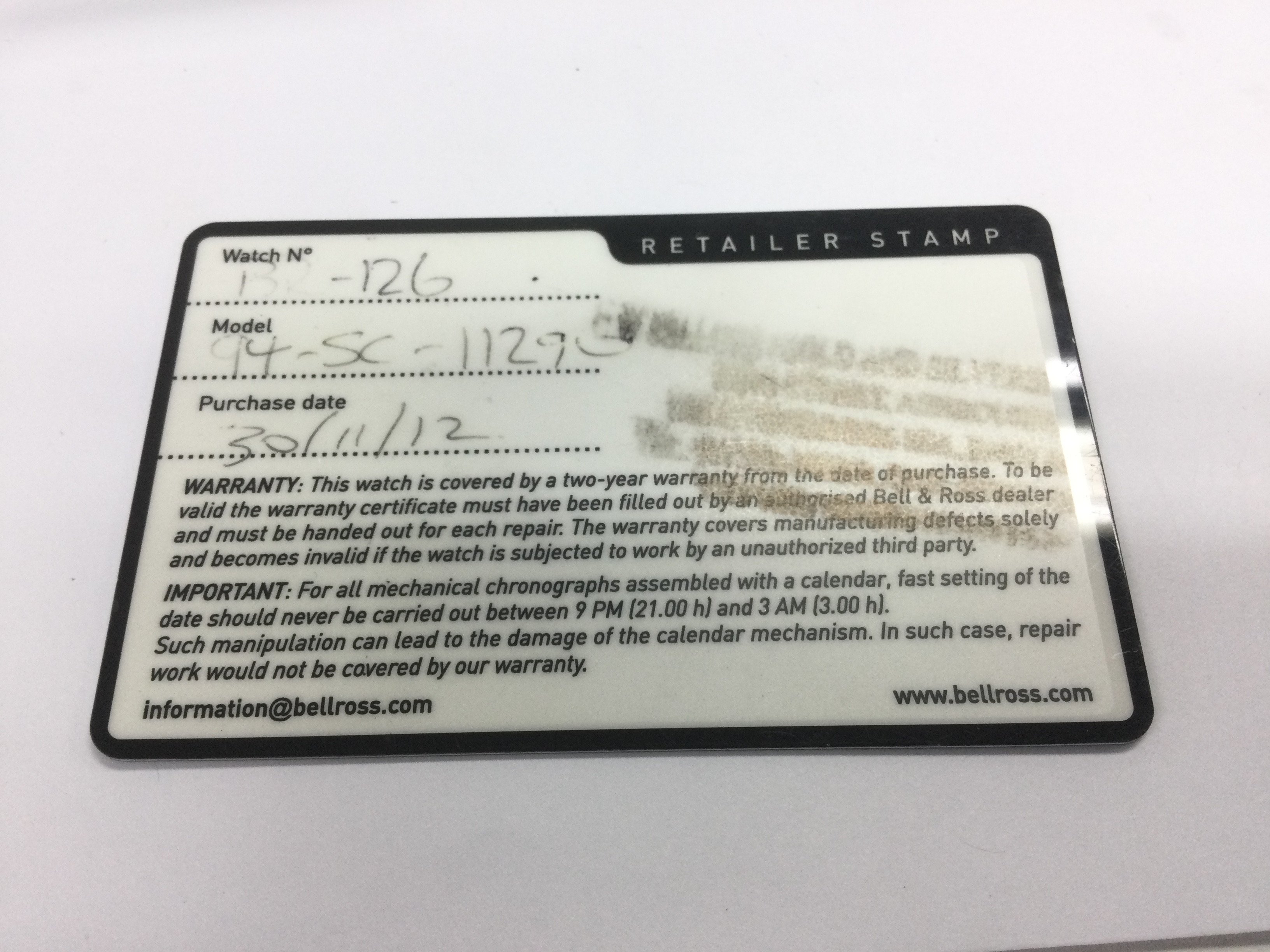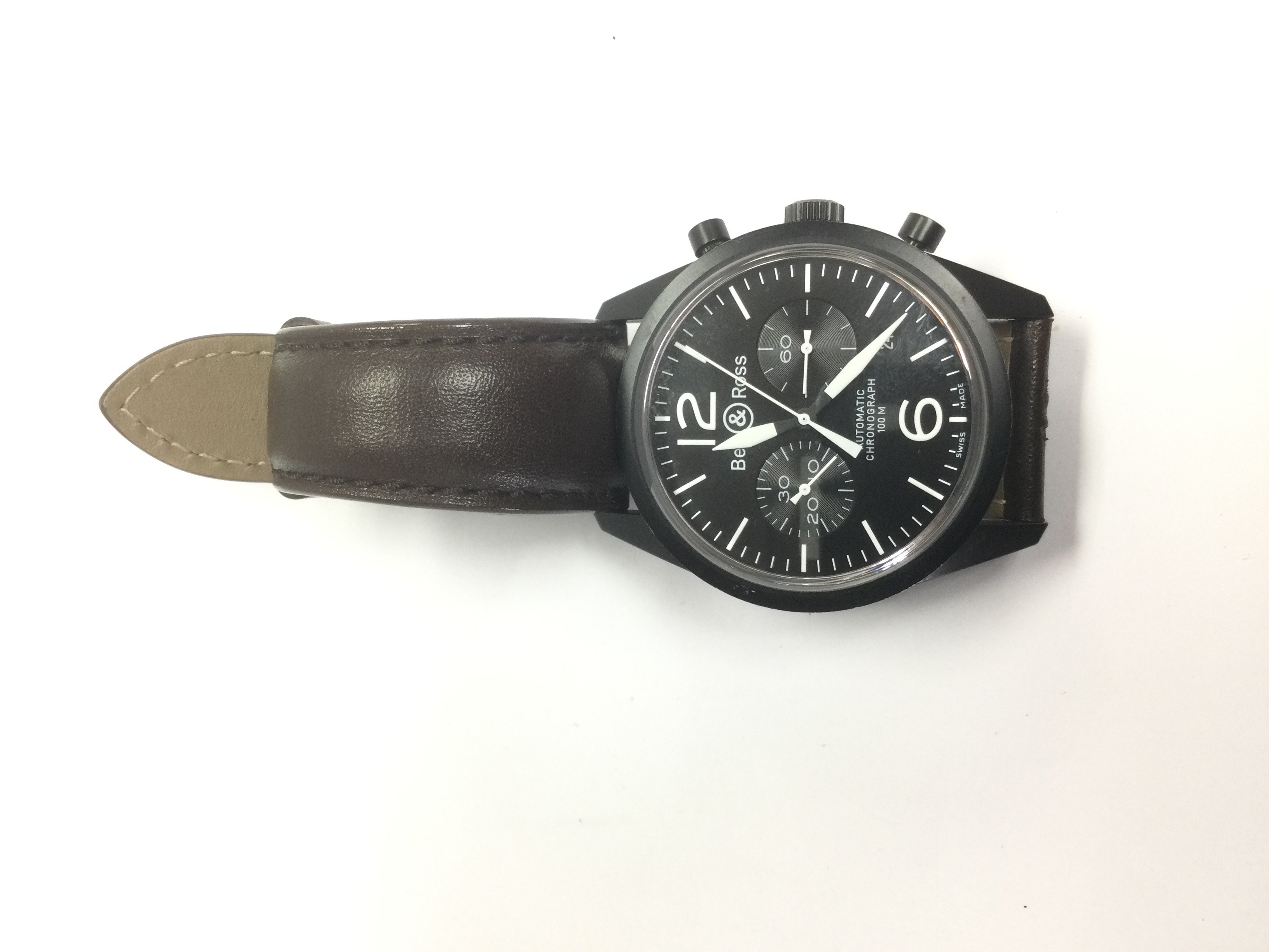 A Bell & Ross Chronograph watch with black dial and two subsidiary dials. Comes with warranty card. Shipping category B.