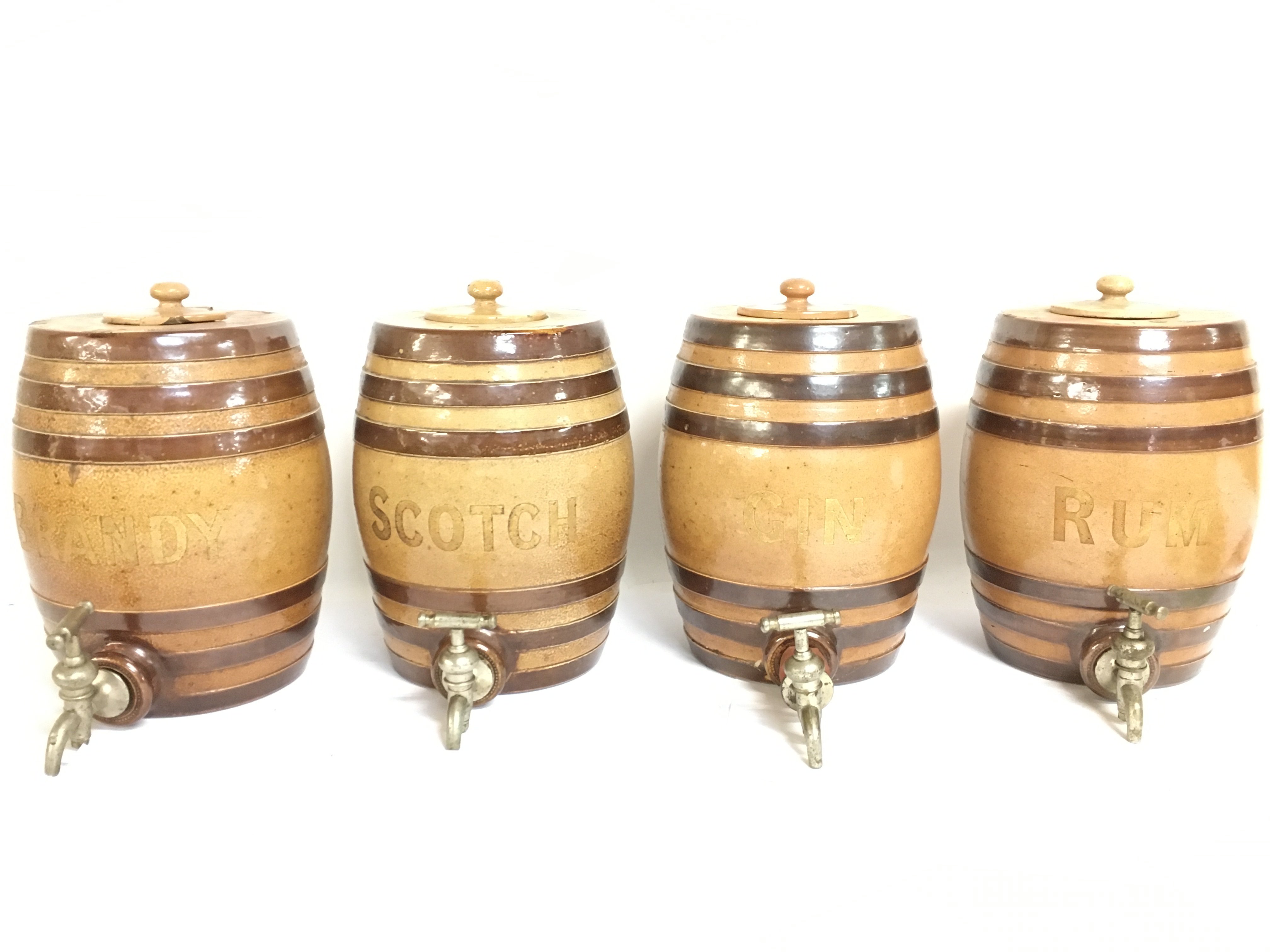 Royal Doulton Lambeth Spirit barrels, Brandy, Scotch, Gin and Rum. 26cm tall 18cm wide. Some damage. This lot cannot be posted