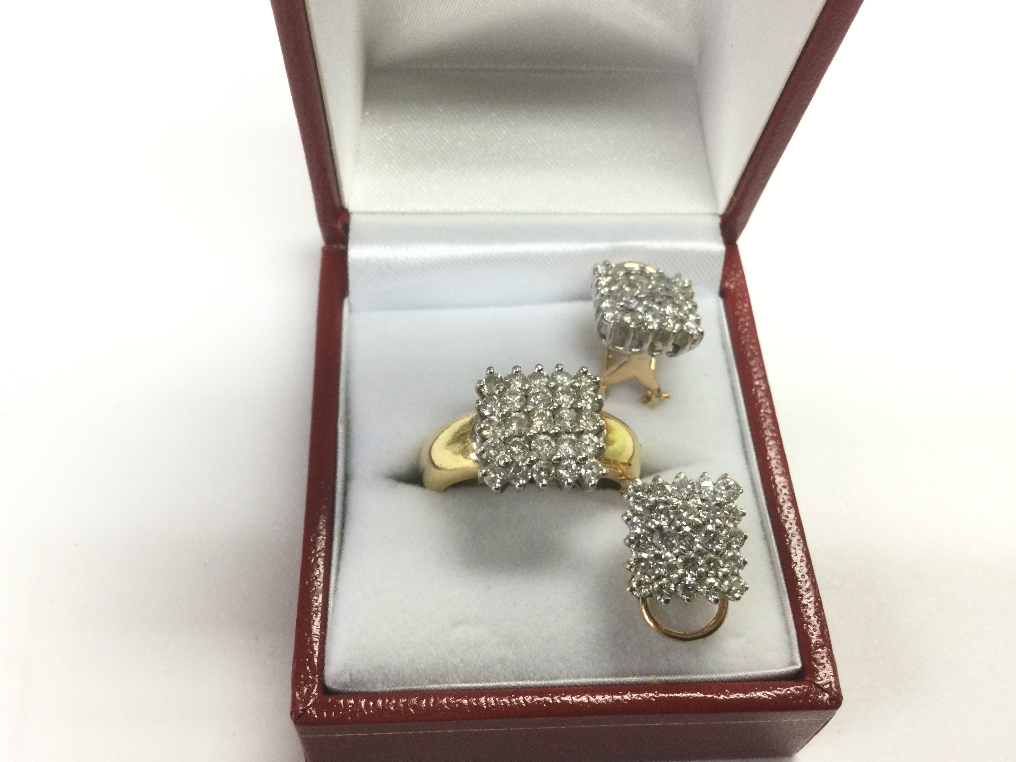 An 18ct gold diamond ring set with 25 diamonds plus a matching pair of earrings, approx 11.3g. Shipping category A.