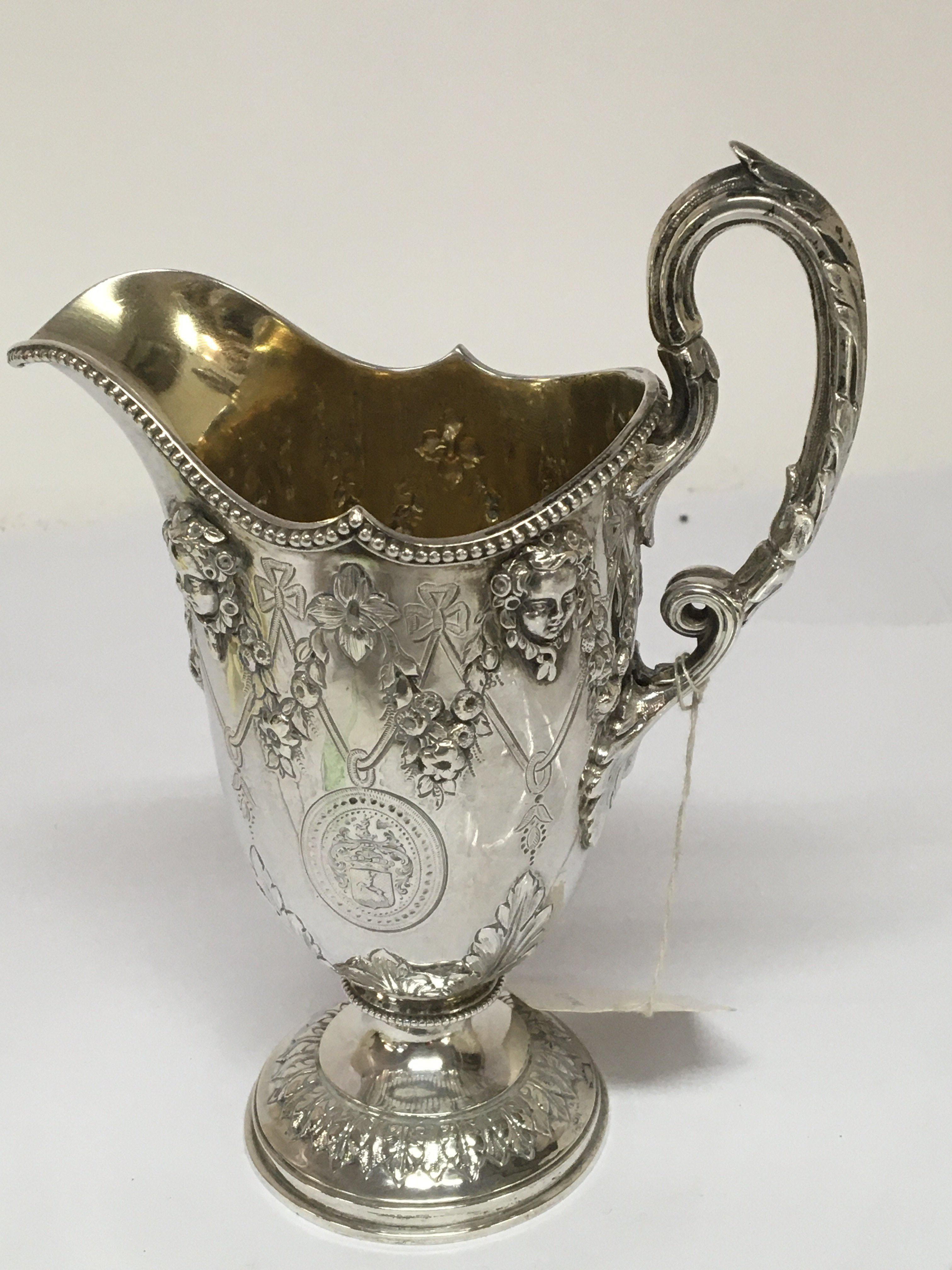 A Quality Victorian silver and parcel gilt cream jug decorated with raised masks and garlands London 1861 hallmarks height 17cm 272g