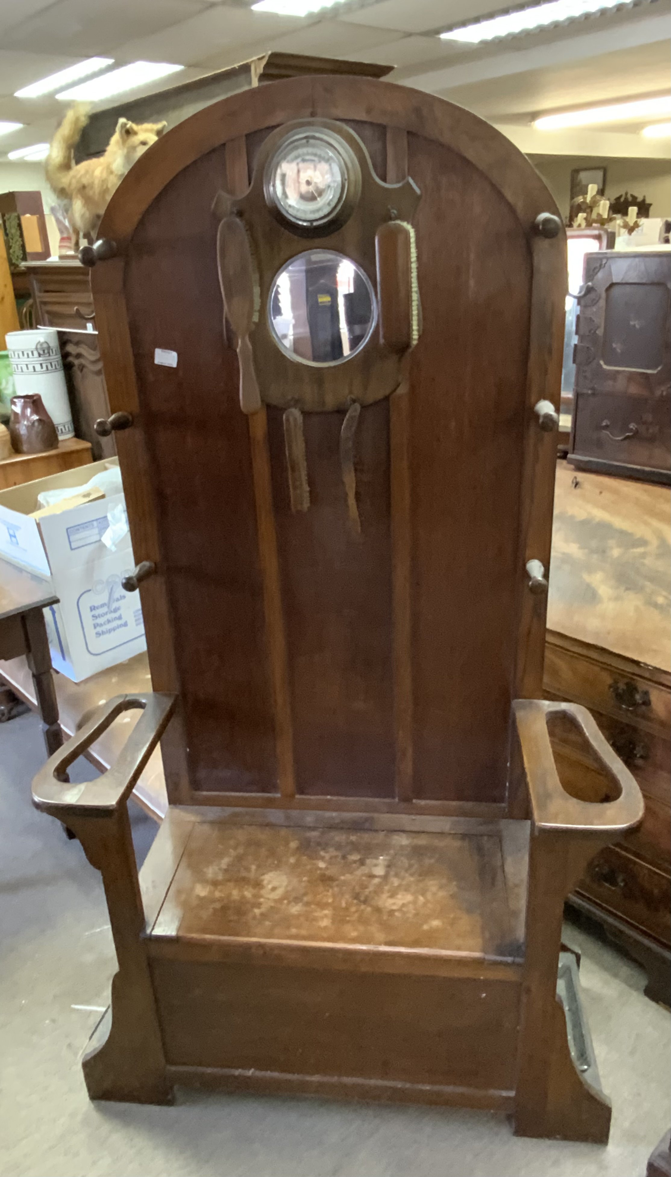 1950s oak hall stand with attached barometer and brush stand. 177cm x 99cm
