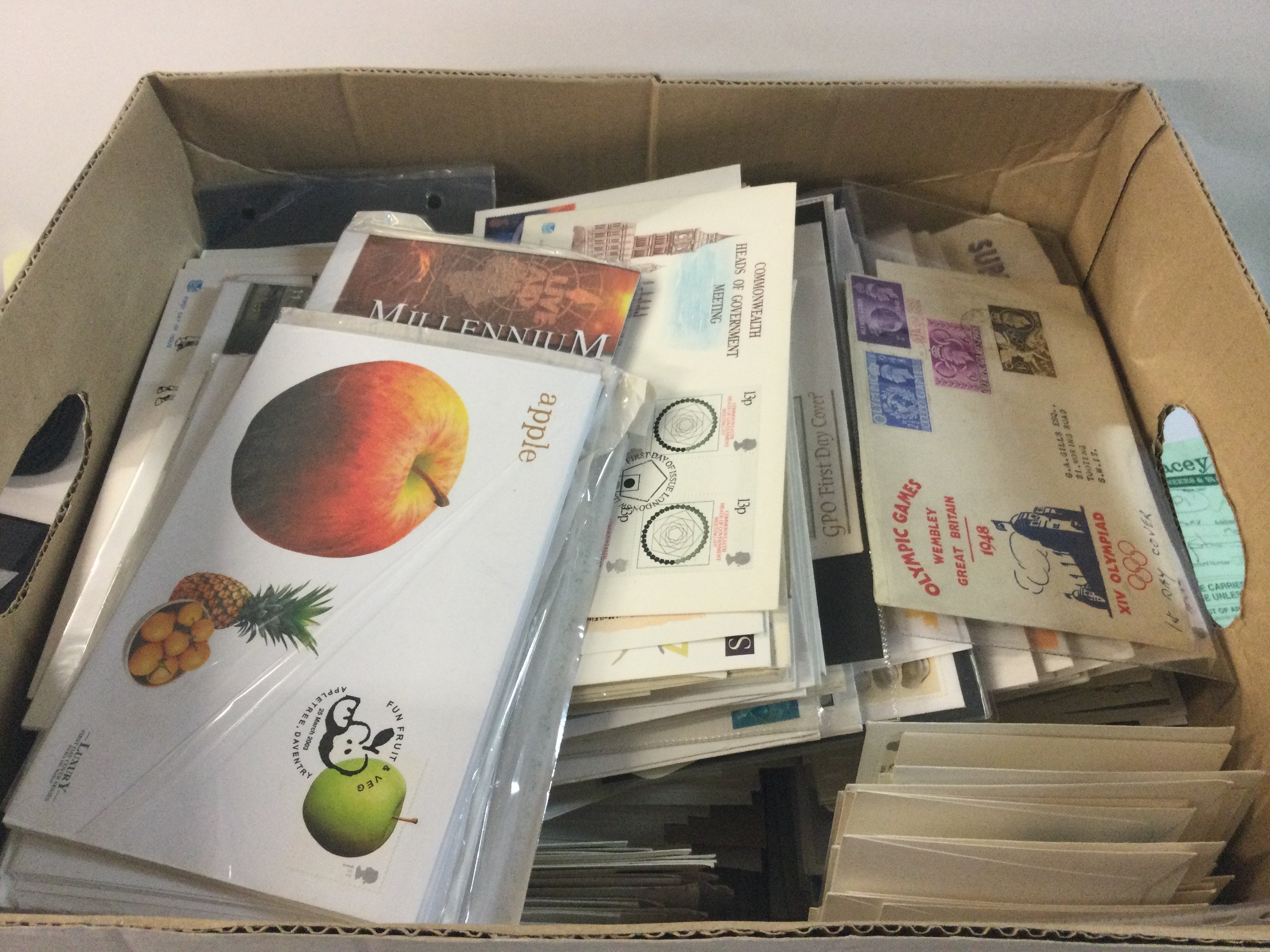A box with a first day covers album and other spare and loose stamps and first day covers.