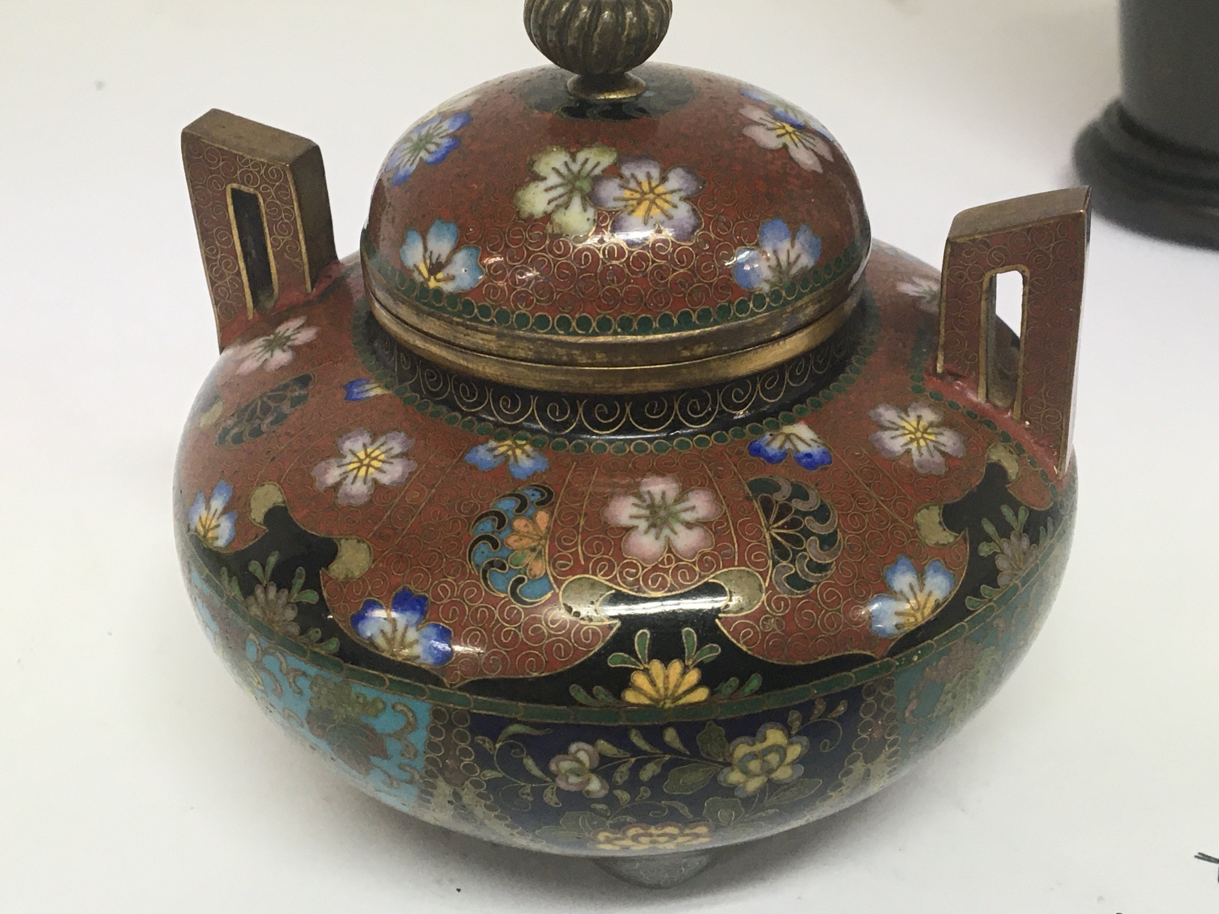 A Quality Japanese cloisonné jar and cover decorated with sprays of flowers. With raised handles. Hight 9cm no obvious damage.