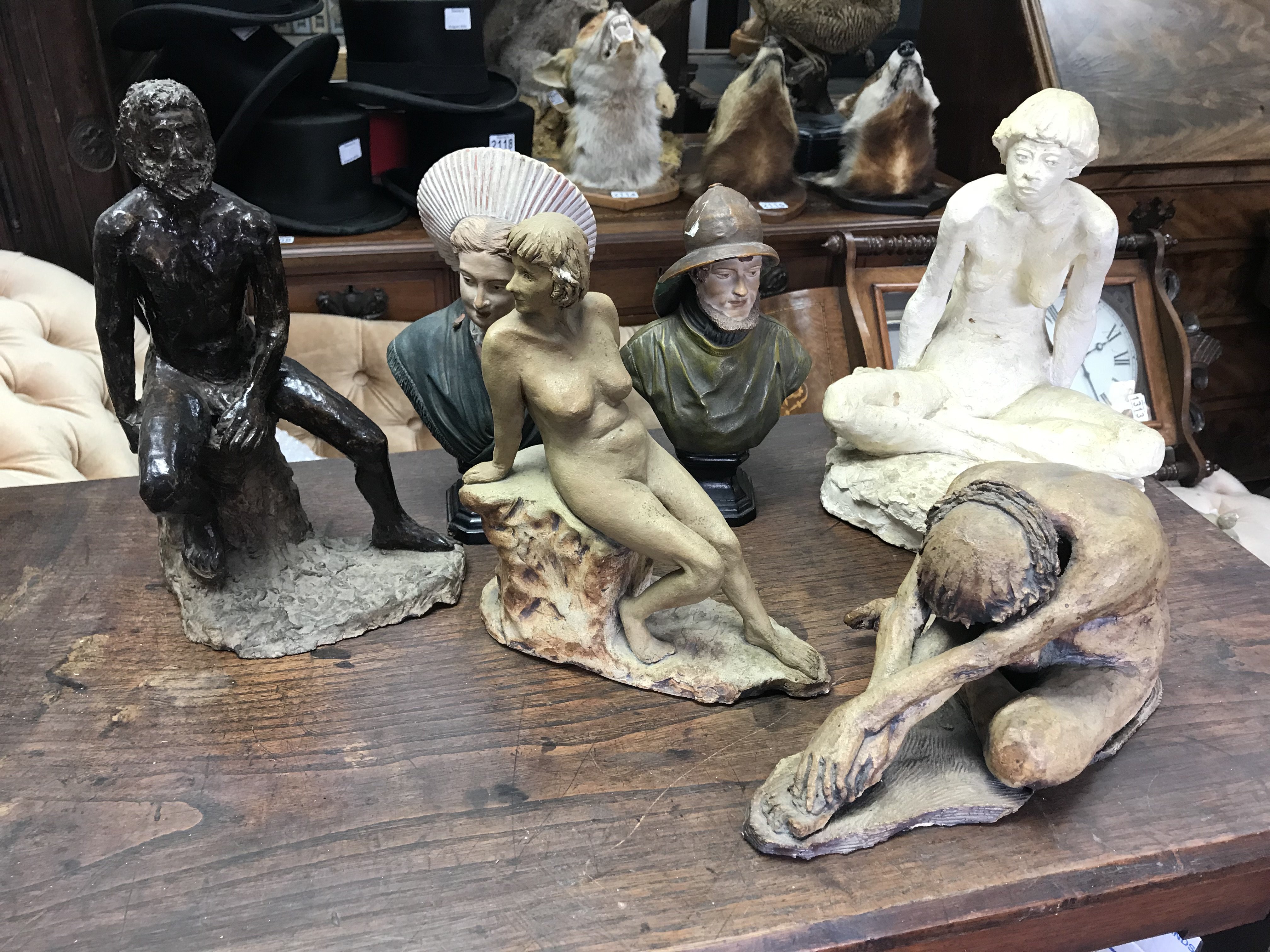 3 studio pottery sculptures each with the initials M.E.B together with a pair of Victorian terracotta busts, 1 fibreglass figure of a seated nude man. (D)