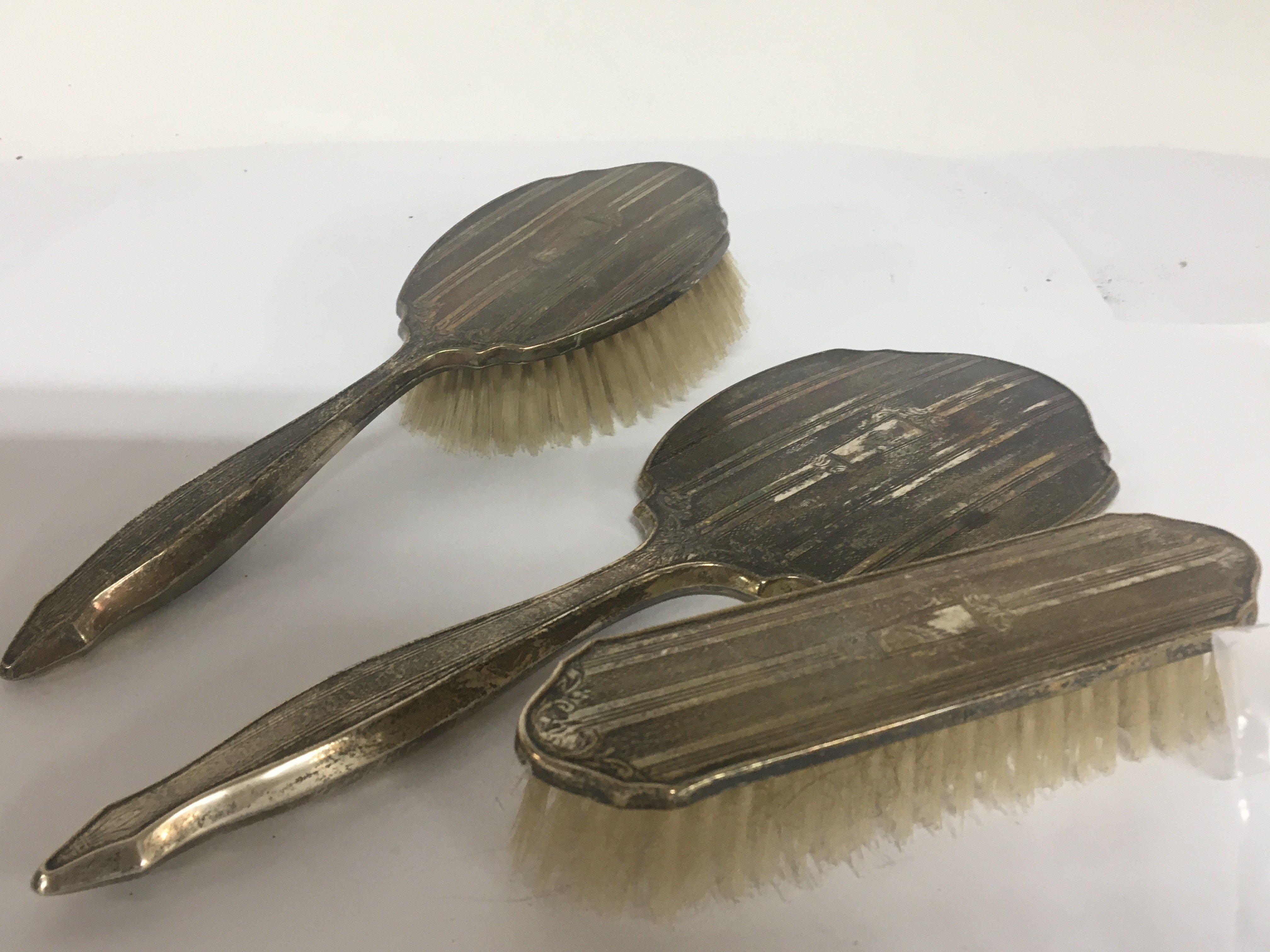 A Silver backed hand mirror and two matching brushes Birmingham hallmarks (3)