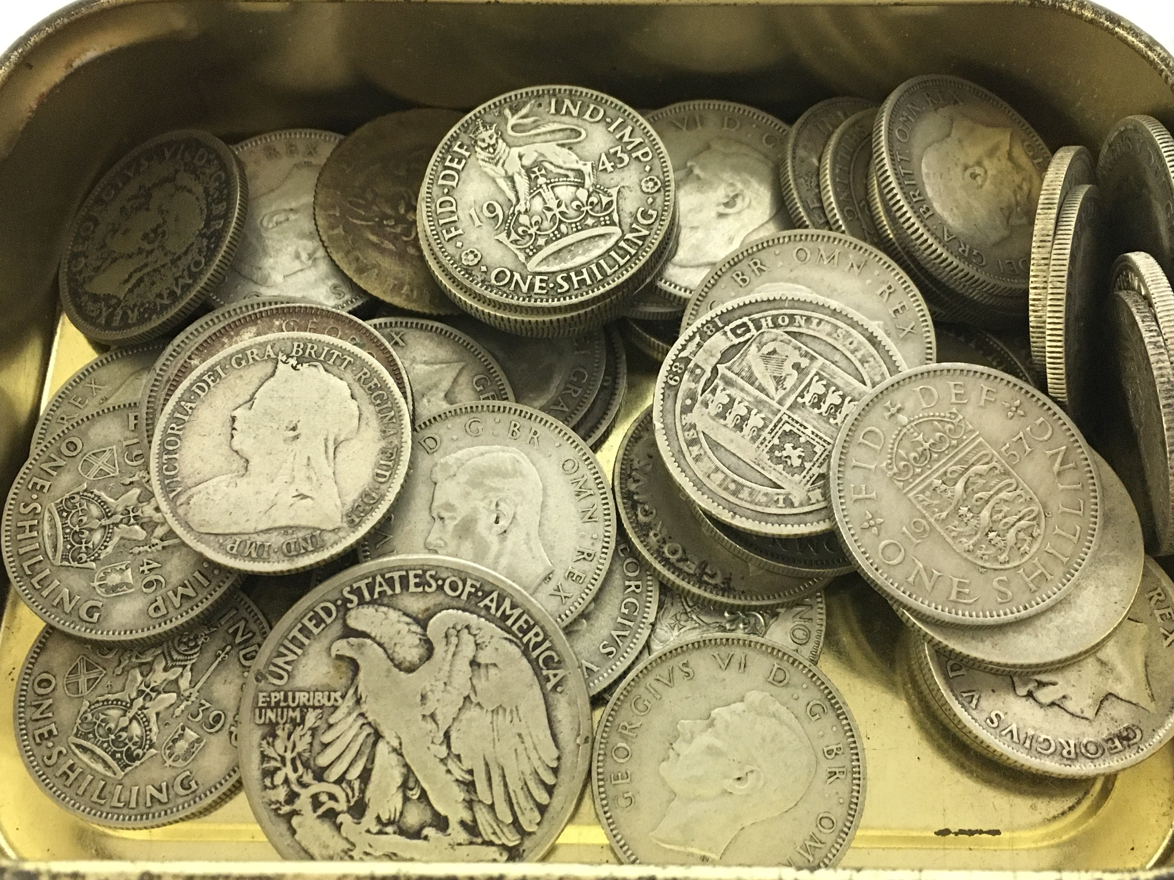 A tin of pre 1946 silver coinage, mostly Shillings. Postage category A