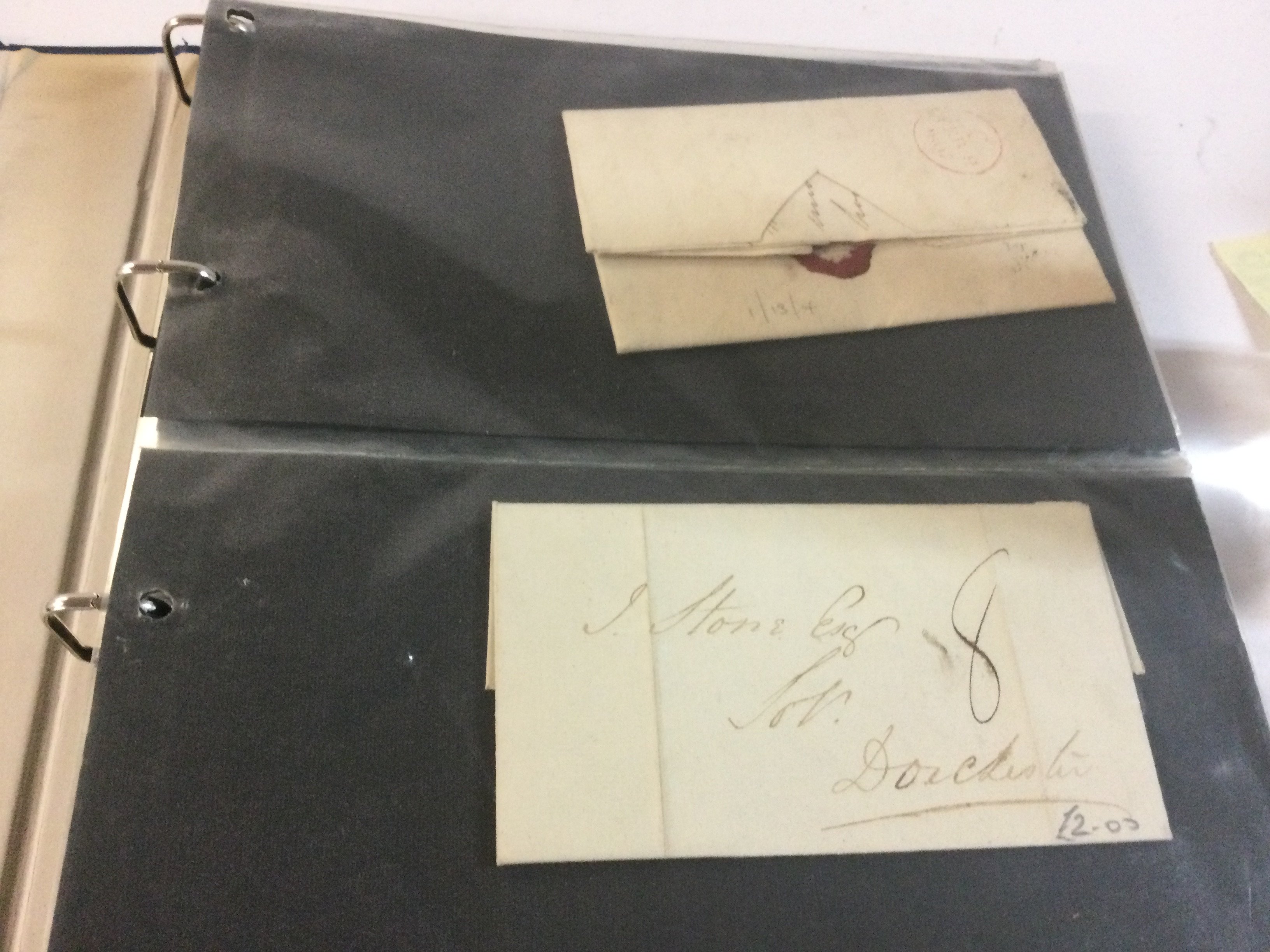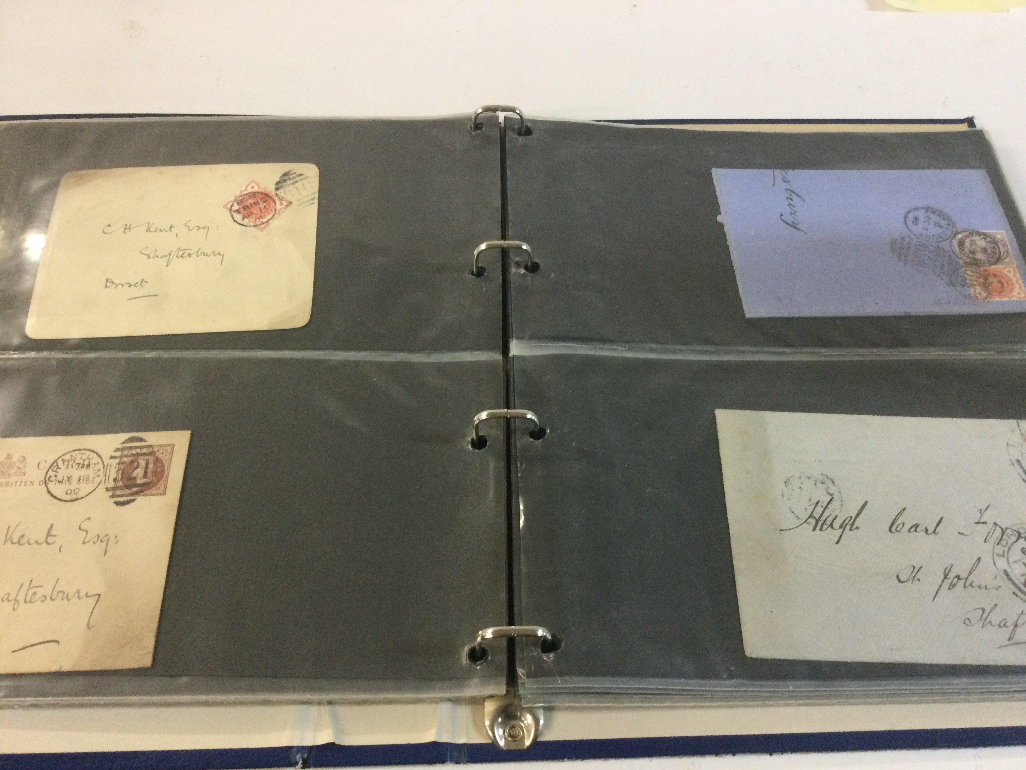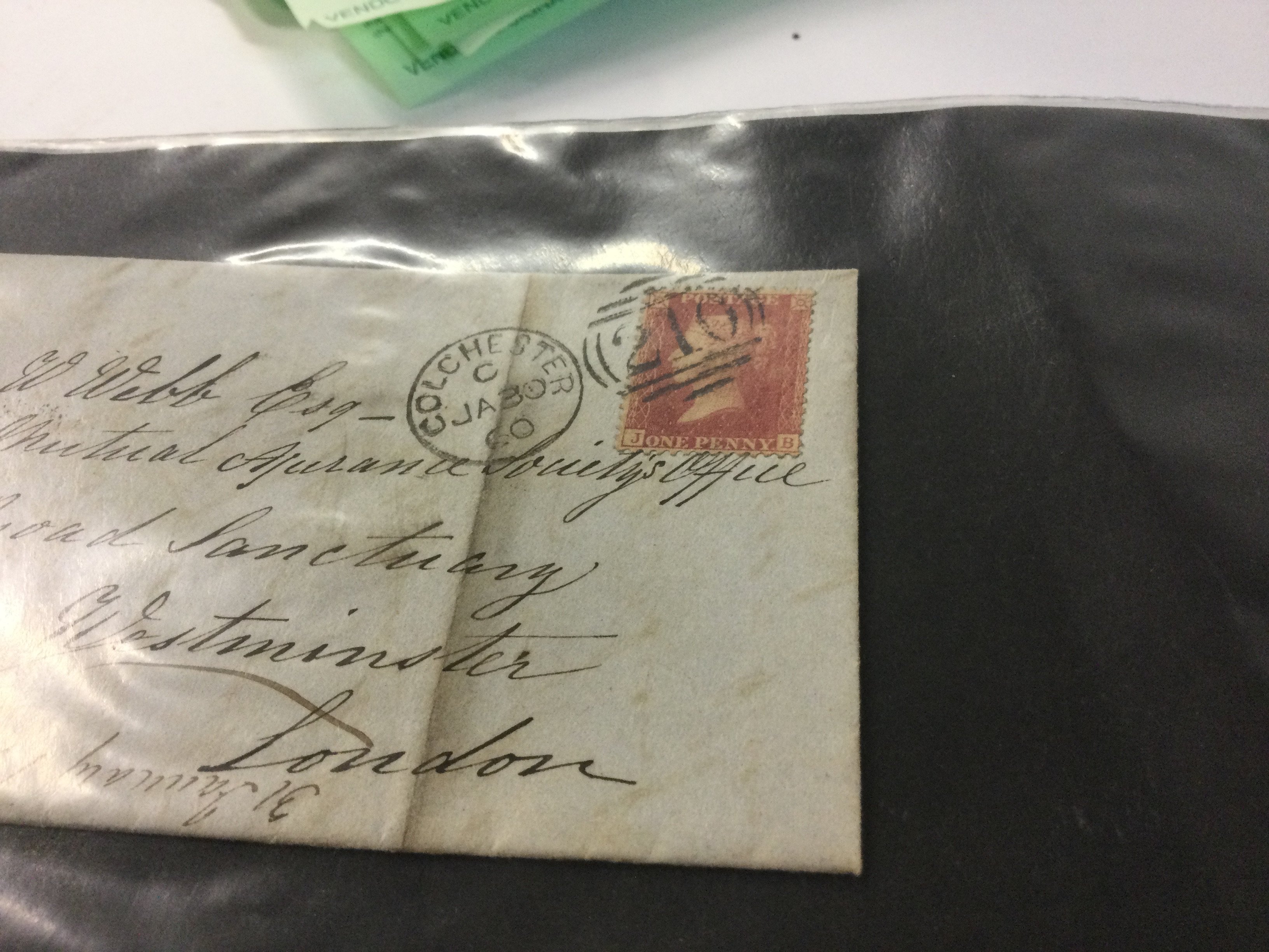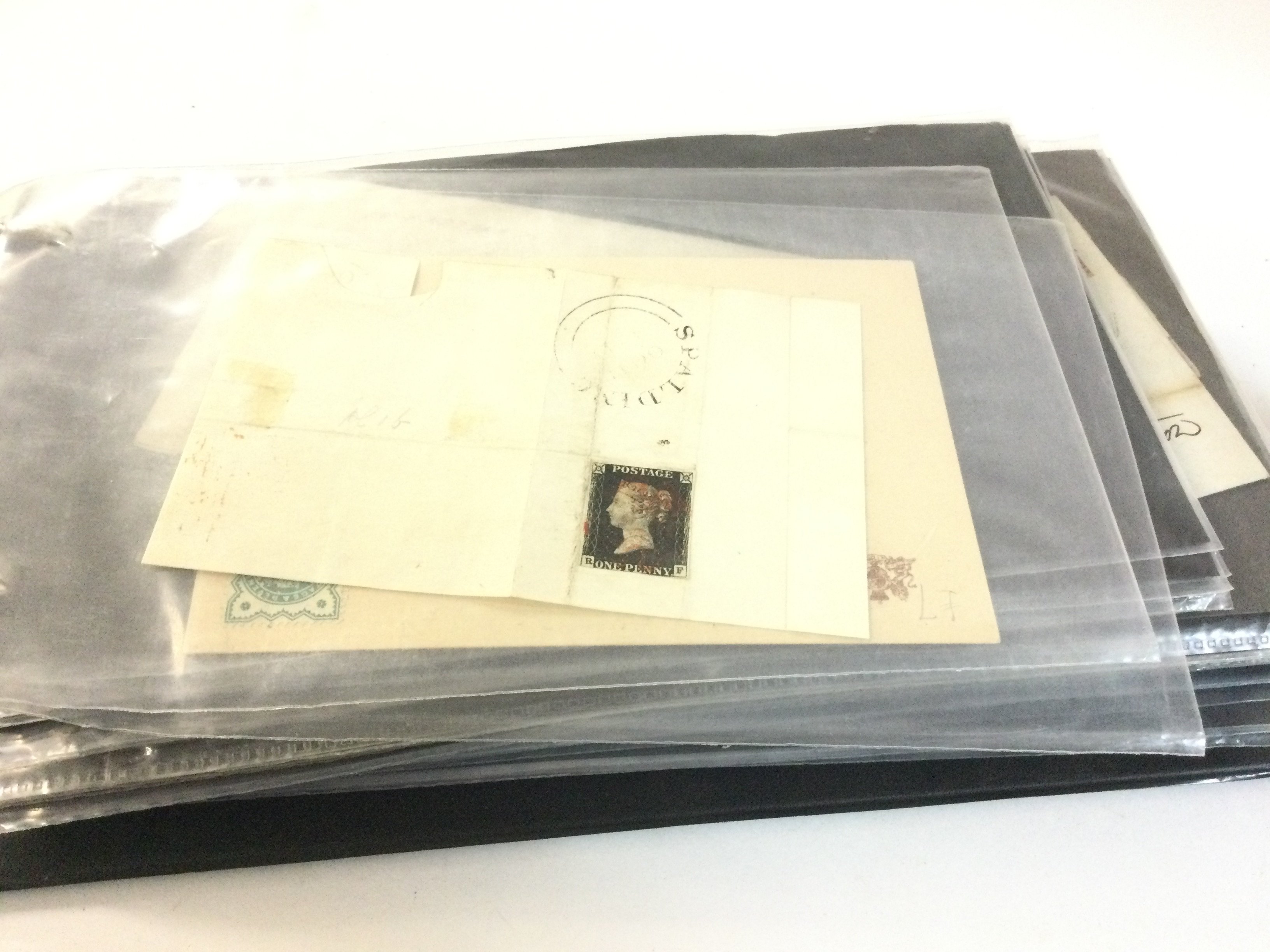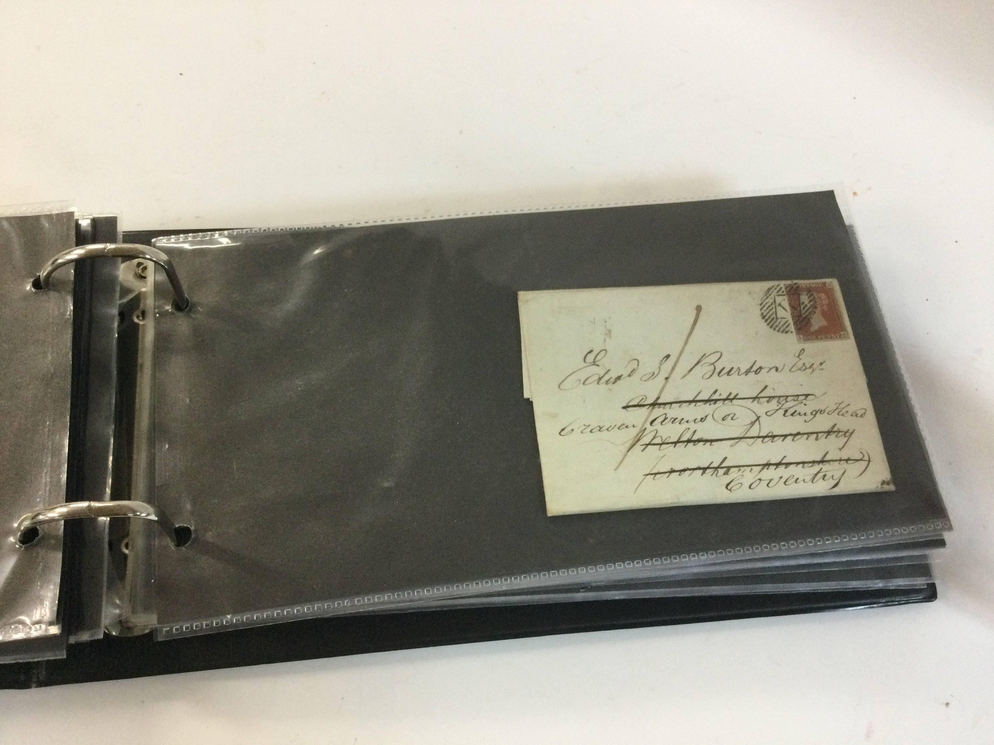A stamp album of Victorian covers including a black penny stamp and other various stamps from the 1800s.