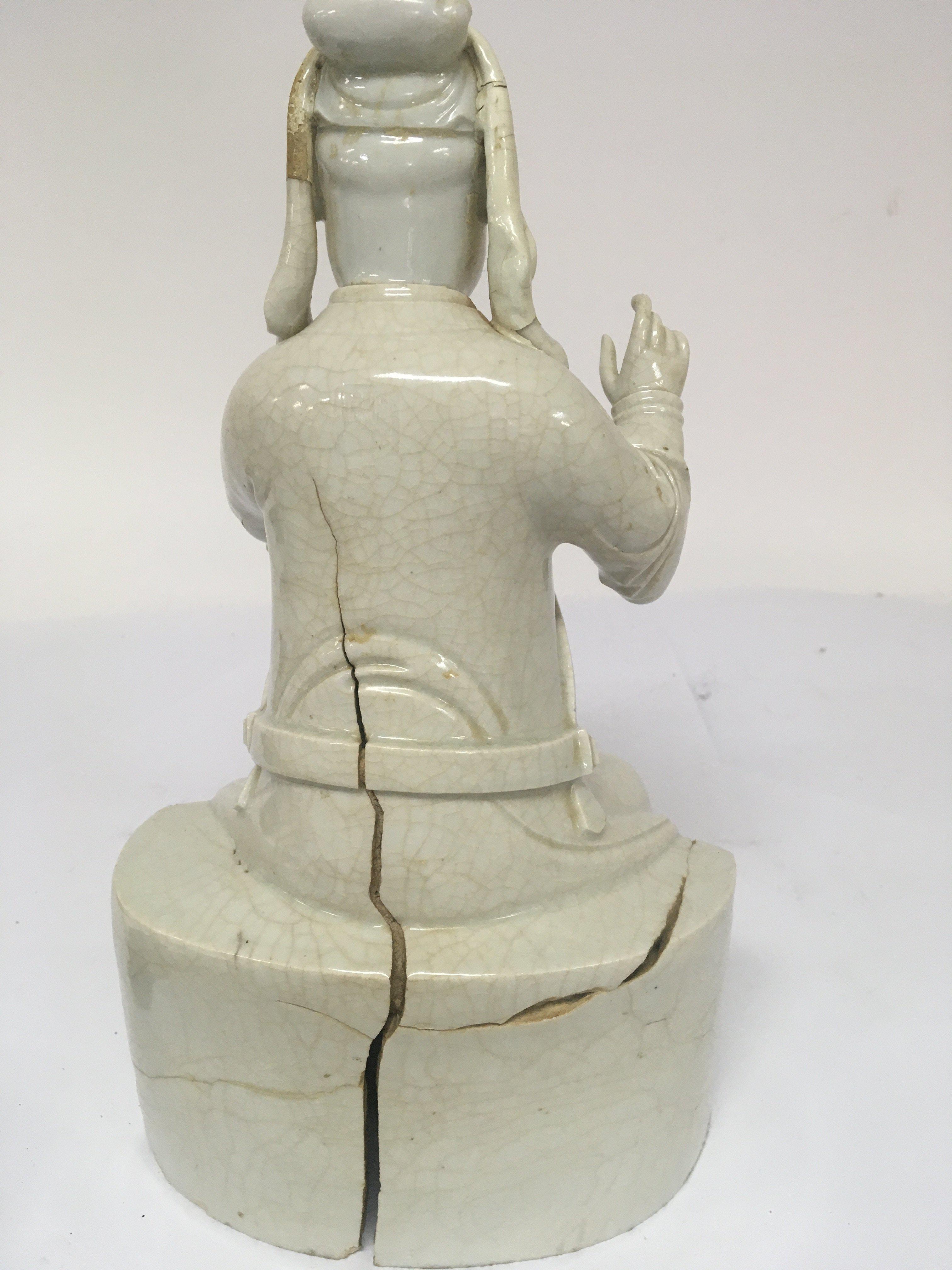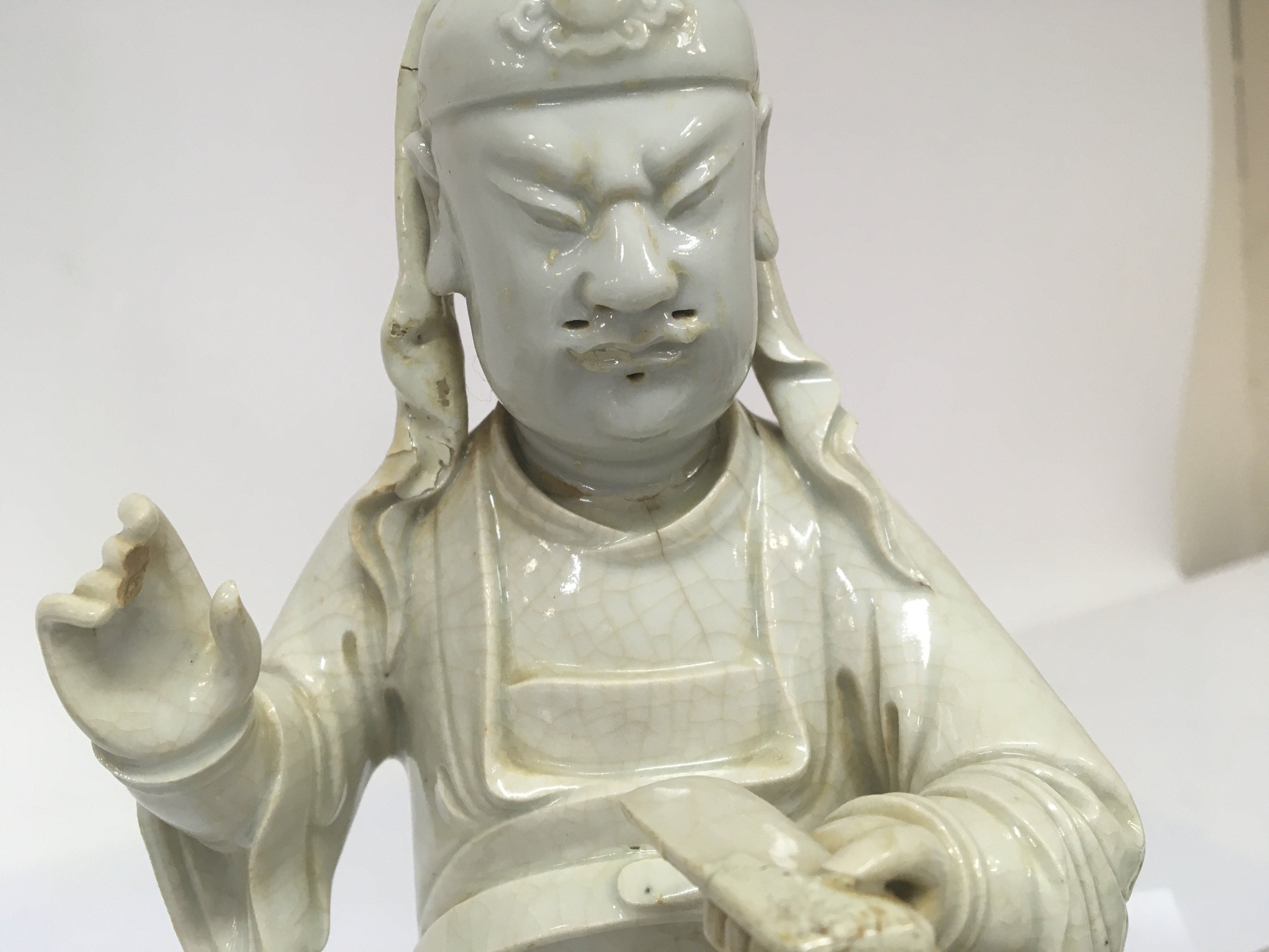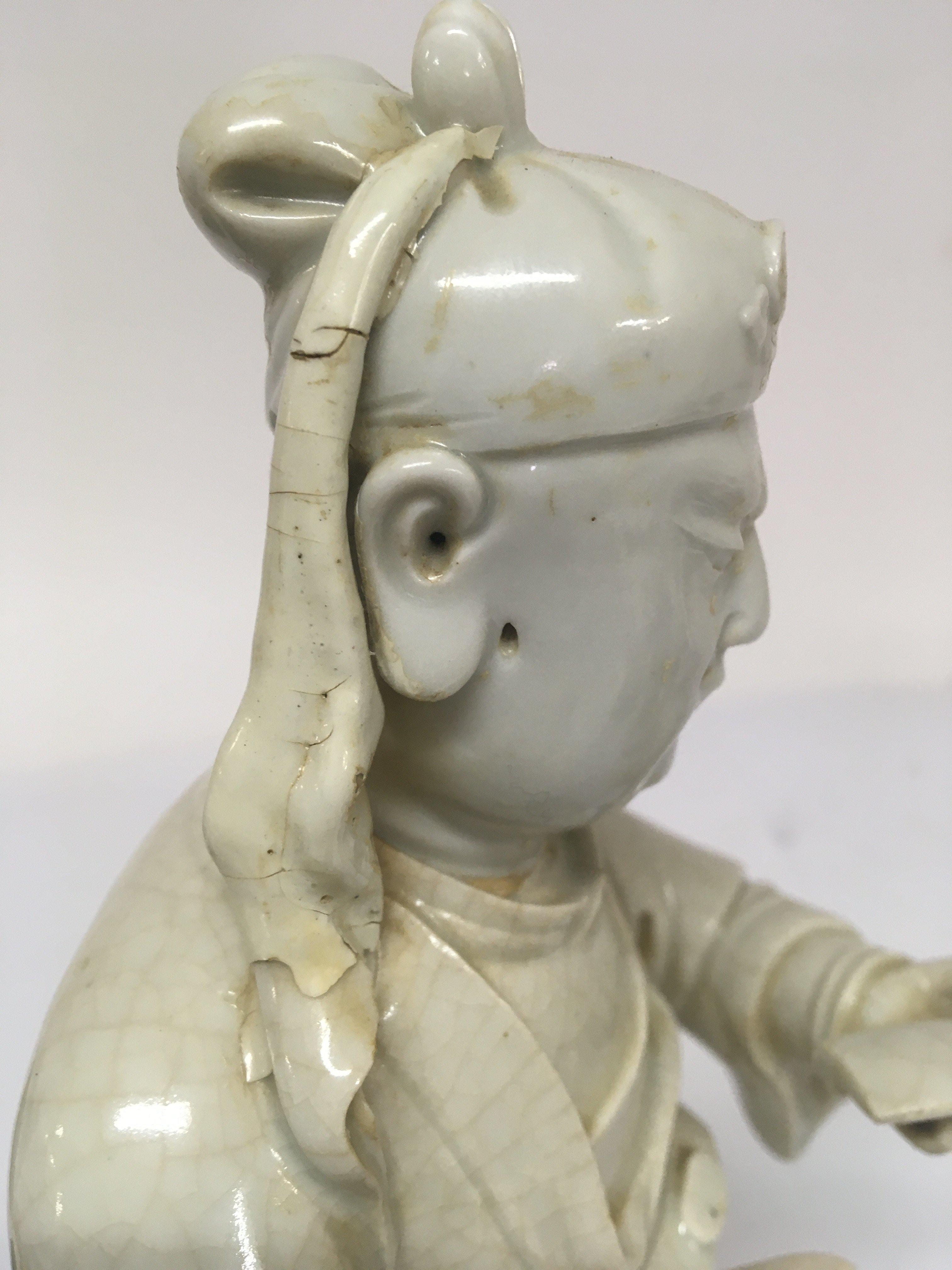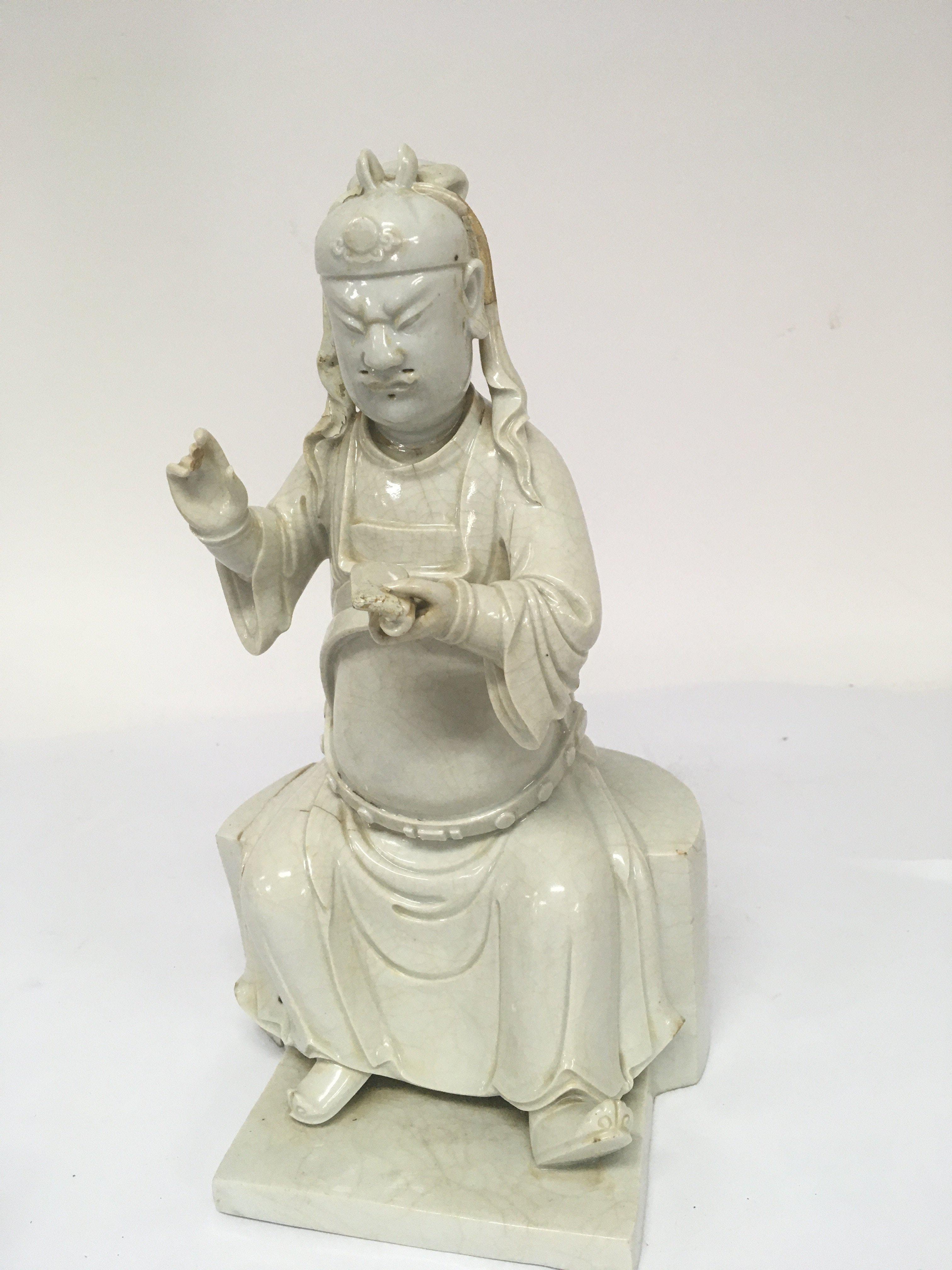 A Chinese Blanc de Chine figure of the god of war Guandi the figure possible 18th century or earlier. The seated figure holding a scroll height 29cm. Has damage and restoration and a large firing crack to the reverse the glaze crackled.