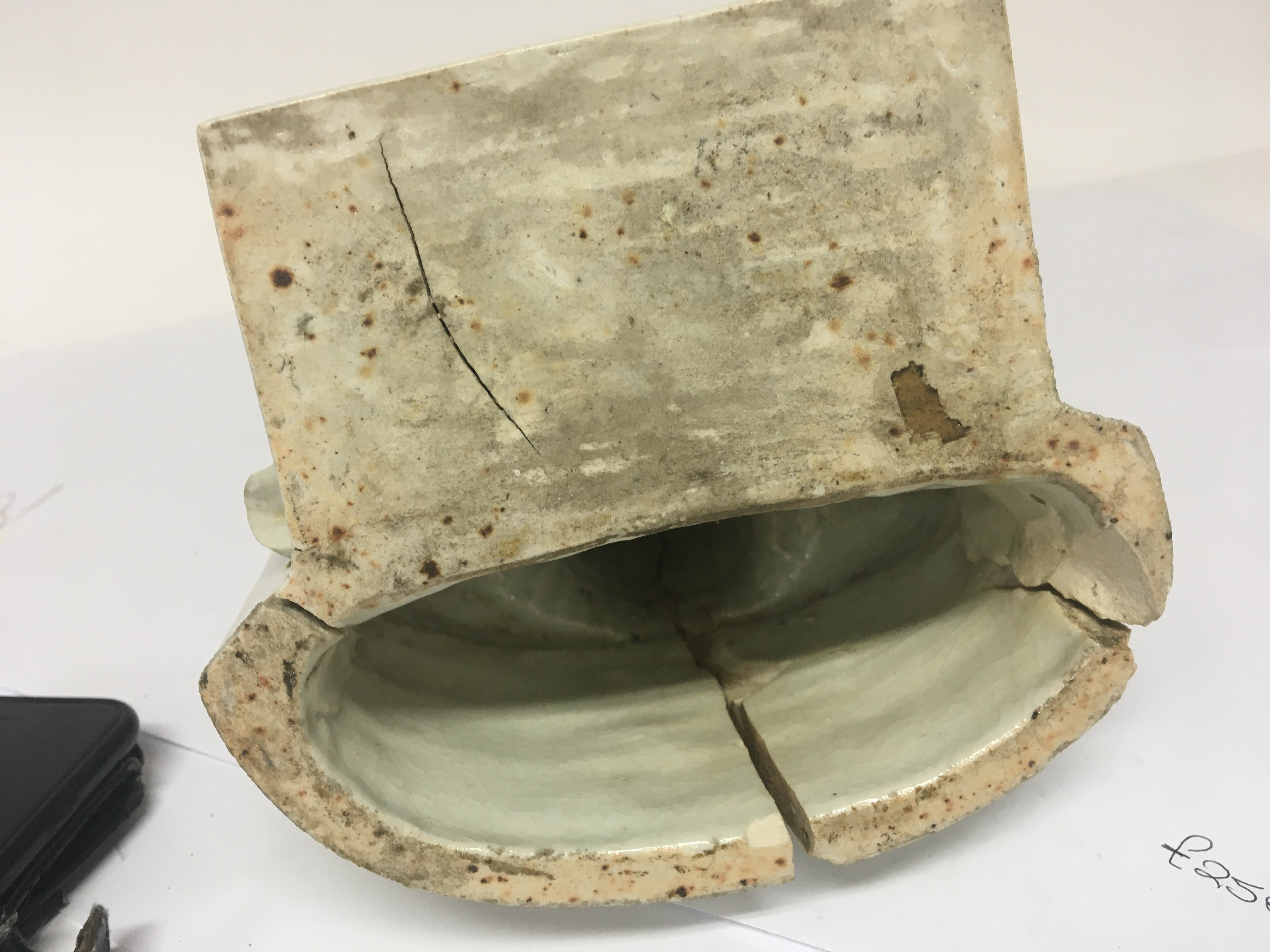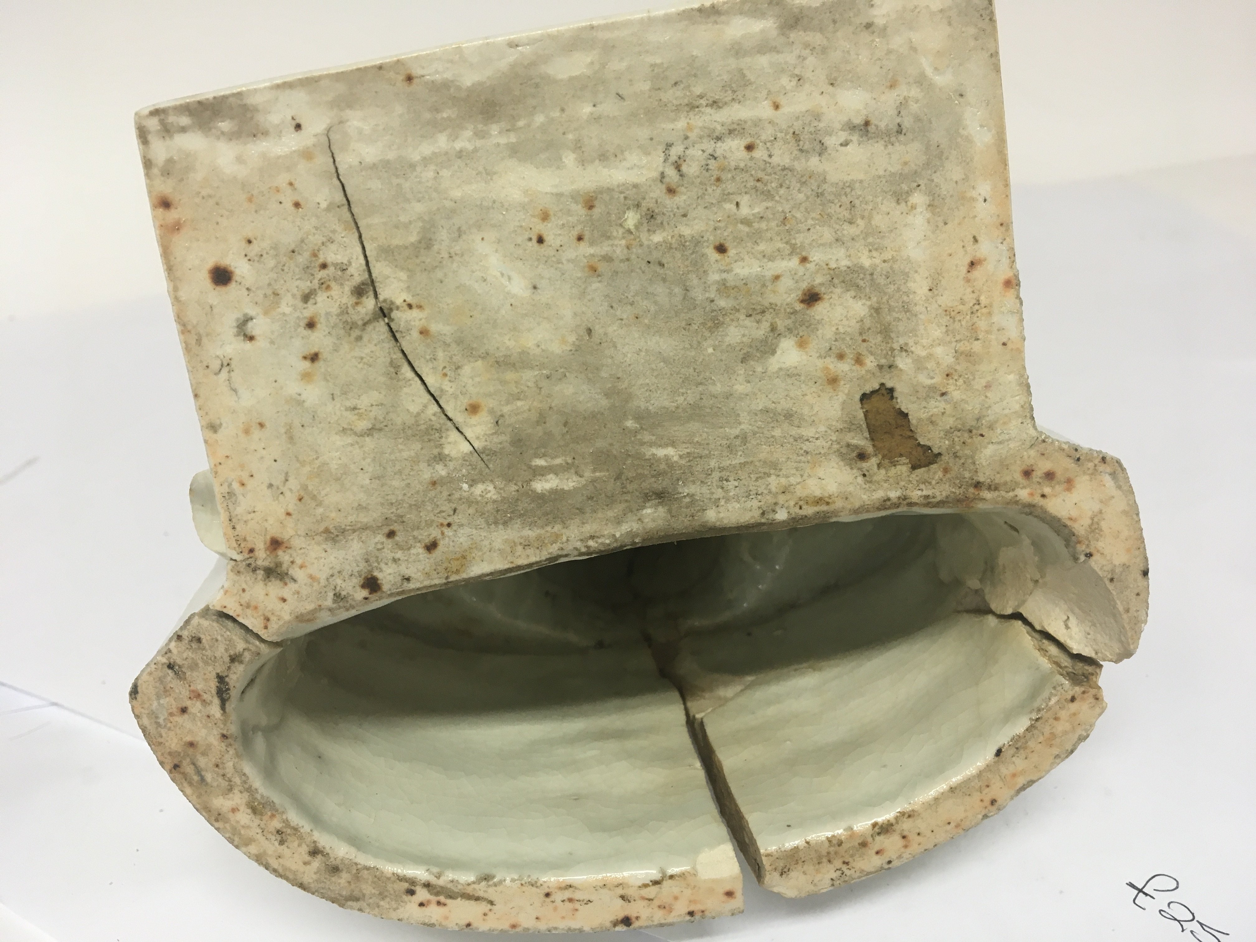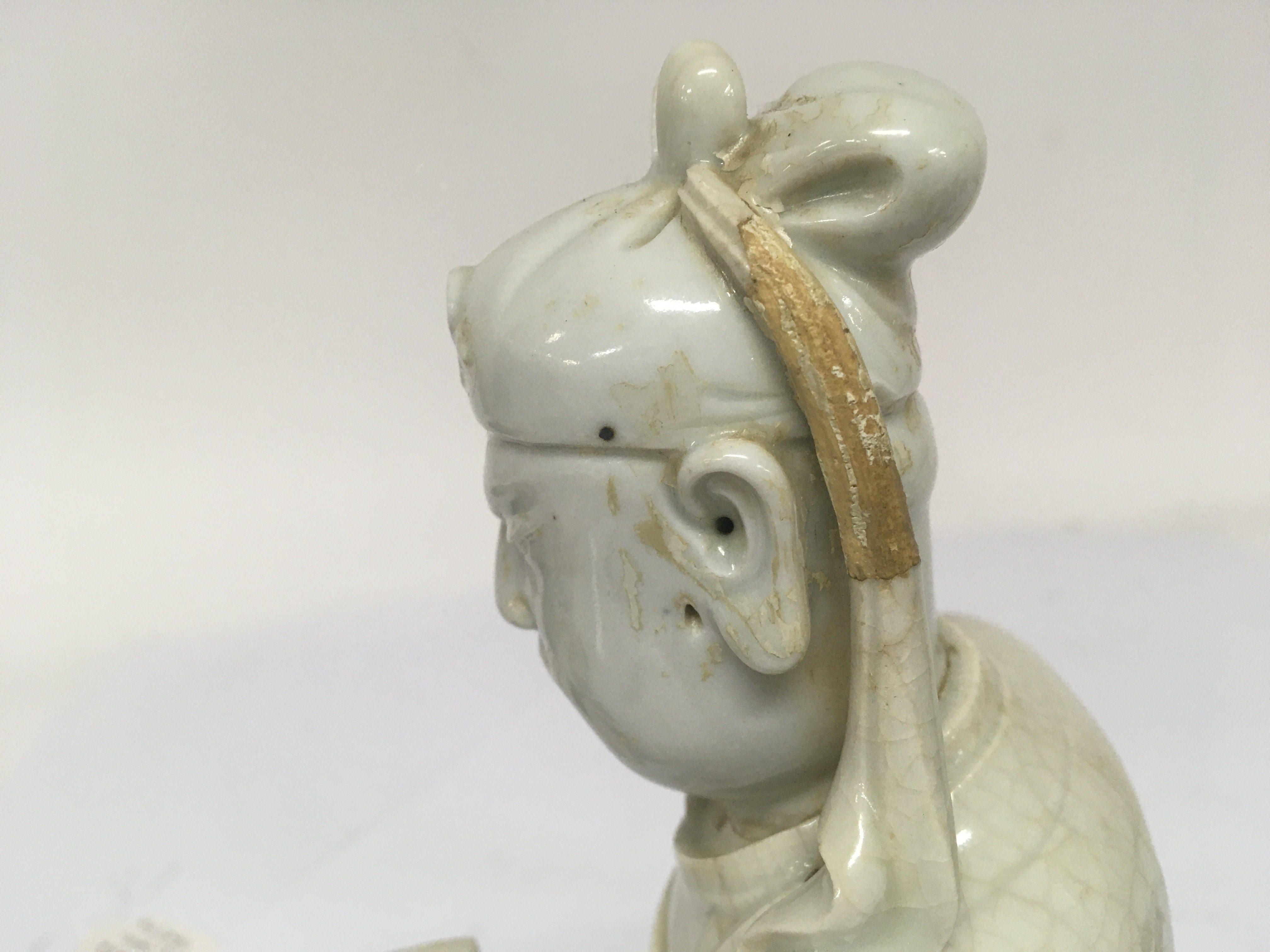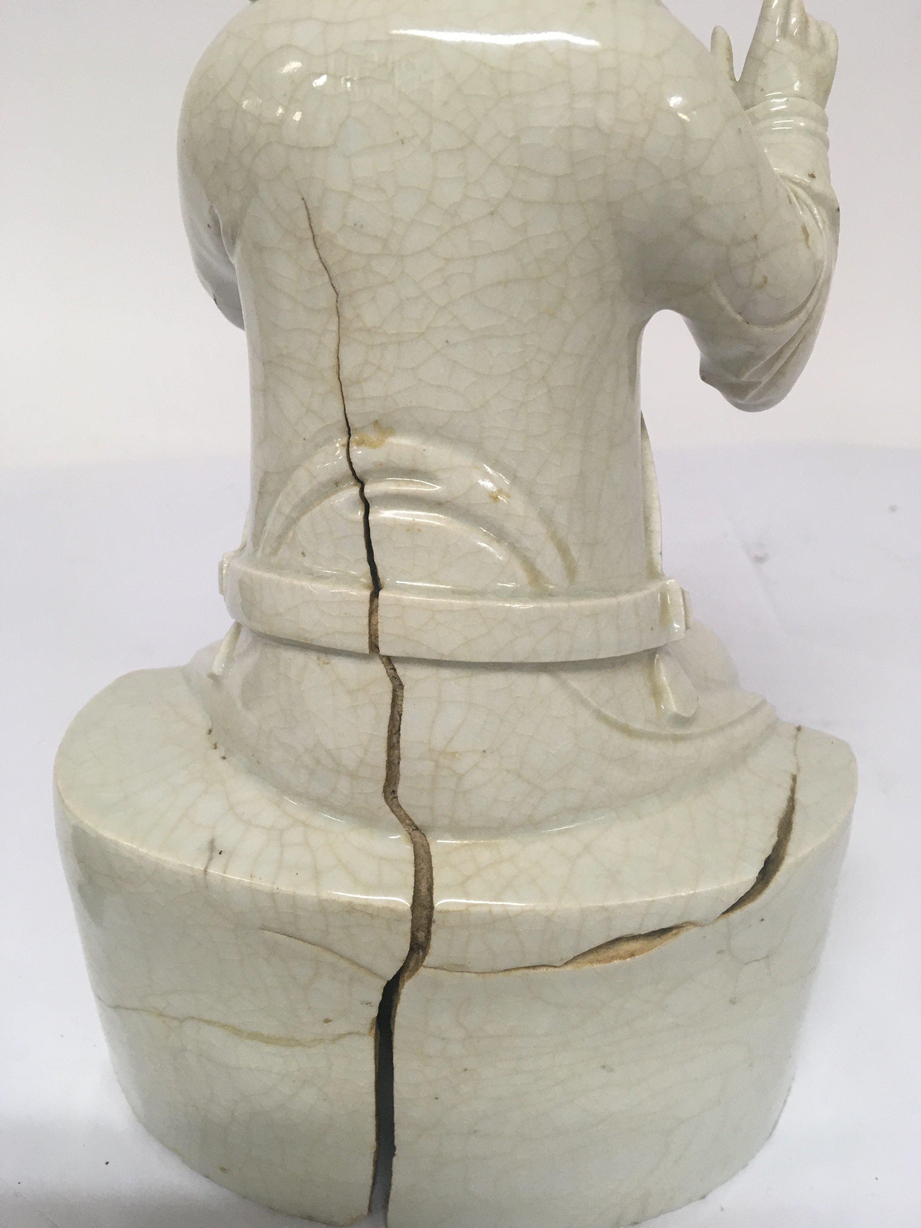 A Chinese Blanc de Chine figure of the god of war Guandi the figure possible 18th century or earlier. The seated figure holding a scroll height 29cm. Has damage and restoration and a large firing crack to the reverse the glaze crackled.