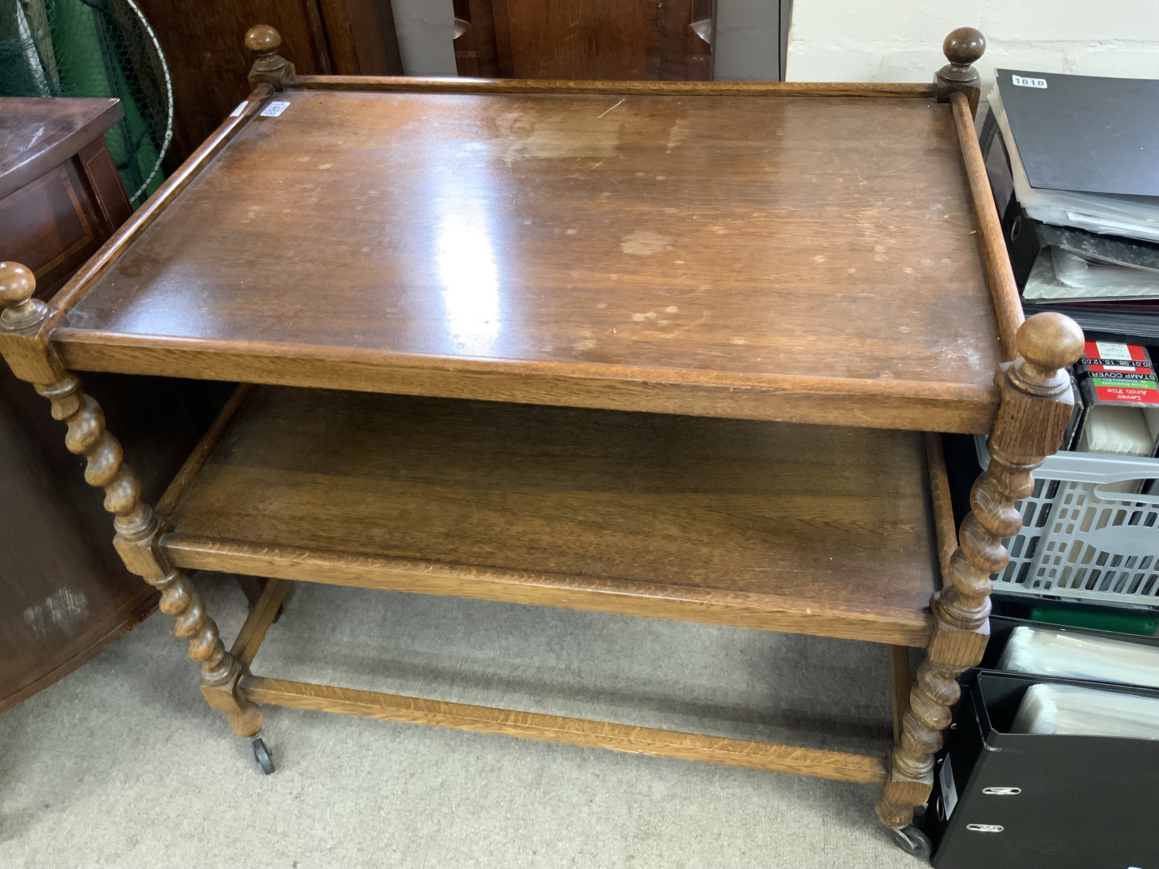 A large 1930s oak tea trolley with barley twist supports. 90cm x 60.5cm x 82cm