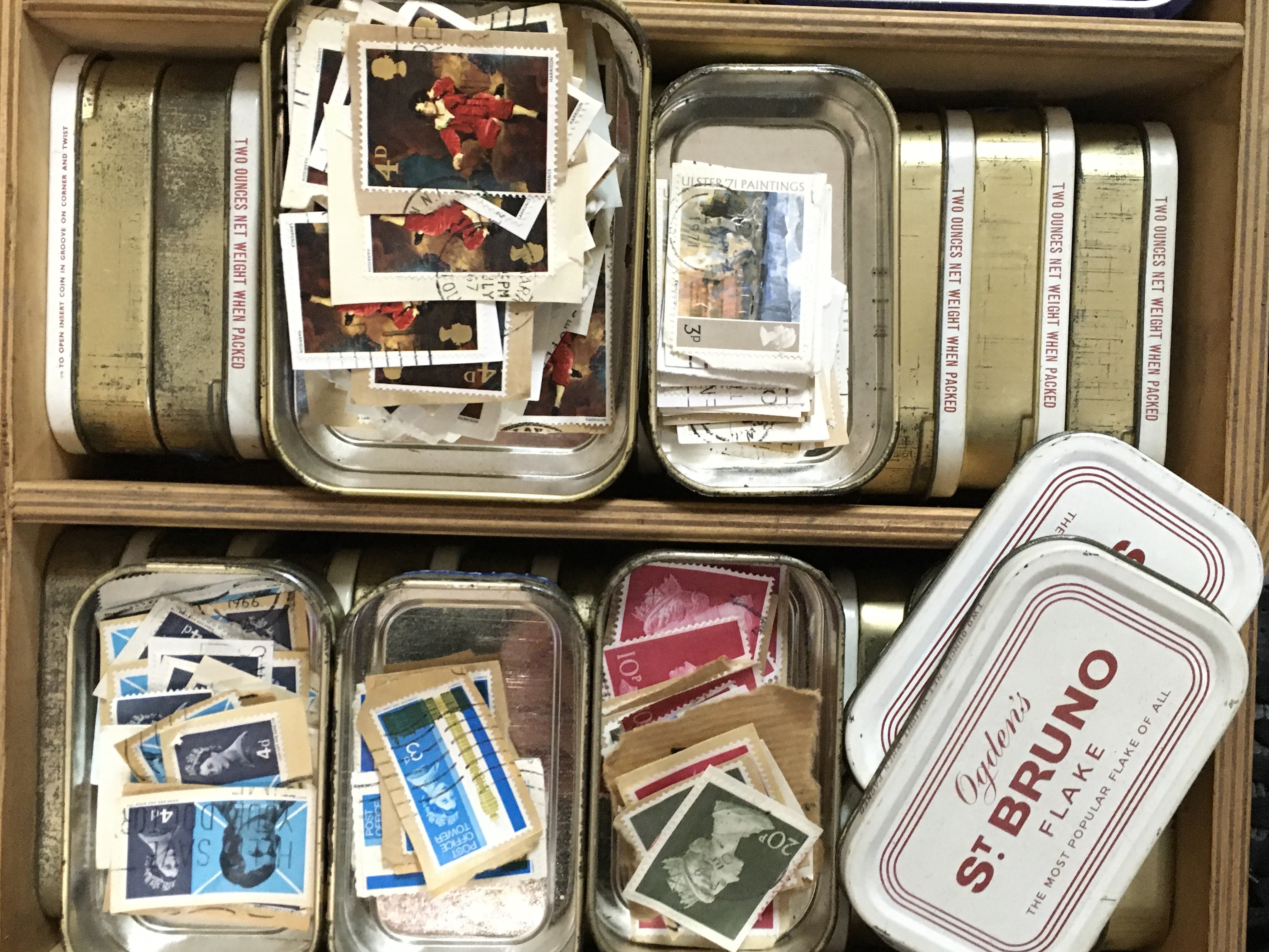 A collection of first day covers including some Victorian examples and tins containing loose stamps