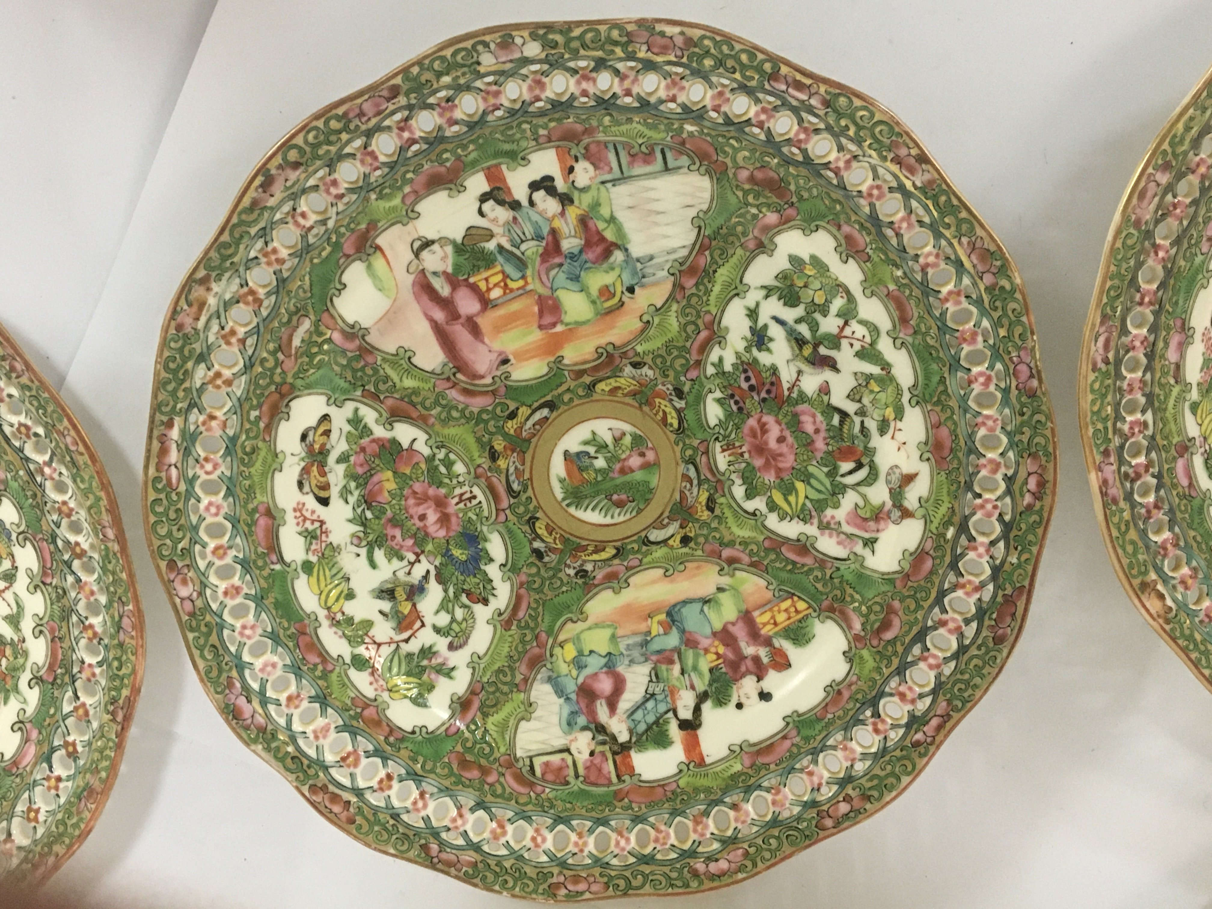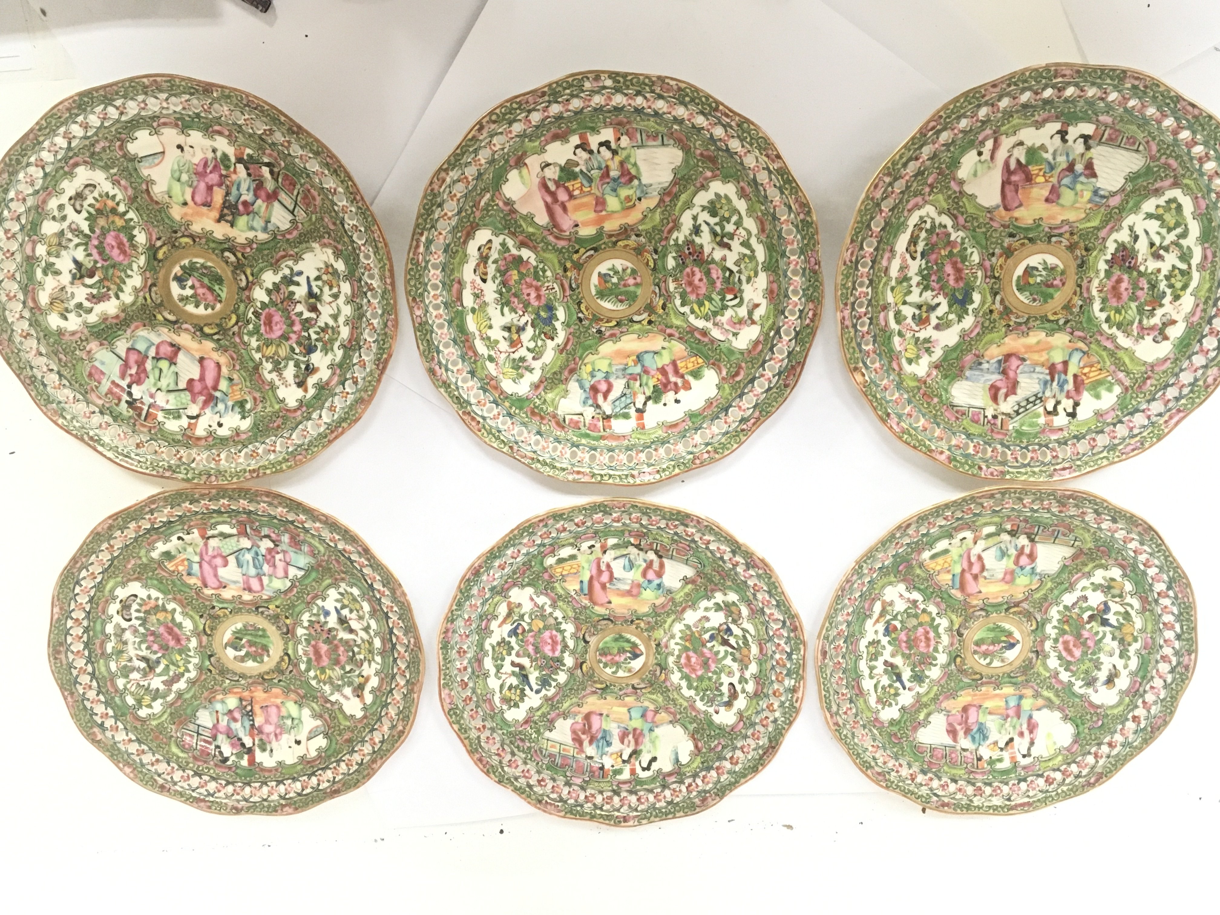 A set of six 19th Cantonese style or Cantonese decorated famille rose ribbon plates decorated with alternating panels of figures flowers and foliage diameter 22.5cm no obvious damage.