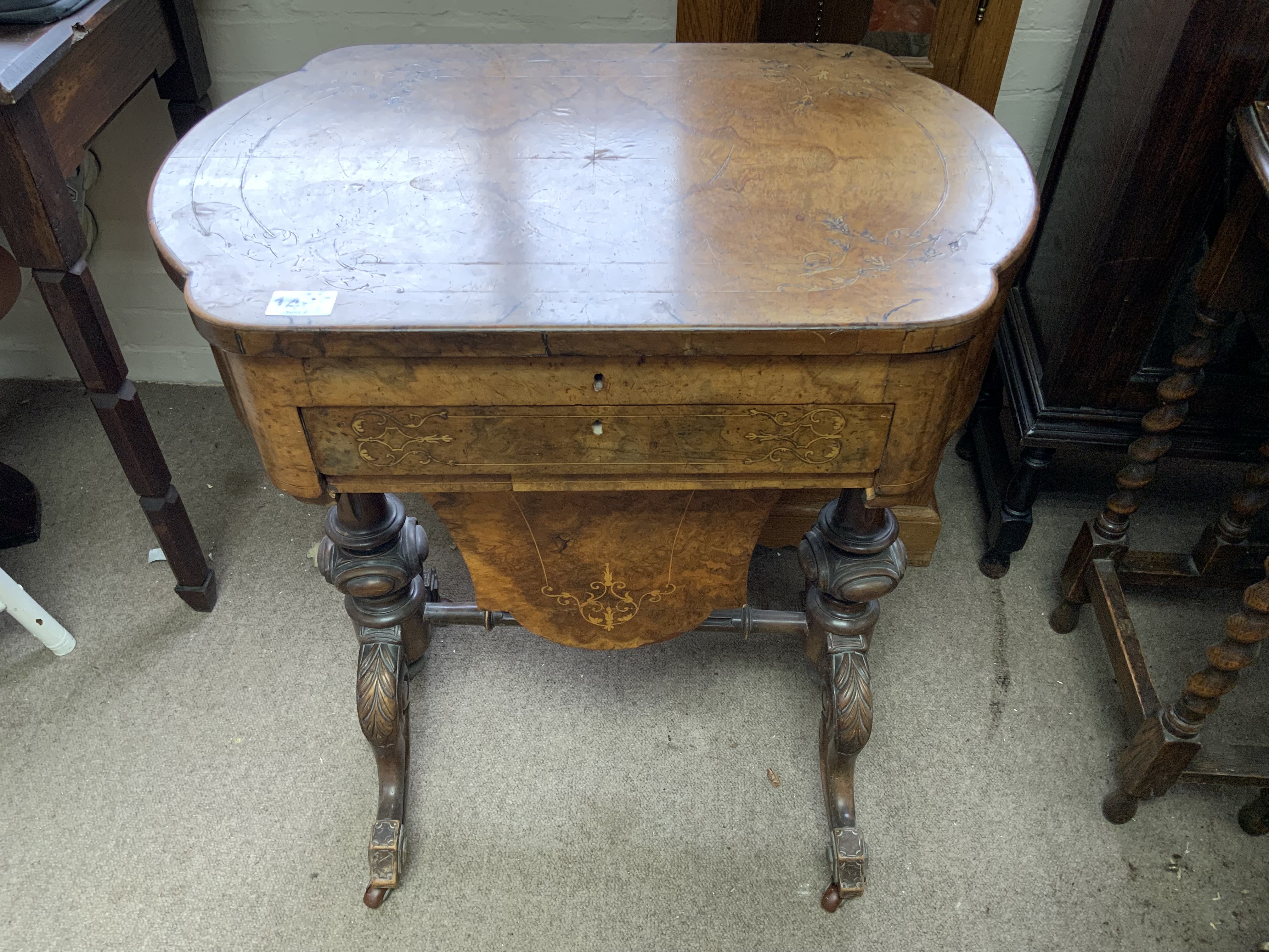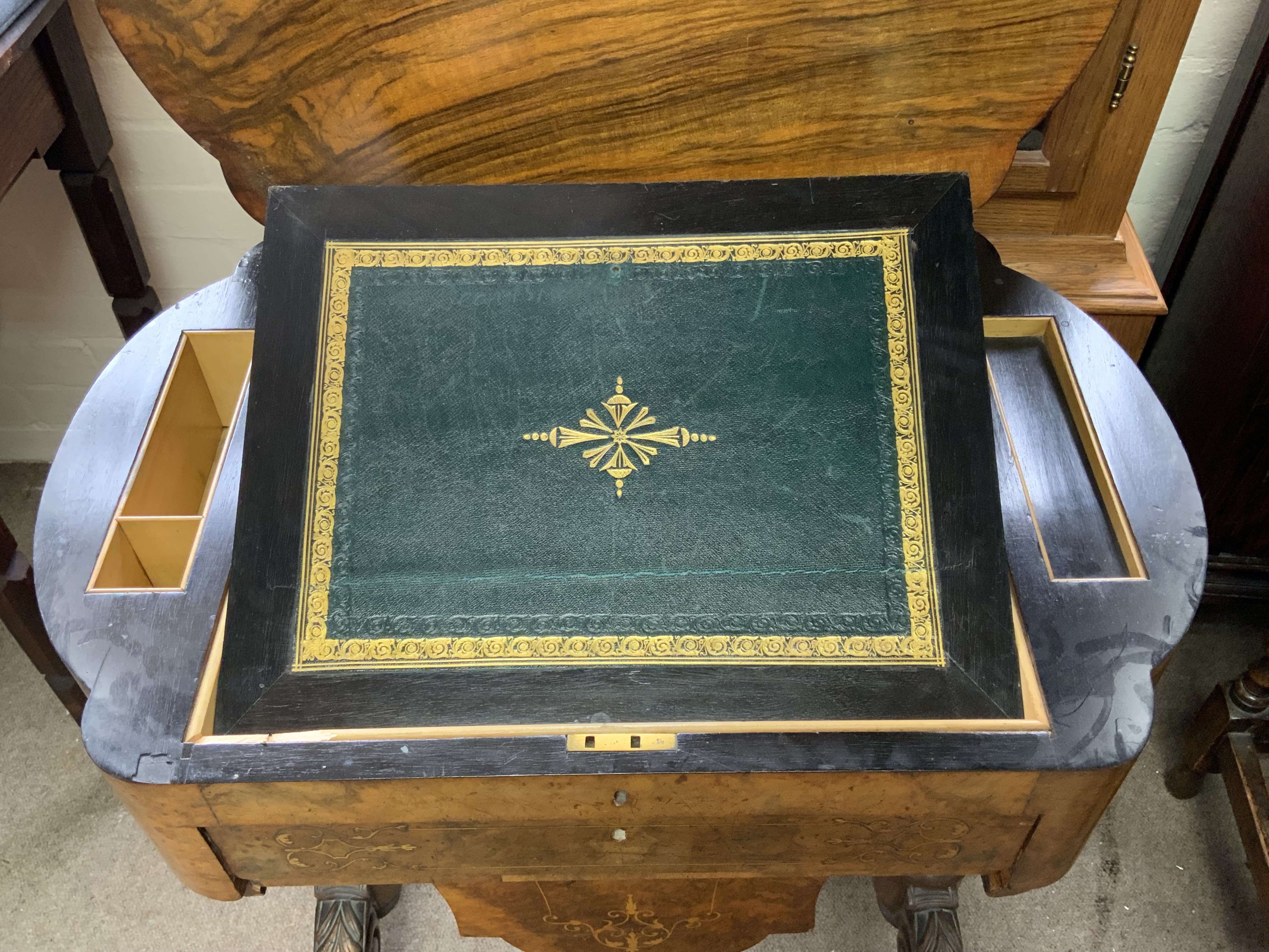 A Victorian Walnut workbox and writing slope. 62cm x 41cm x 76cm, in need of some restoration.