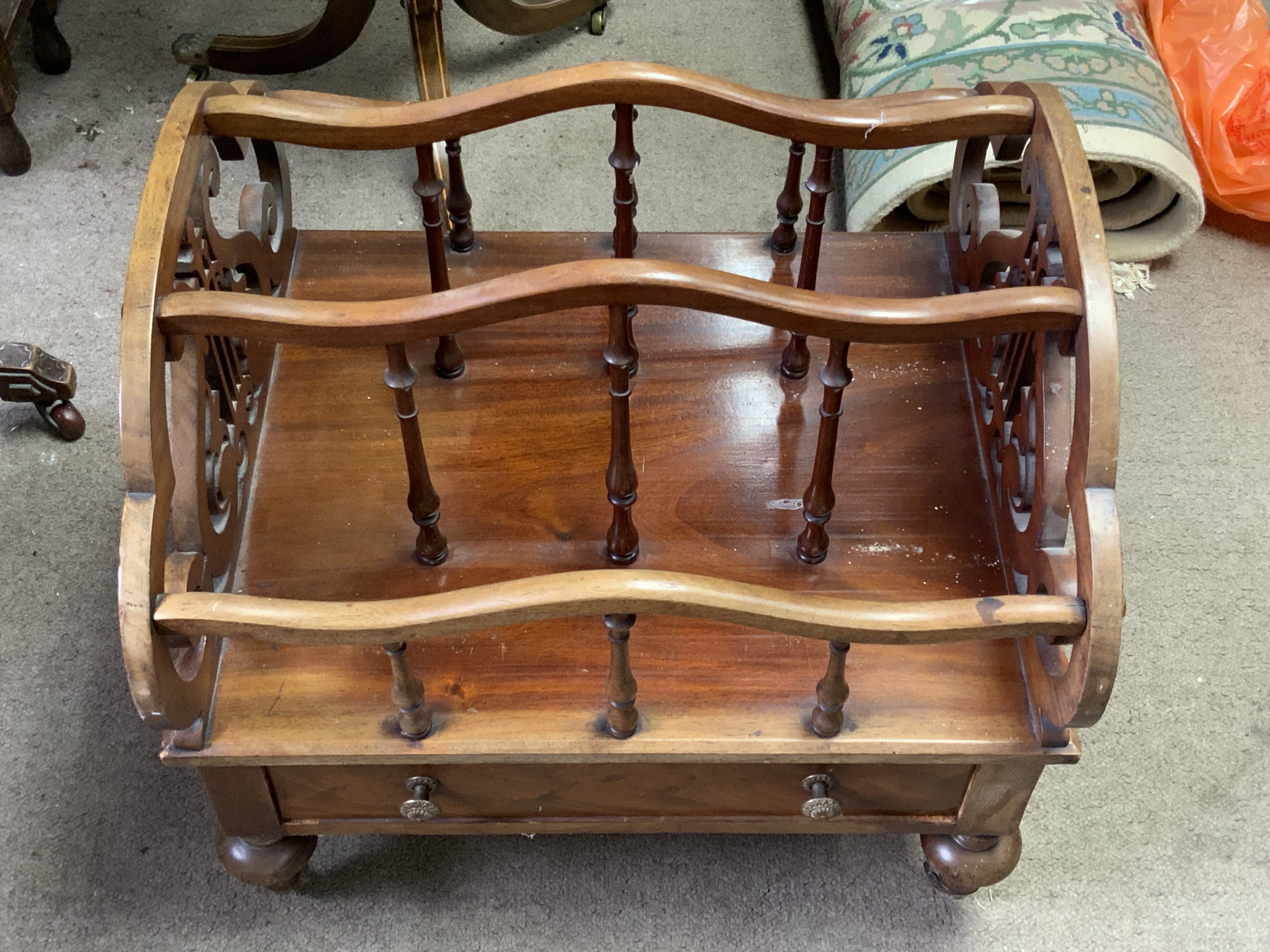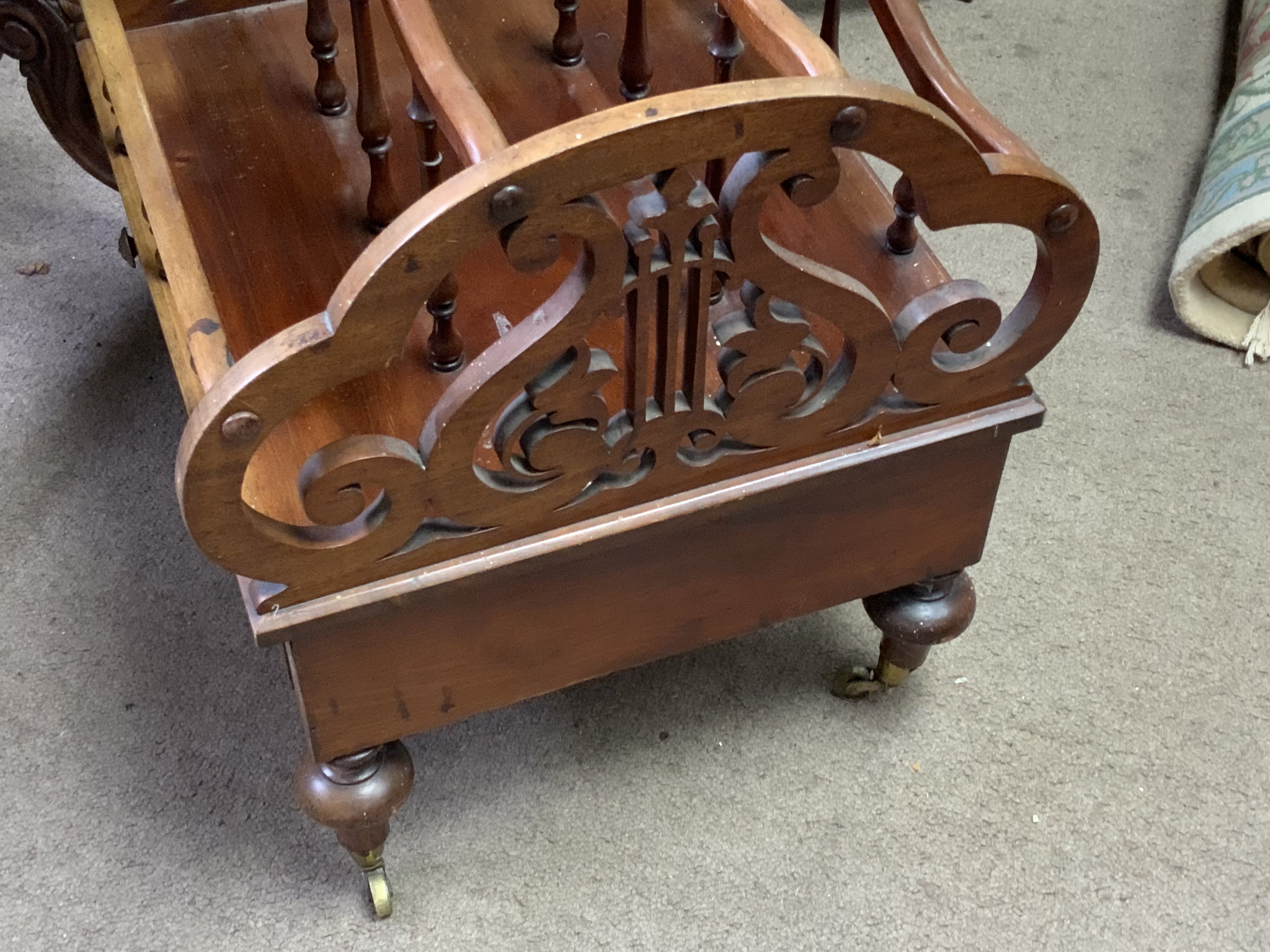A Victorian walnut Canterbury with lyre form fretwork sides.