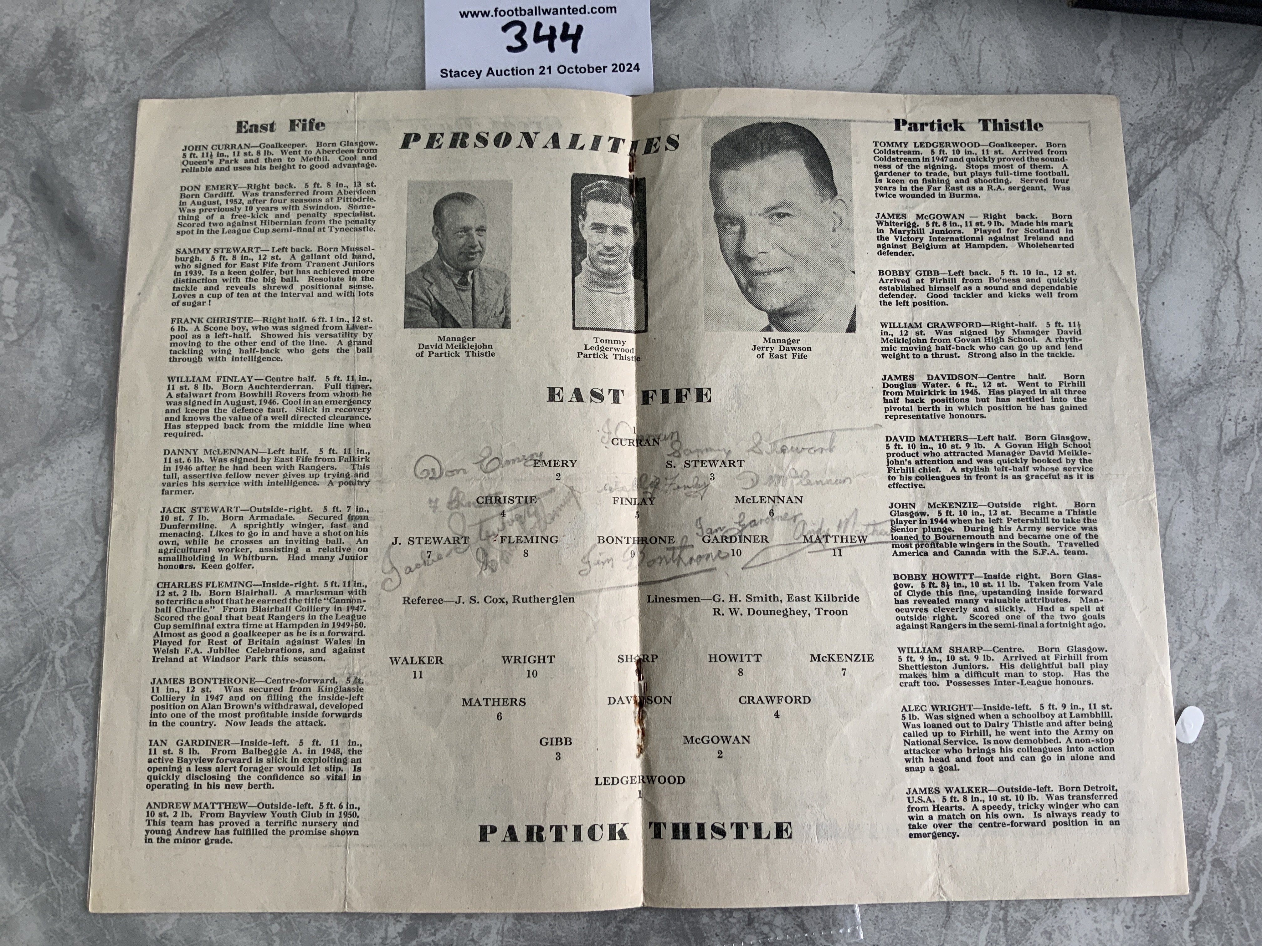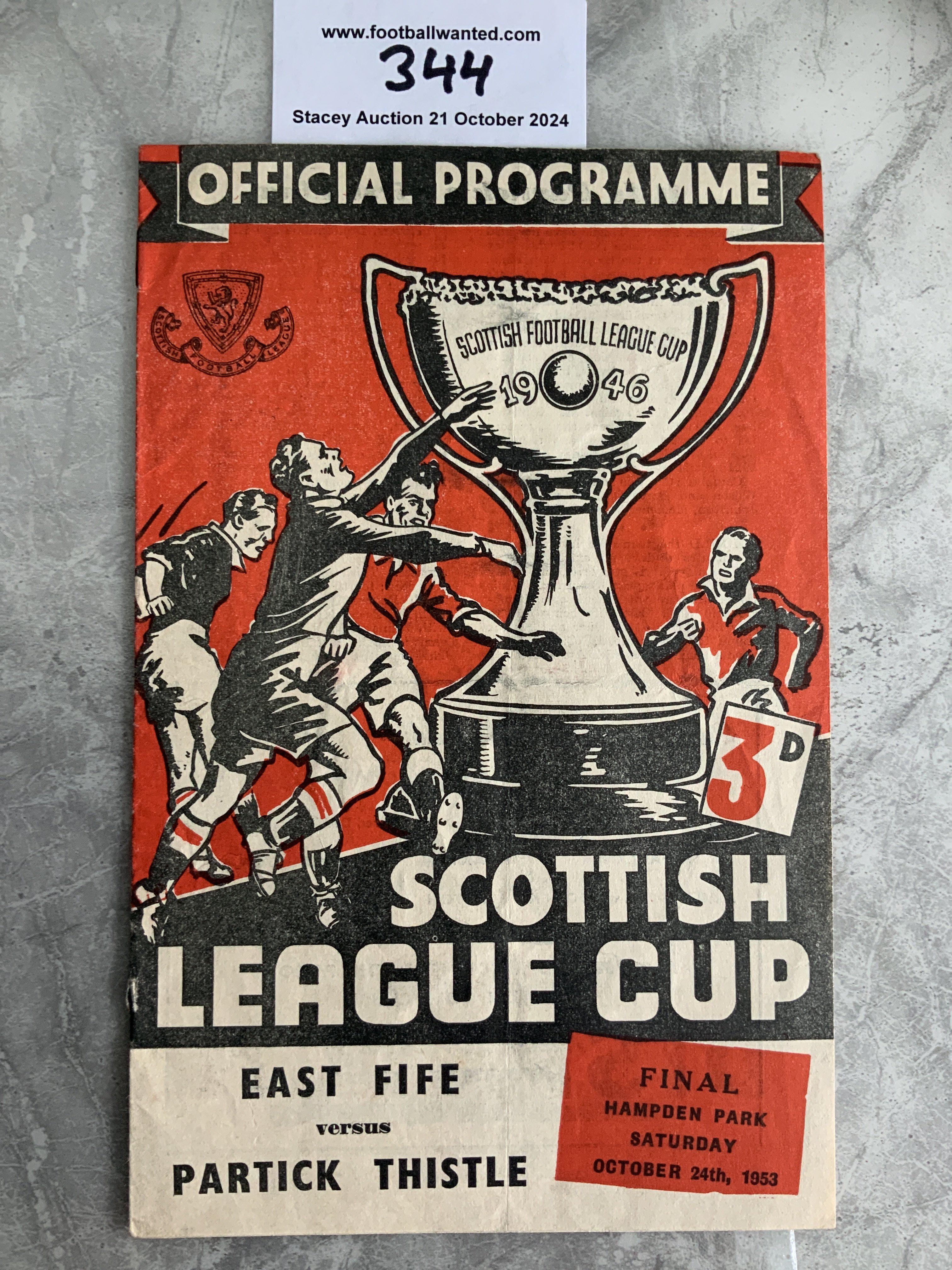 1953 Scottish League Cup Final Football Programme: East Fife v Partick Thistle played at Hampden Park. Very good condition with pencilled team changes.