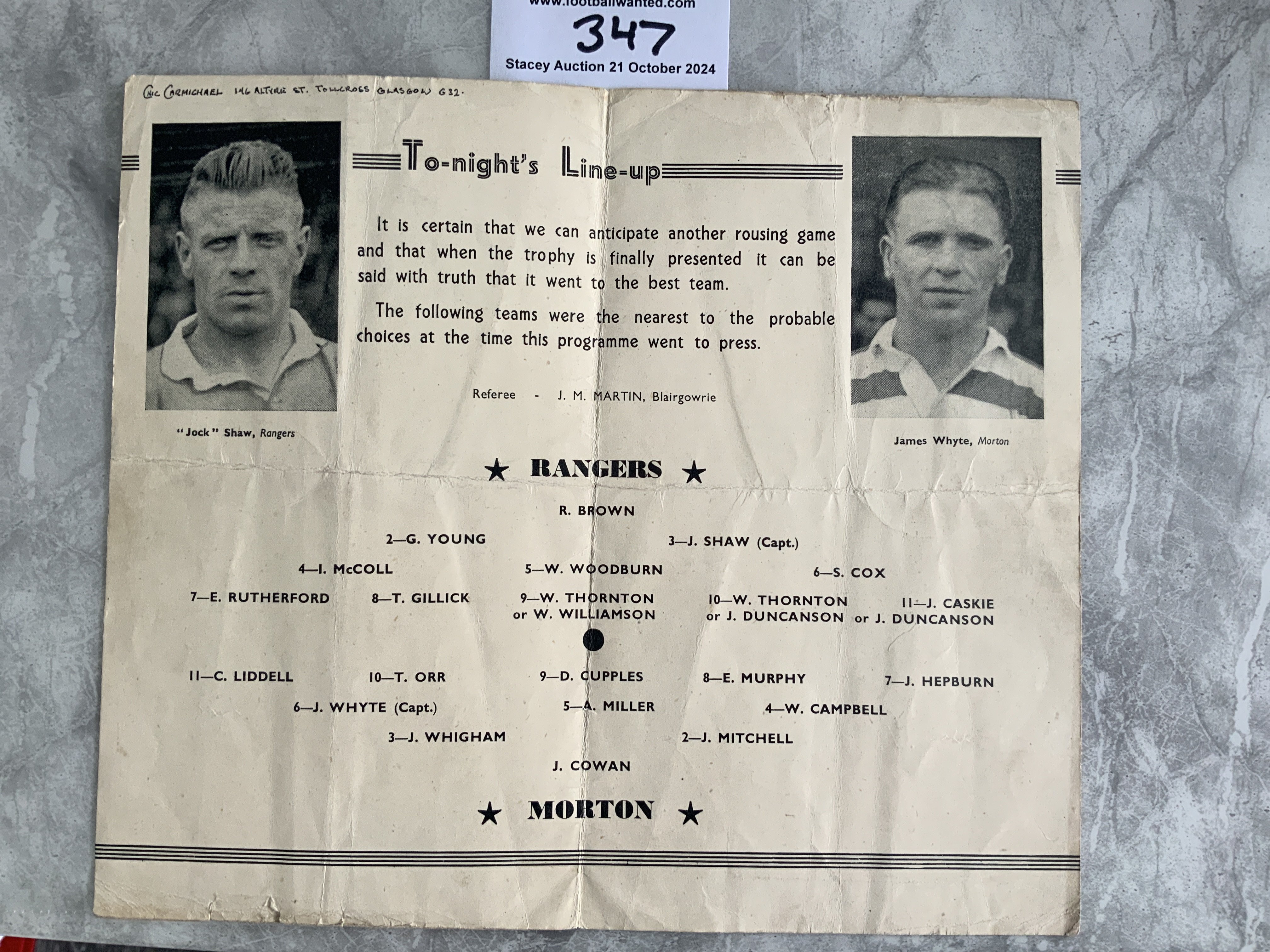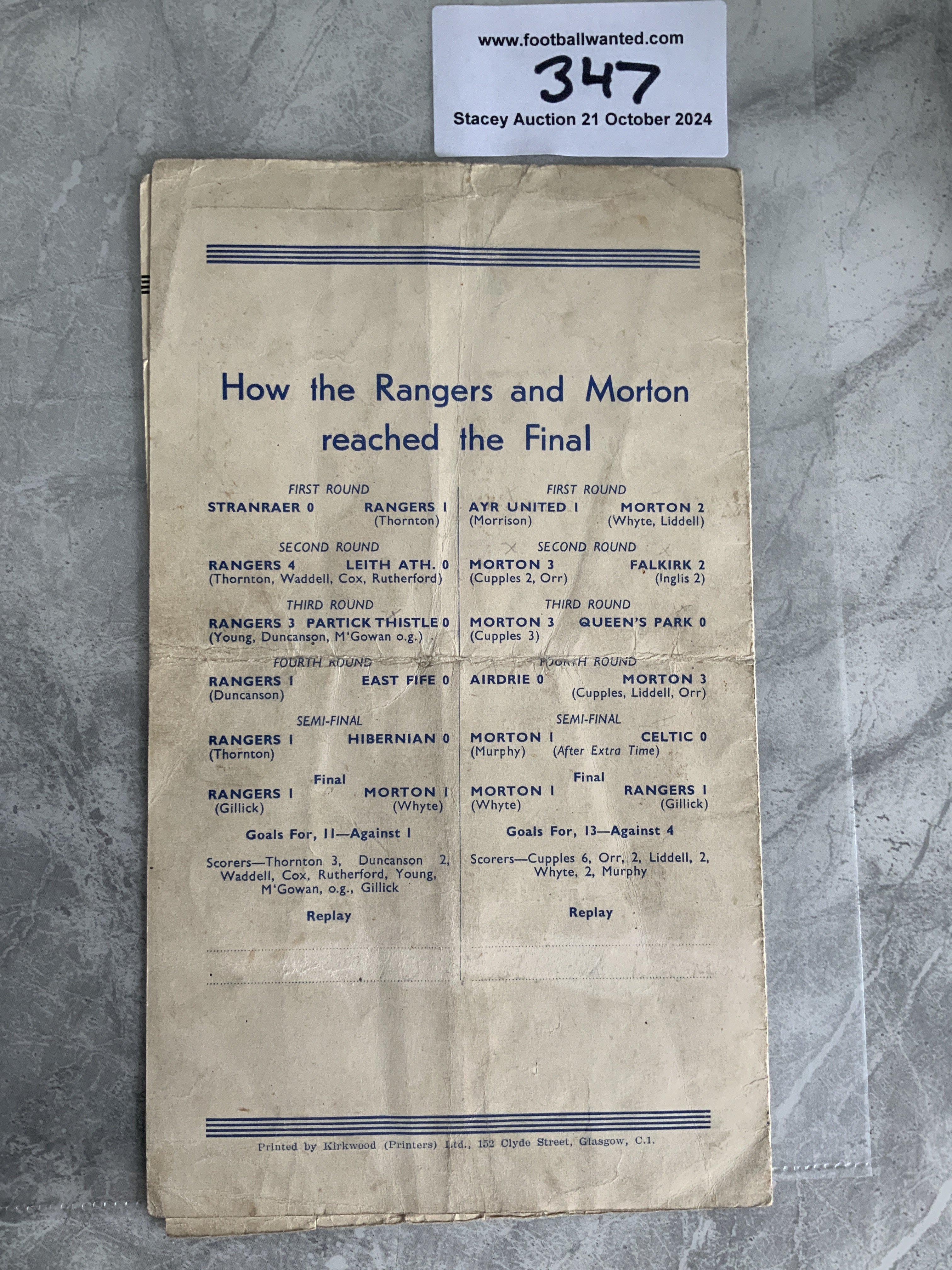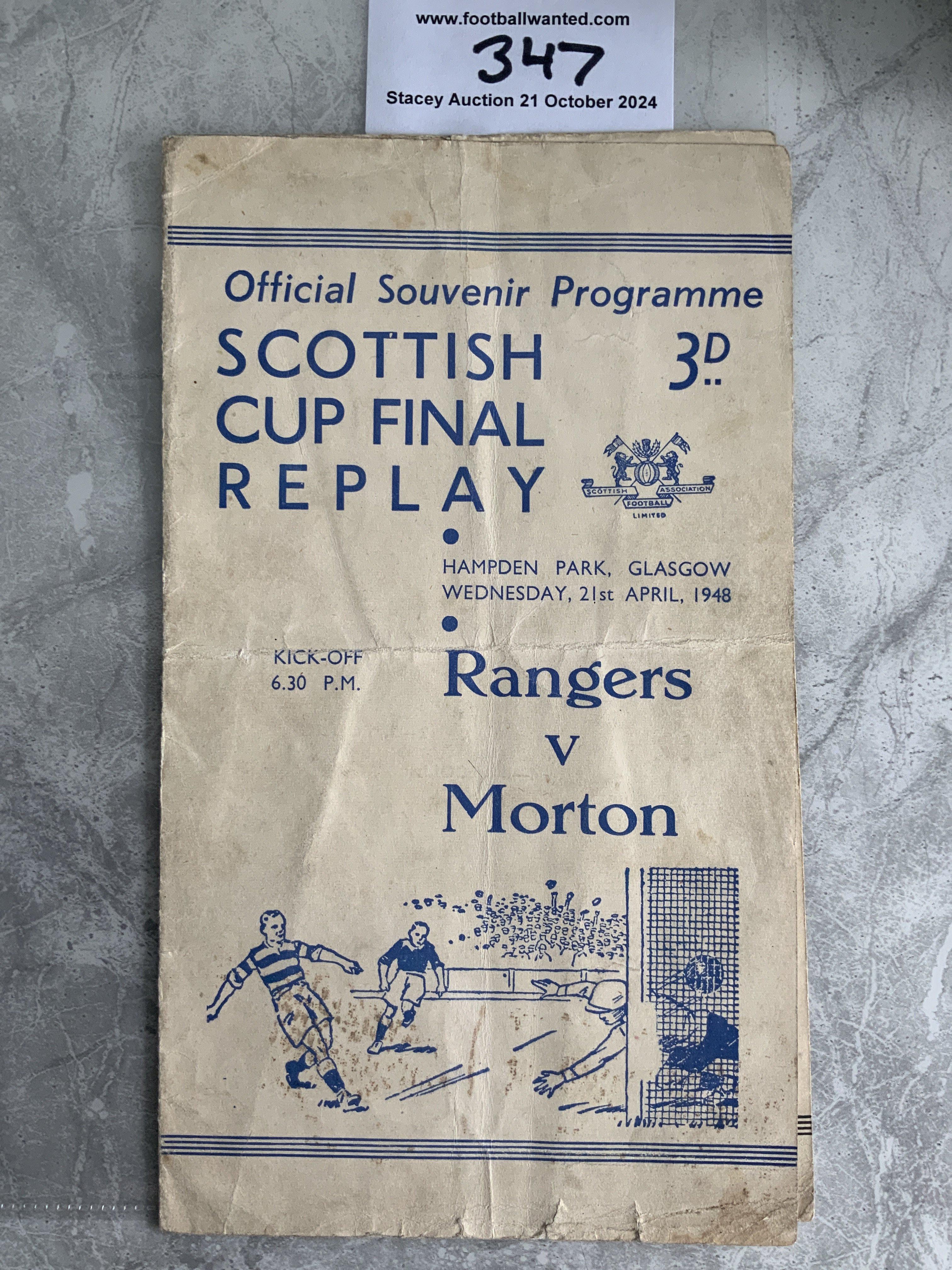 1948 Scottish Cup Final Replay Football Programme: Rangers v Morton played at Hampden Park. Fair/good condition with no team changes. Folding and small tears to bottom edge. Writing inside top left team page.