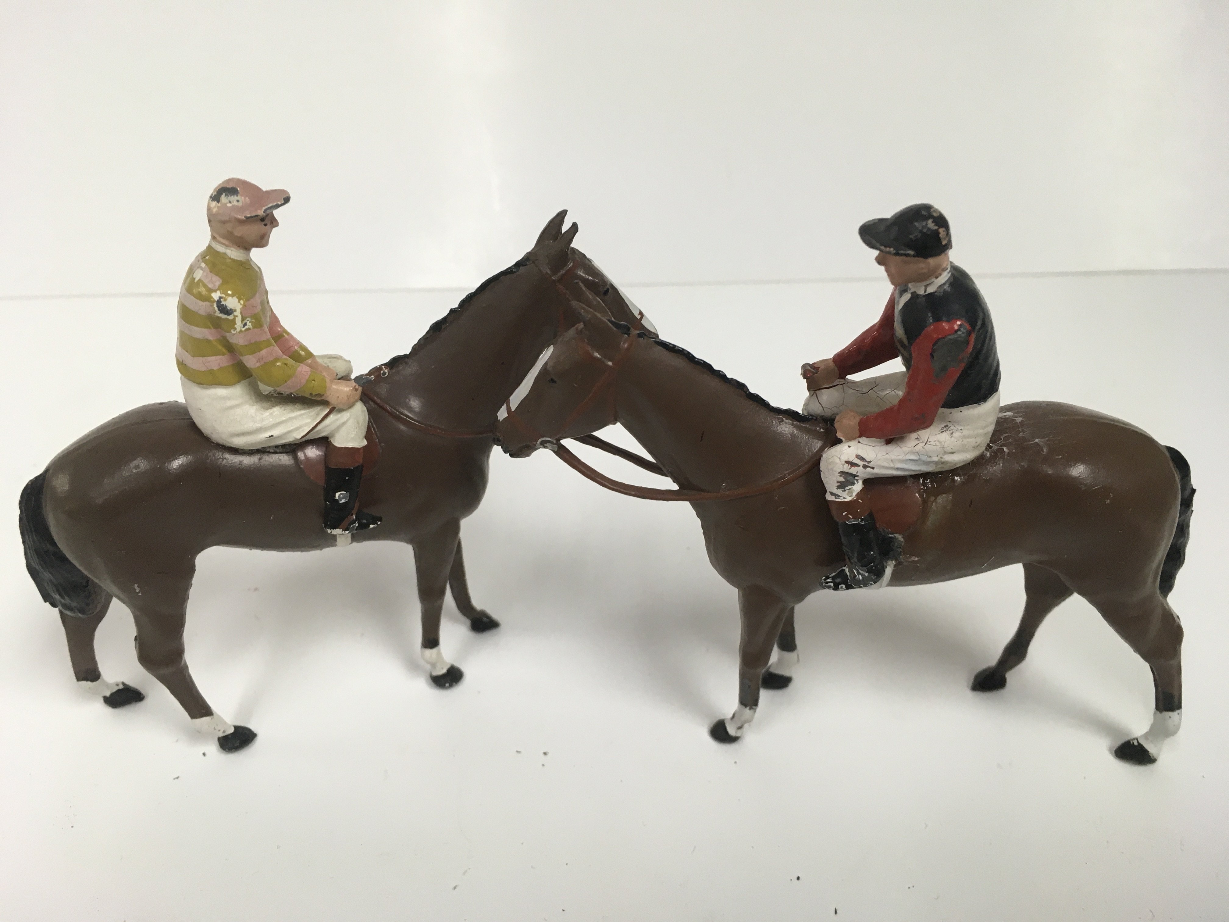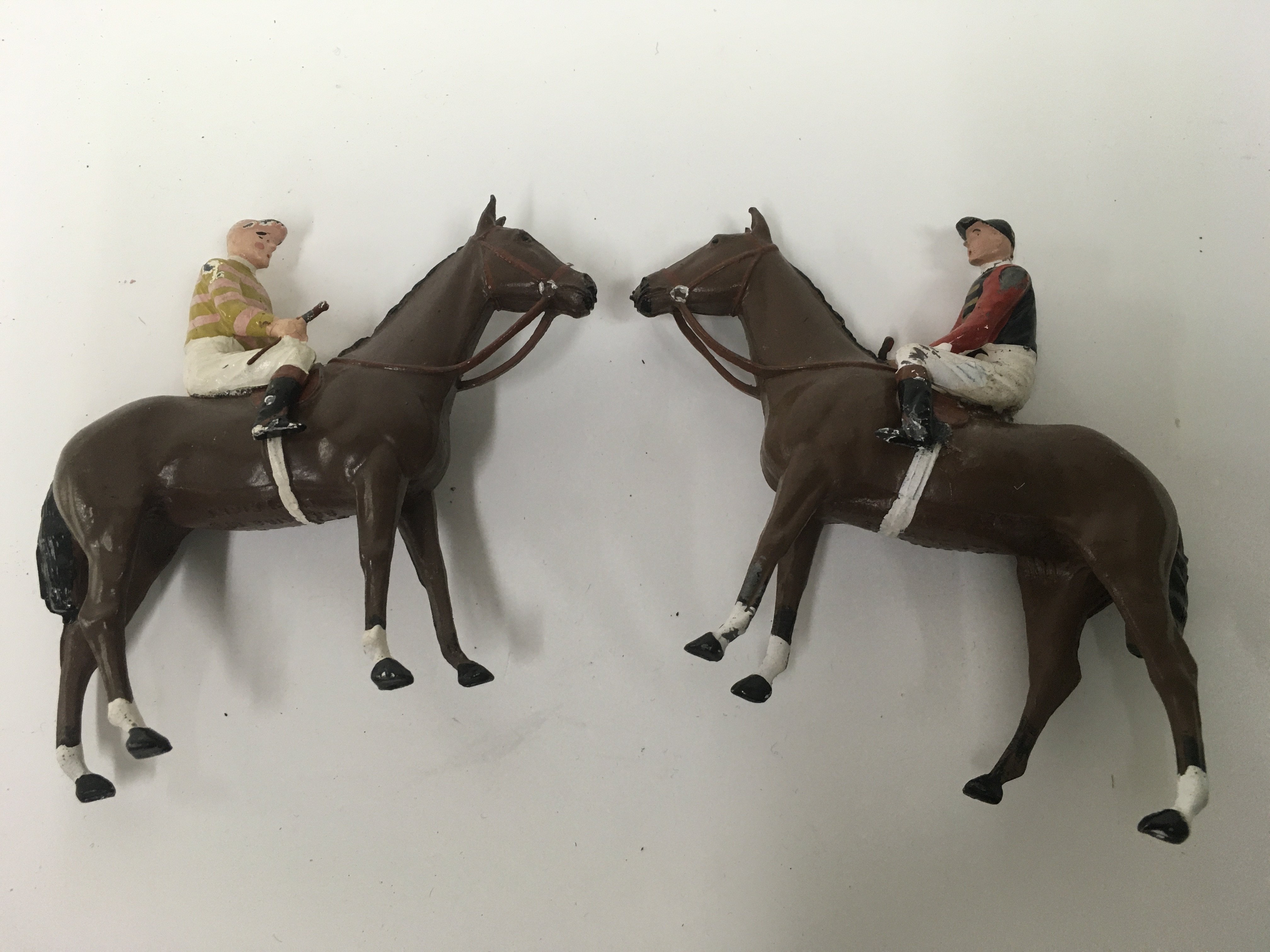 Two Britains lead racehorse with jockey up .