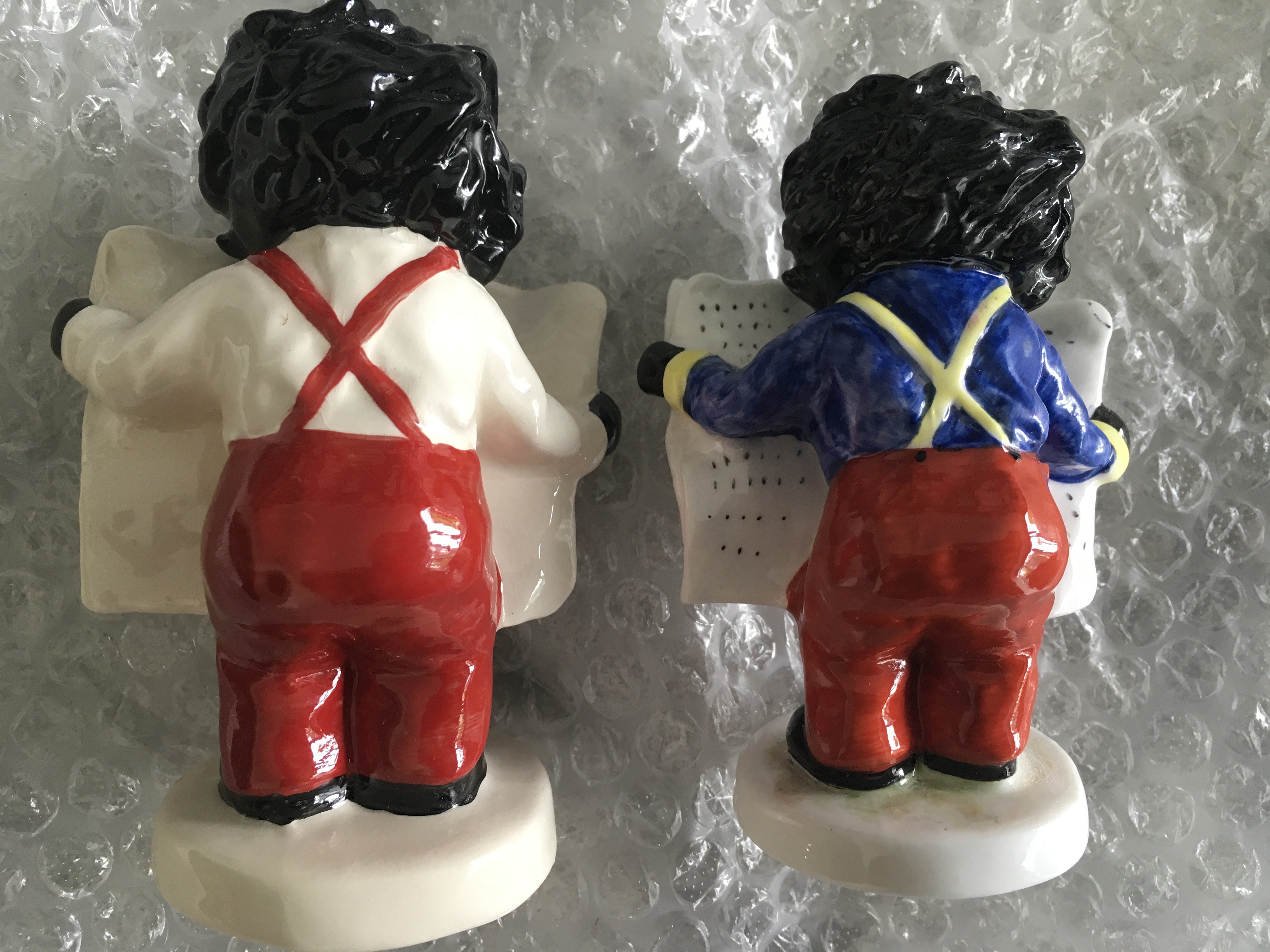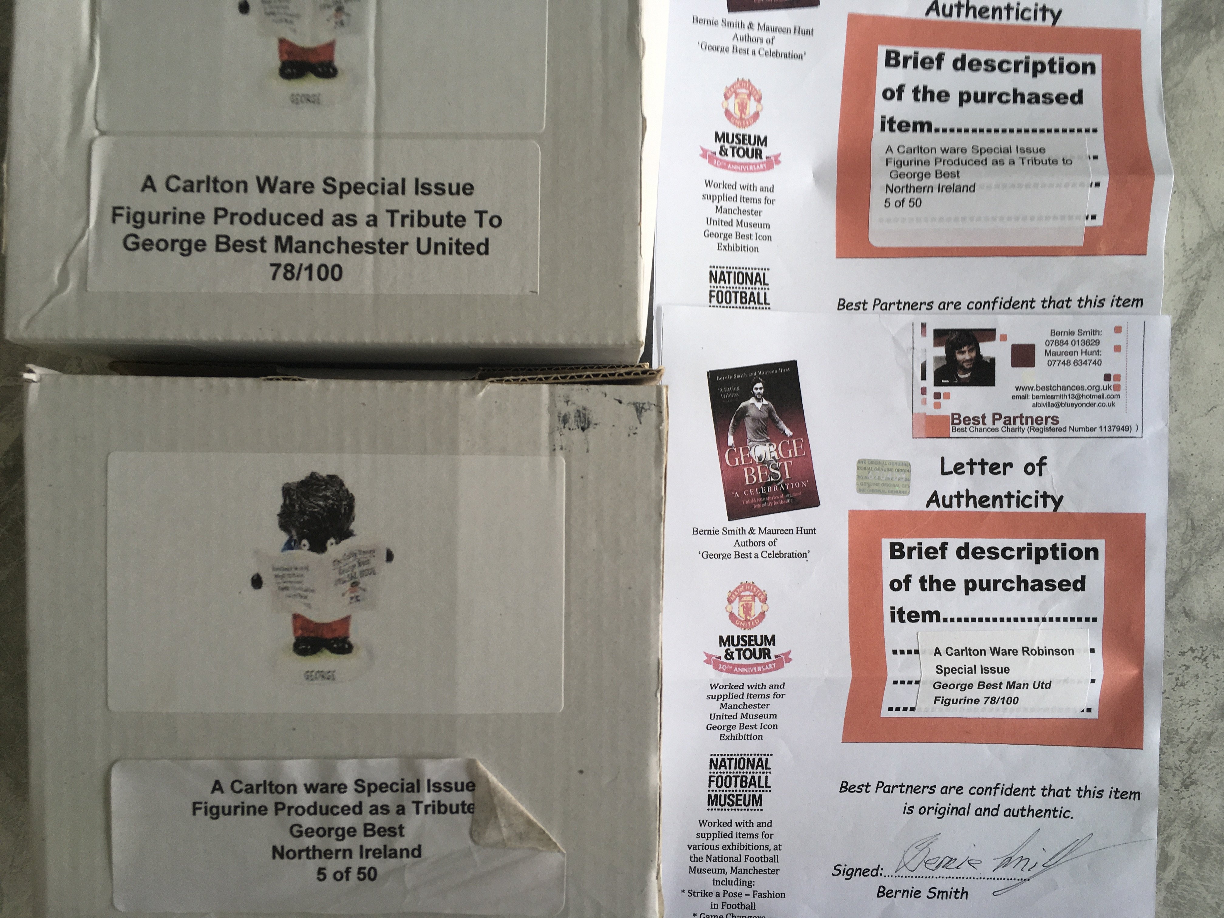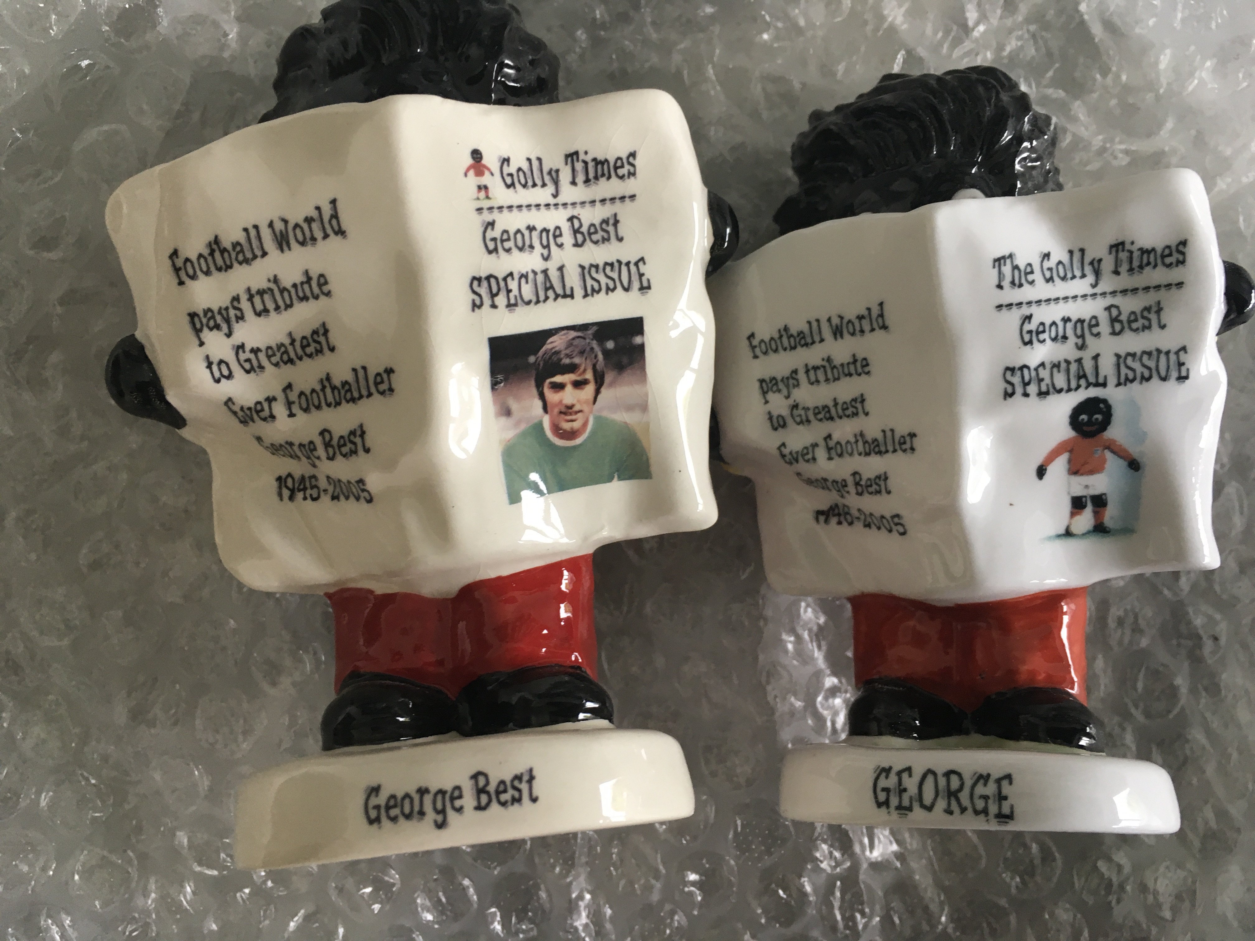 George Best Carlton Ware Football Figures: Two figures issued in 2005 as a tribute to him Ltd edition of 100 each issued by his agents. Depicts a Golly reading the Golly Times which has the tribute to George one in Northern Ireland kit the other in Manchester United kit. Certificates and boxes included. (2)