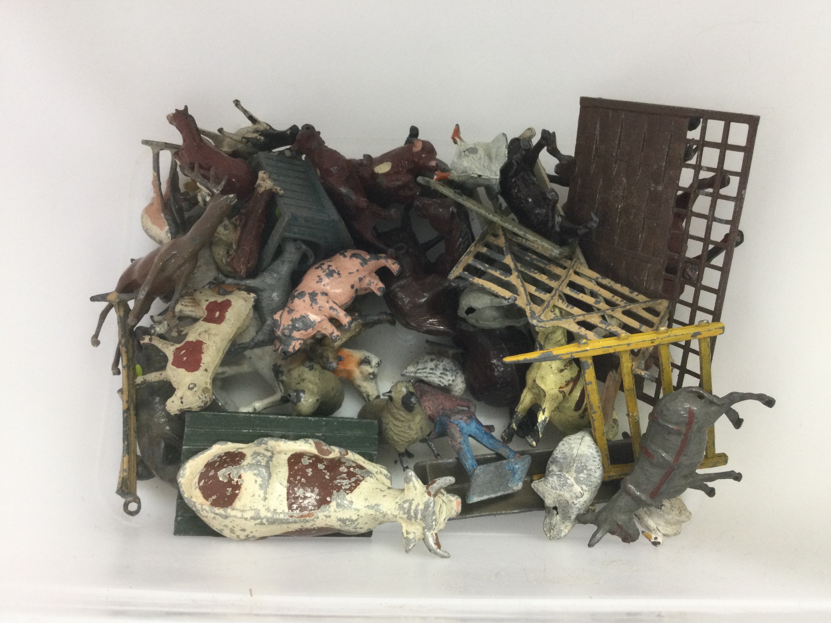 A tub of lead farm animal figures. Shipping category B.