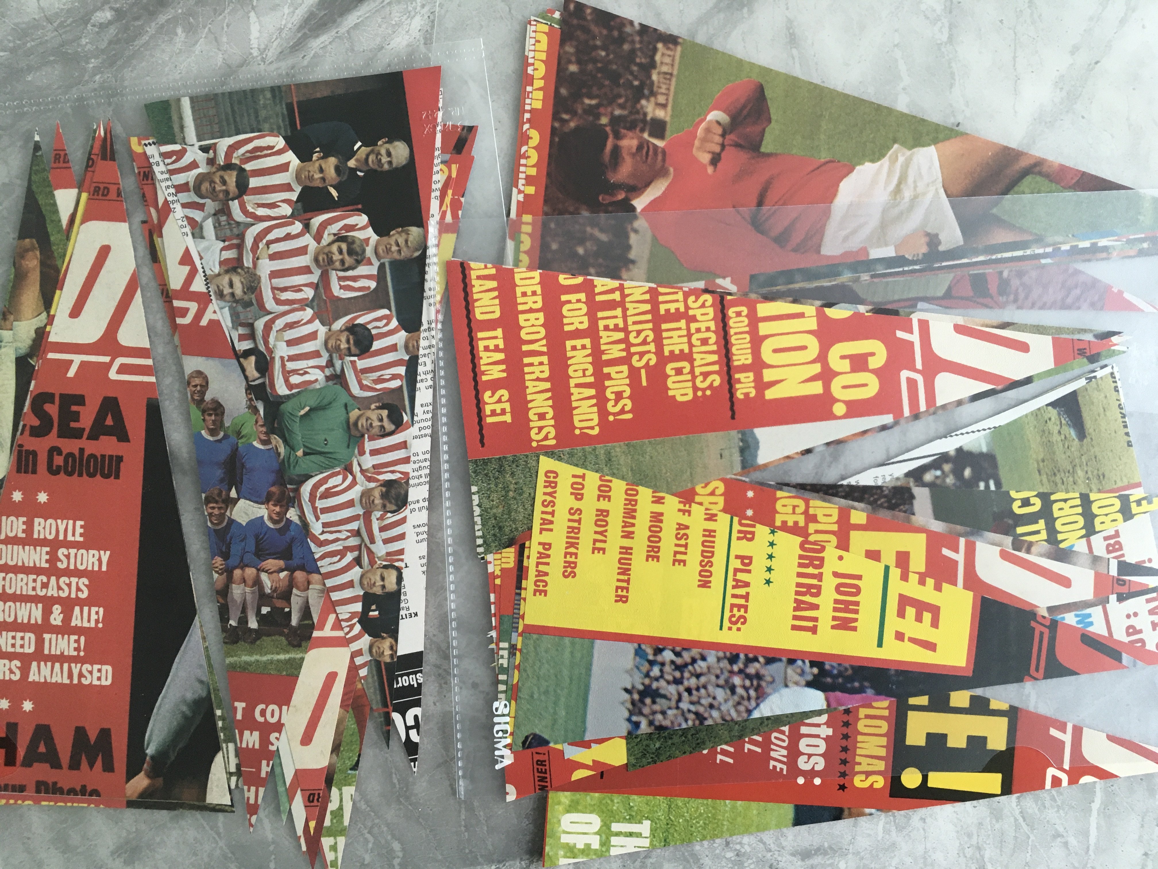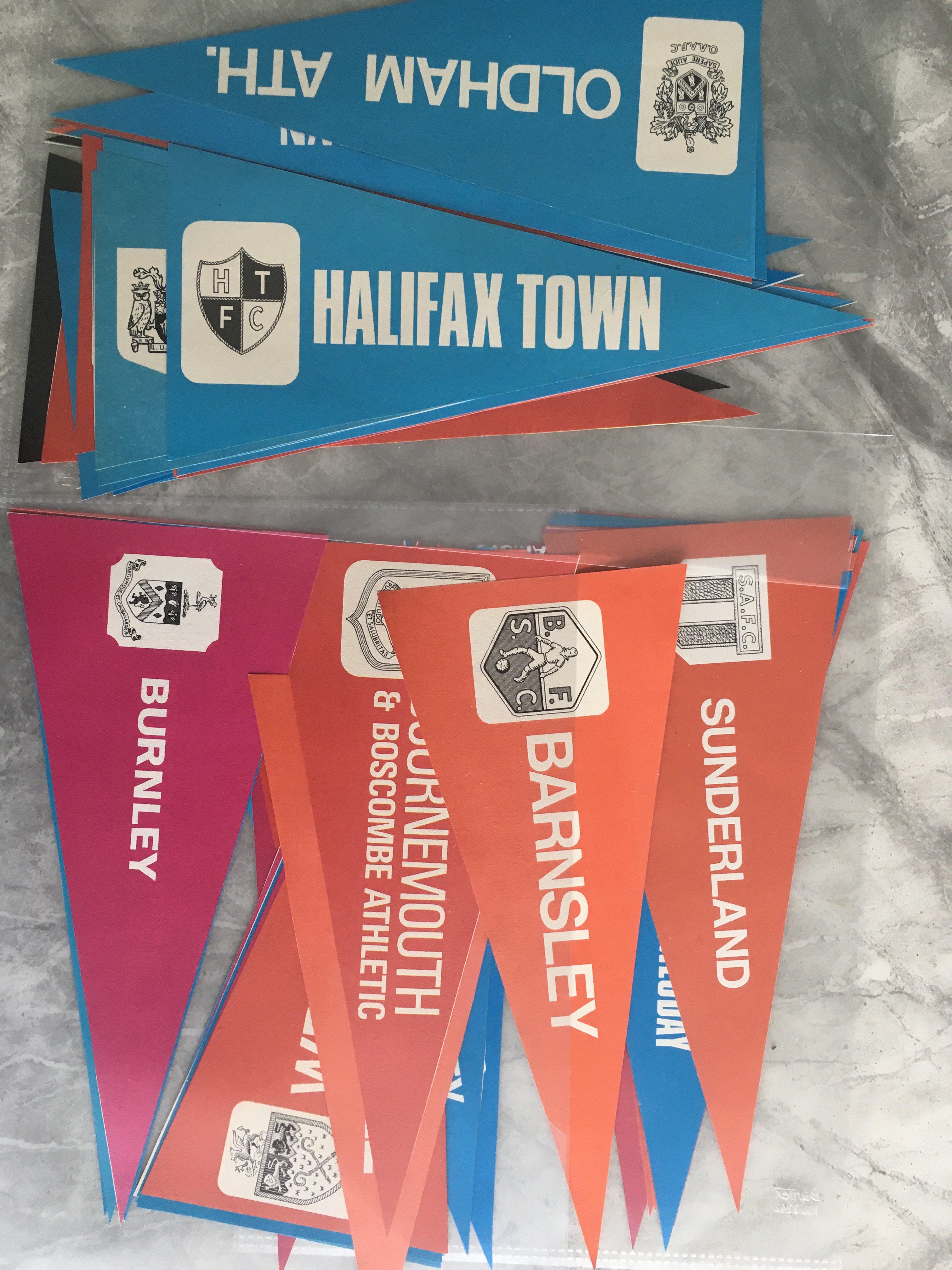 English Football Club Pennant Complete Collection: Cut out set of 66 which have been carefully cut out of magazine every week in the early 70s. (66)