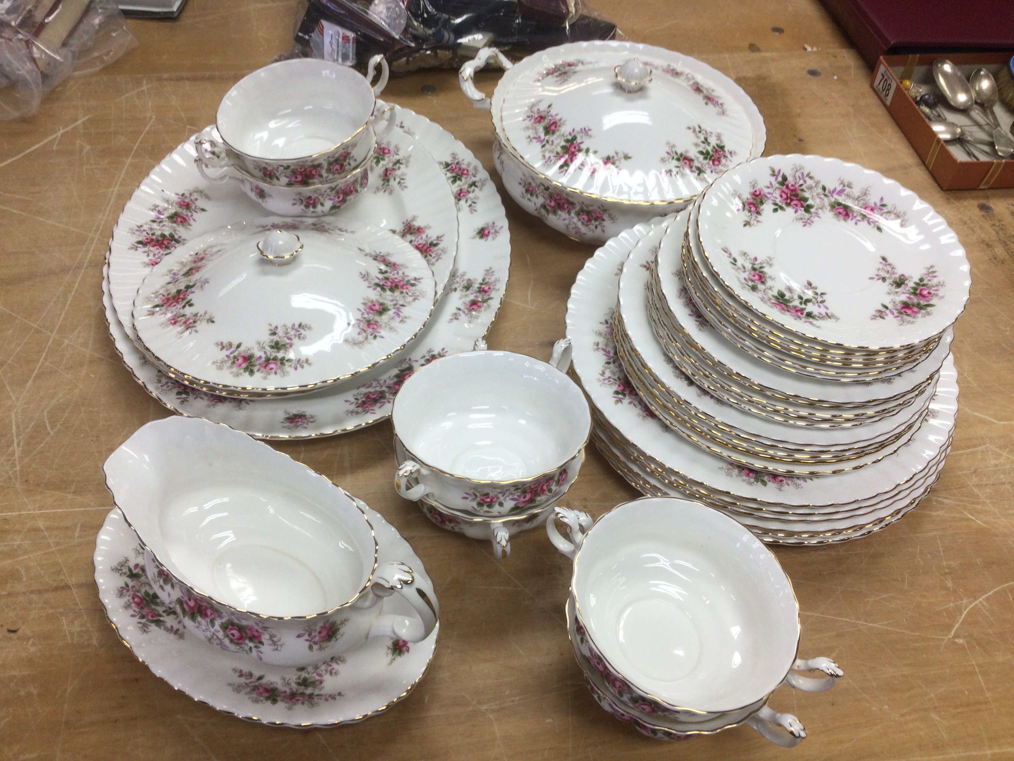 A Royal Albert dinner service in Lavender Rose pattern. Shipping category D.