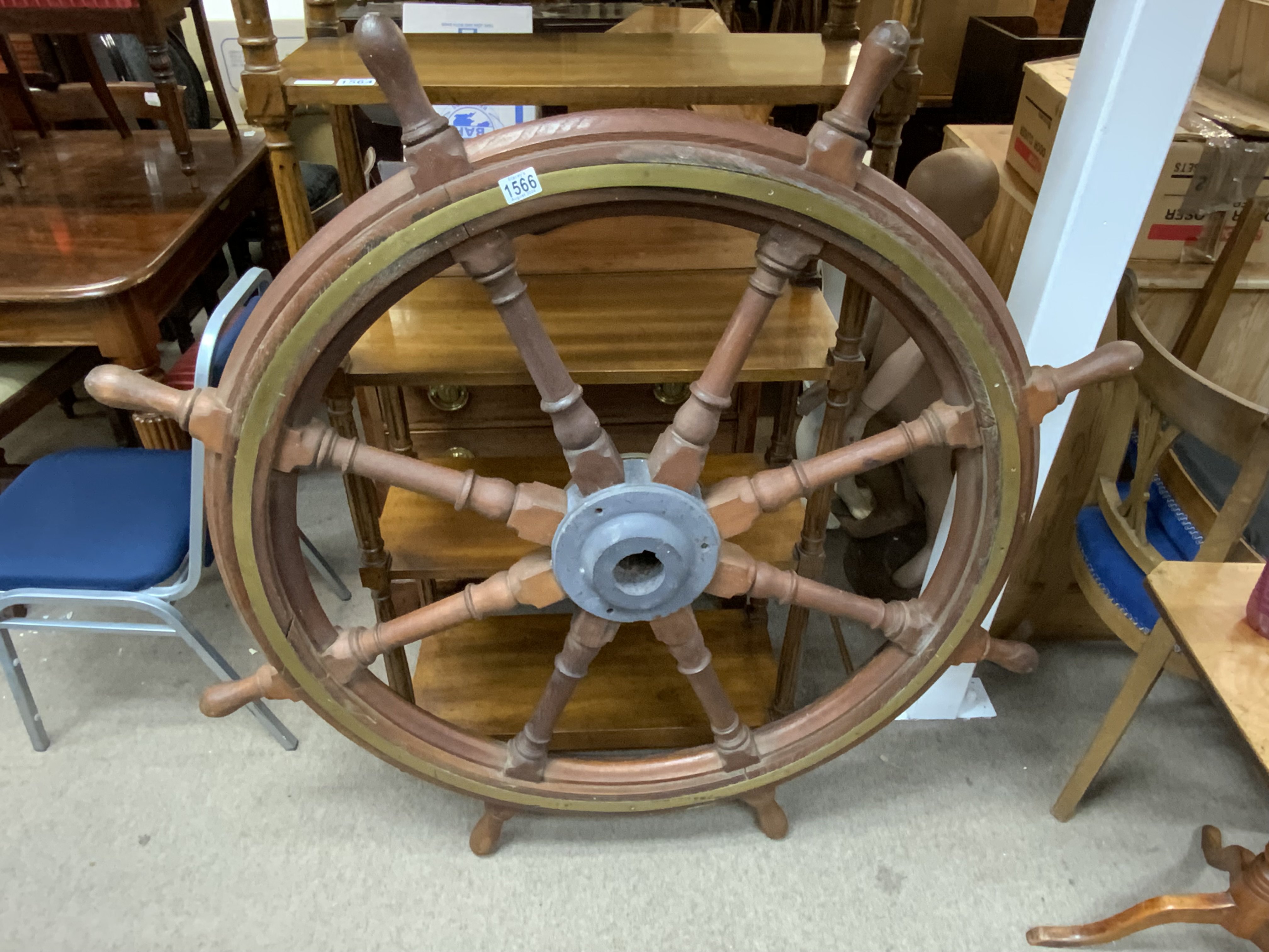 A large original ships wheel with a brass and cast iron centre shaft. 1370cm diameter.