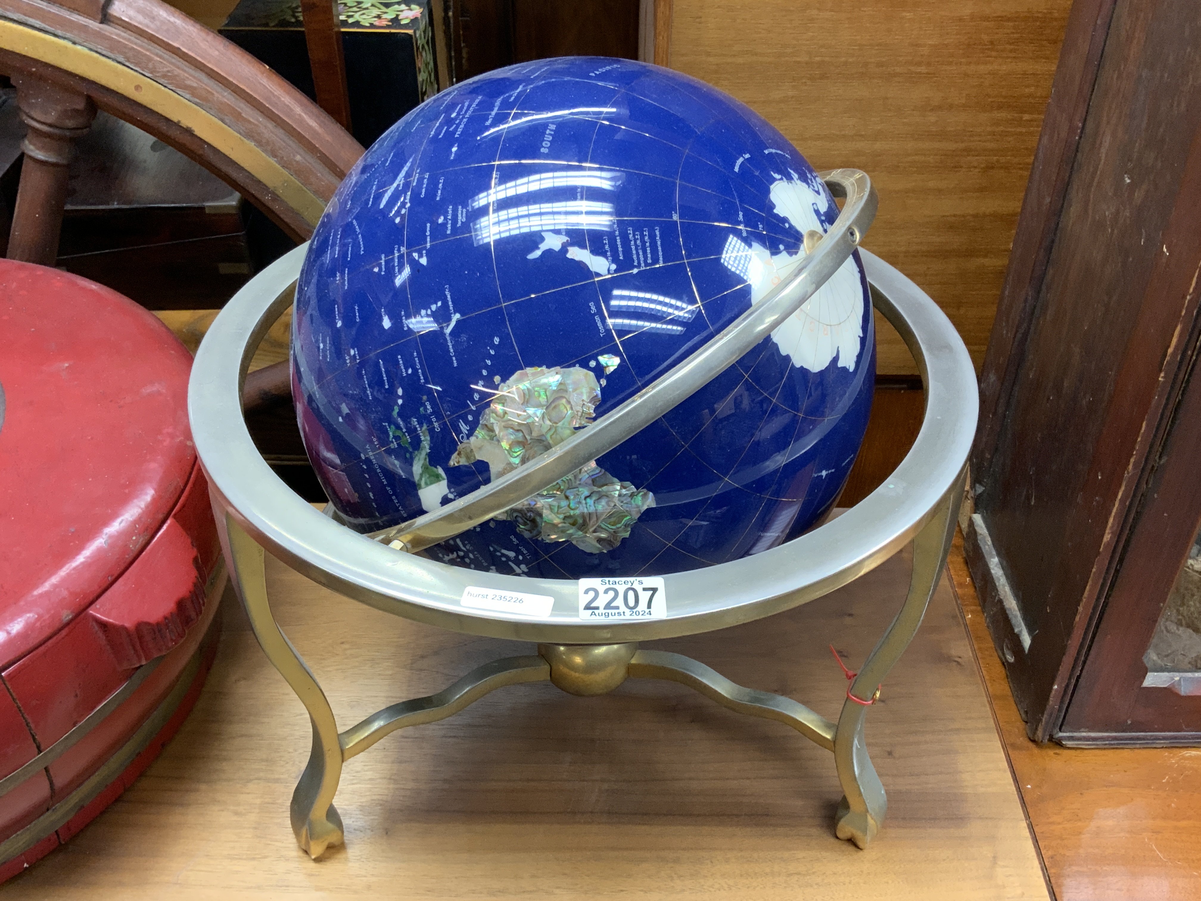 A modern terrestrial globe inlaid with semiprecious stones etc
