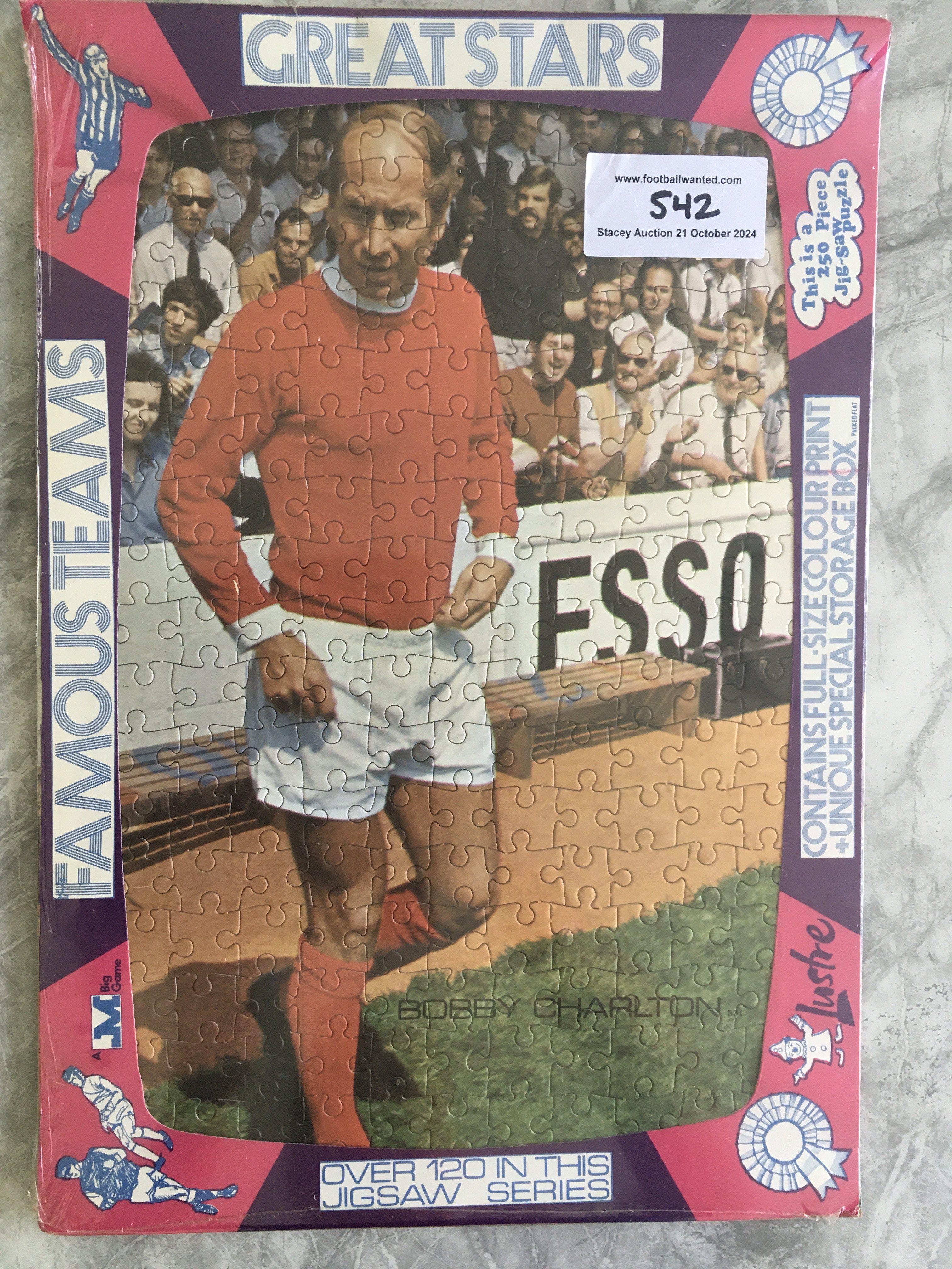 Bobby Charlton Manchester United + England Jigsaw Puzzle: Still sealed and in packaging featuring Bobby in Manchester United kit made in the 70s by Lustre. 250 pieces. Rare poster to rear as guide for making up.
