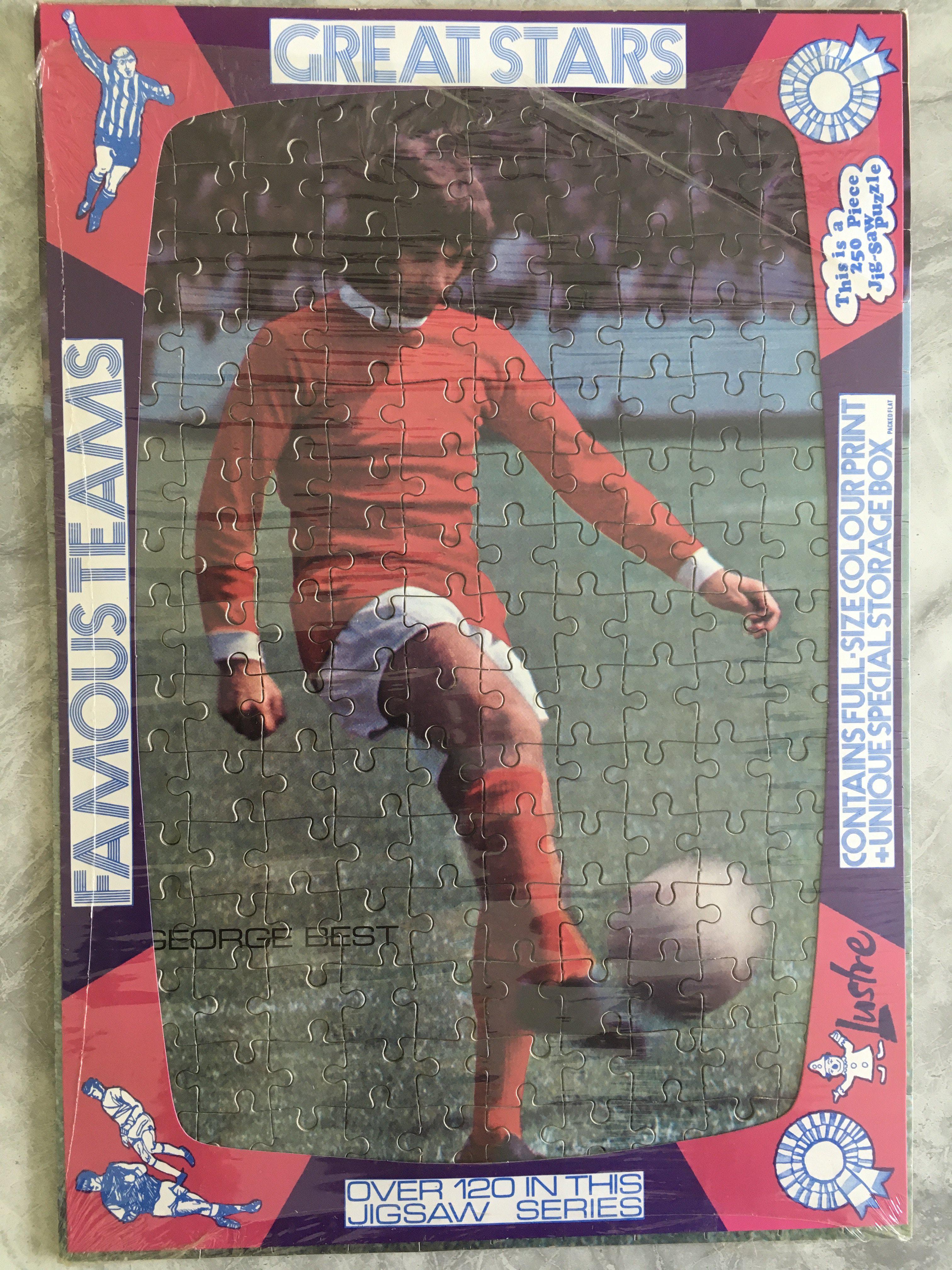 George Best Manchester United Jigsaw Puzzle: Still sealed and in packaging featuring Best in Manchester United kit made in the 70s by Lustre. 250 pieces. Rare poster to rear as guide for making up.